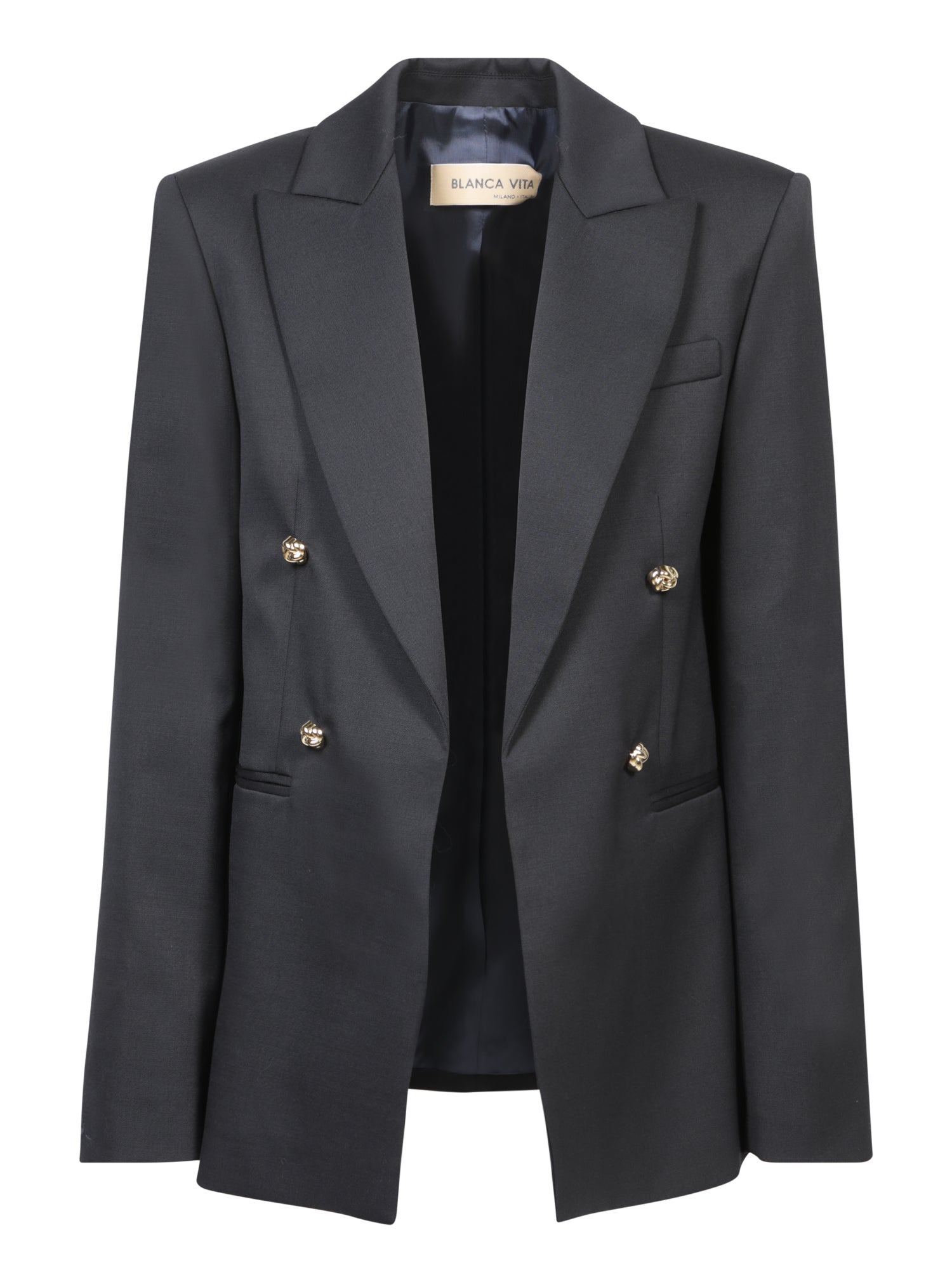 Blanca Vita's blue stretch wool canvas jacket delivers a touch of elegance and practicality. Featuring distinctive engraved buttons and a classic silhouette, this jacket perfectly suits office looks and formal occasions.