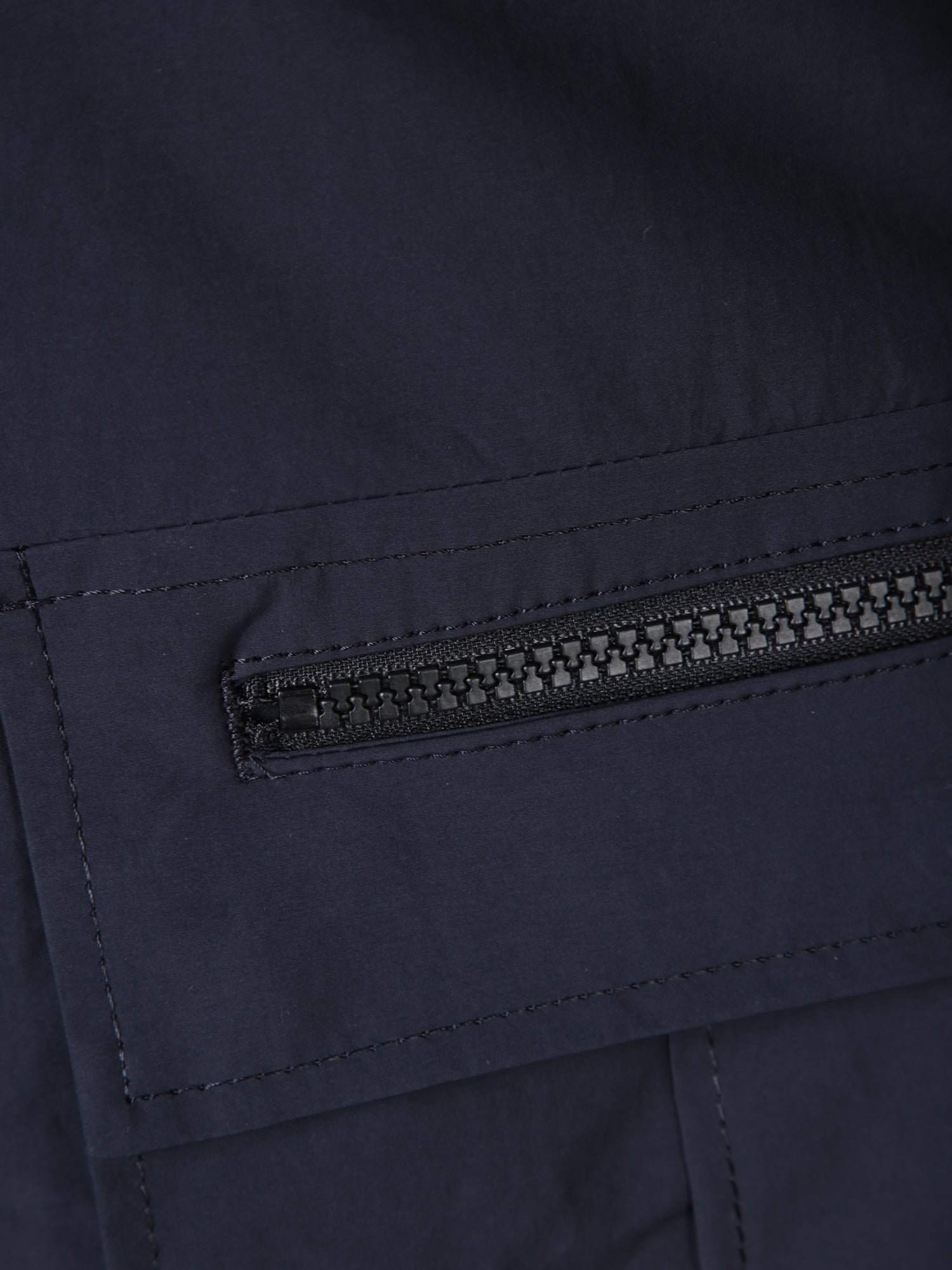 Blue taffeta bermuda shorts featuring an integrated belt with a silver buckle, zippered side pockets, and lace details at the hem.