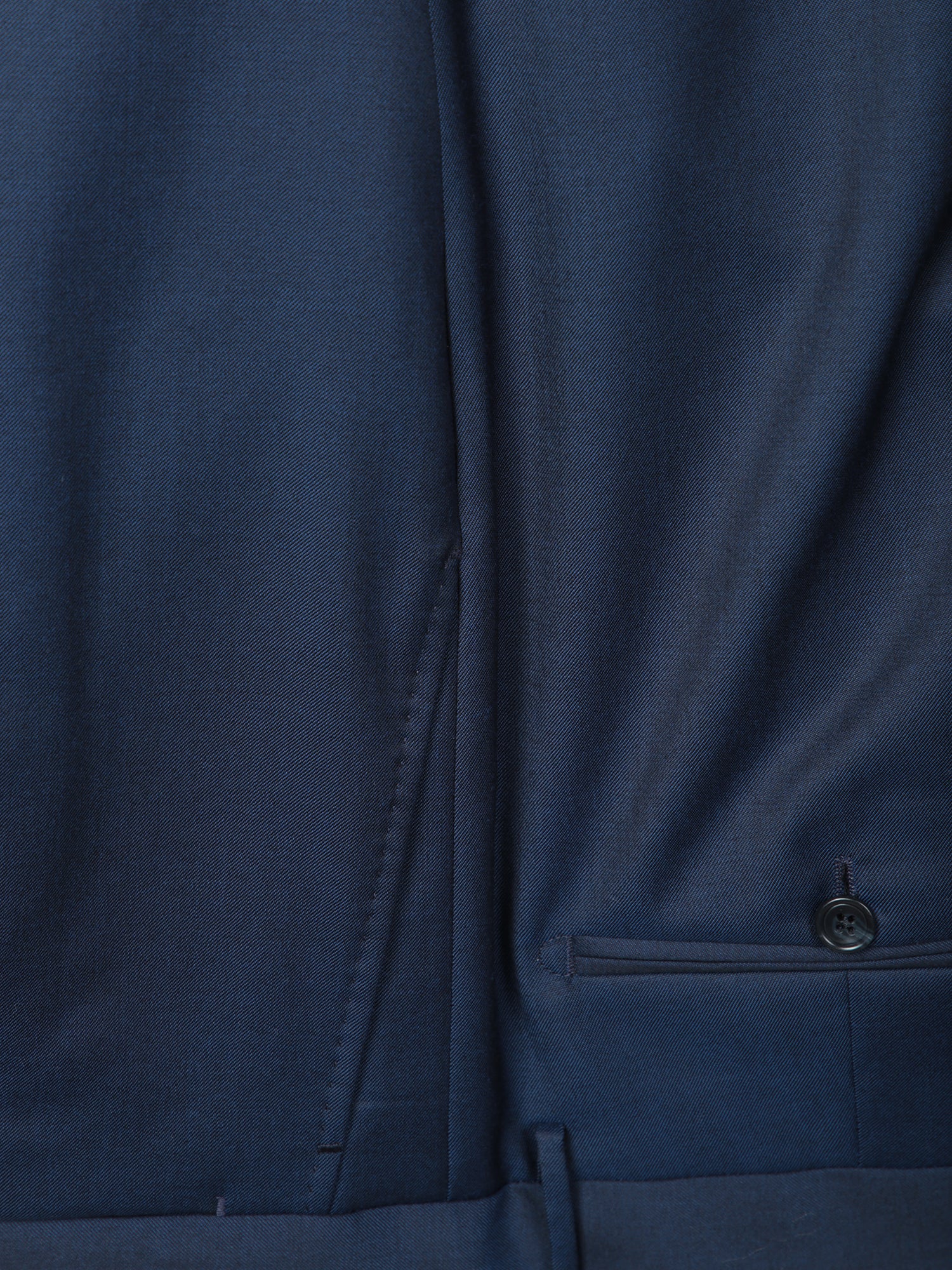 Elegant Tagliatore solid blue suit, perfect for formal occasions. The jacket is embellished with a discreet monogram on the lapel and custom buttons, offering an exclusive and distinctive touch.