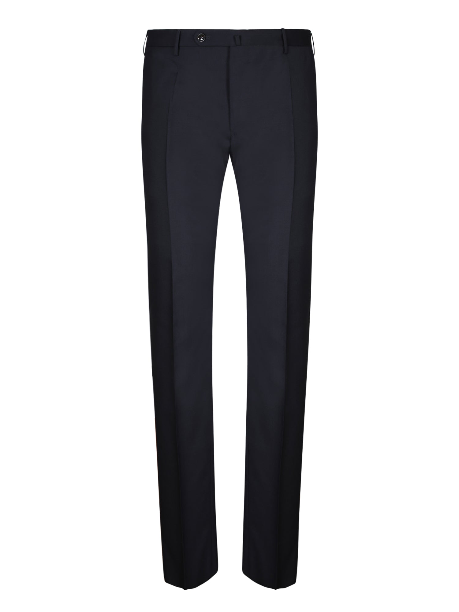 Straight leg design. Regular waist with belt loops. Front zip and button closure.