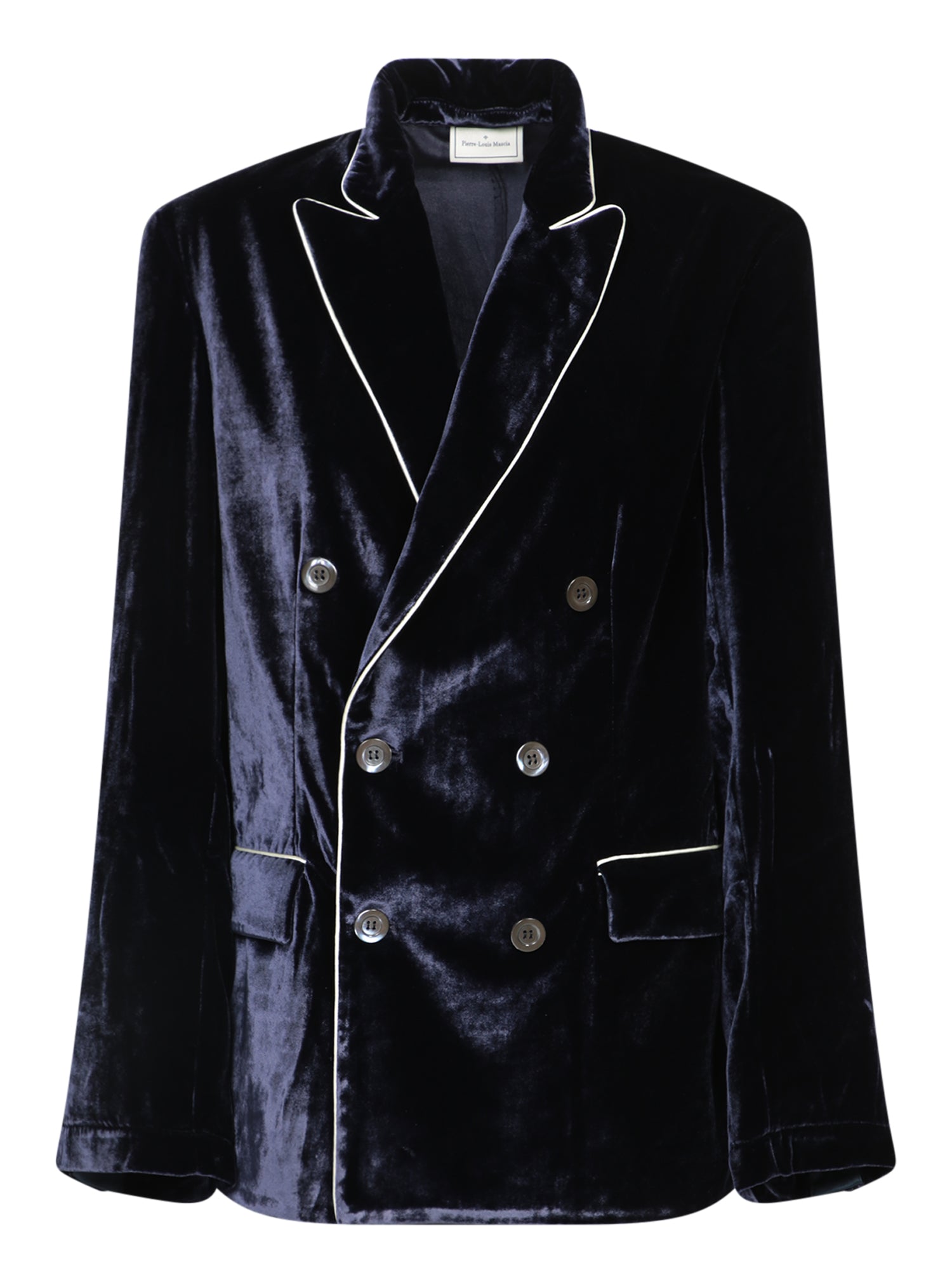 Elegant dark blue velvet jacket by Pierre-Louis Mascia. Features a double-breasted design with white contrasting trims, perfect for formal occasions and gala evenings.