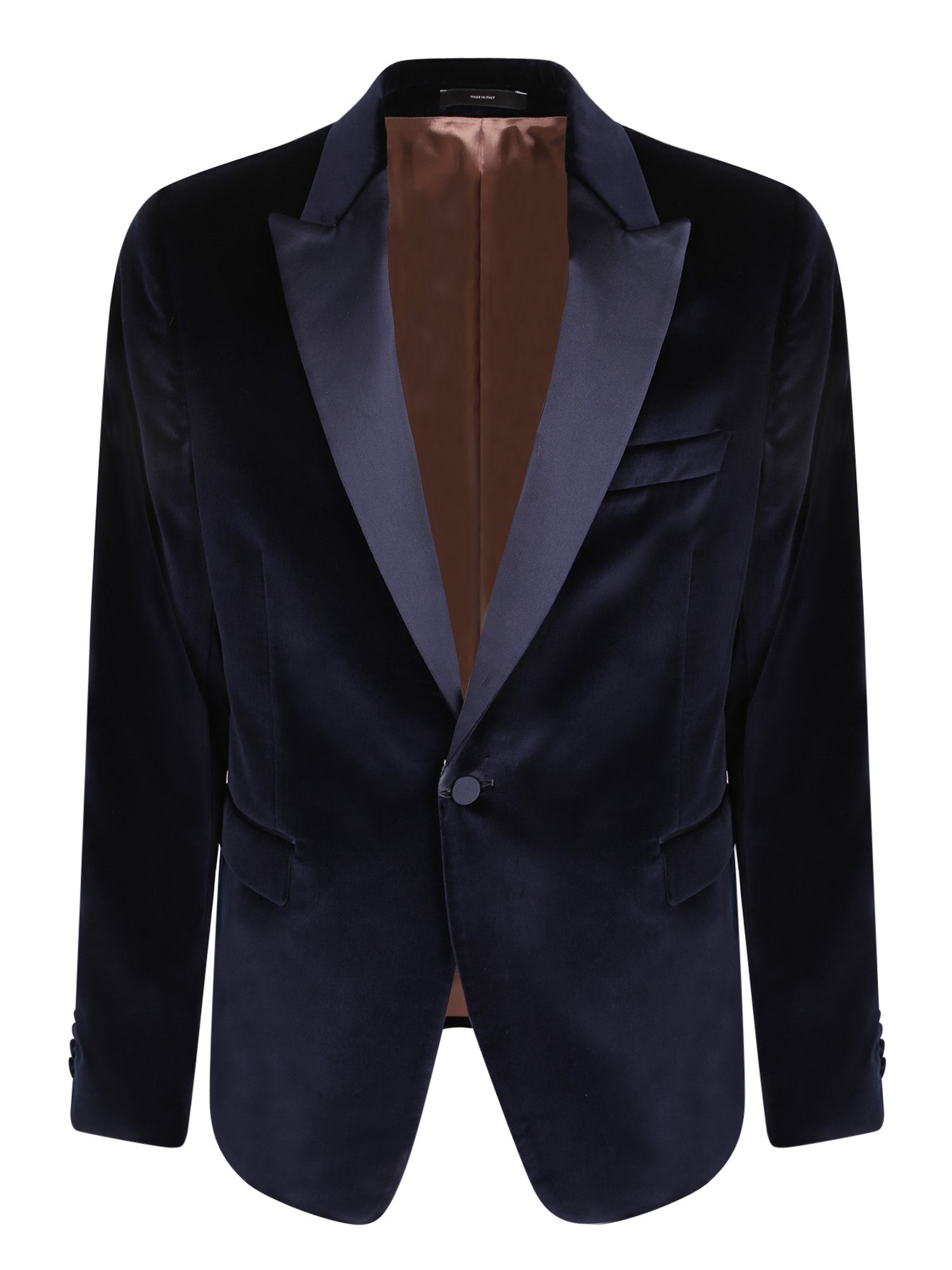 Elegant jacket. Blue velvet fabric. Peak lapel. Single-breasted closure. Covered buttons.