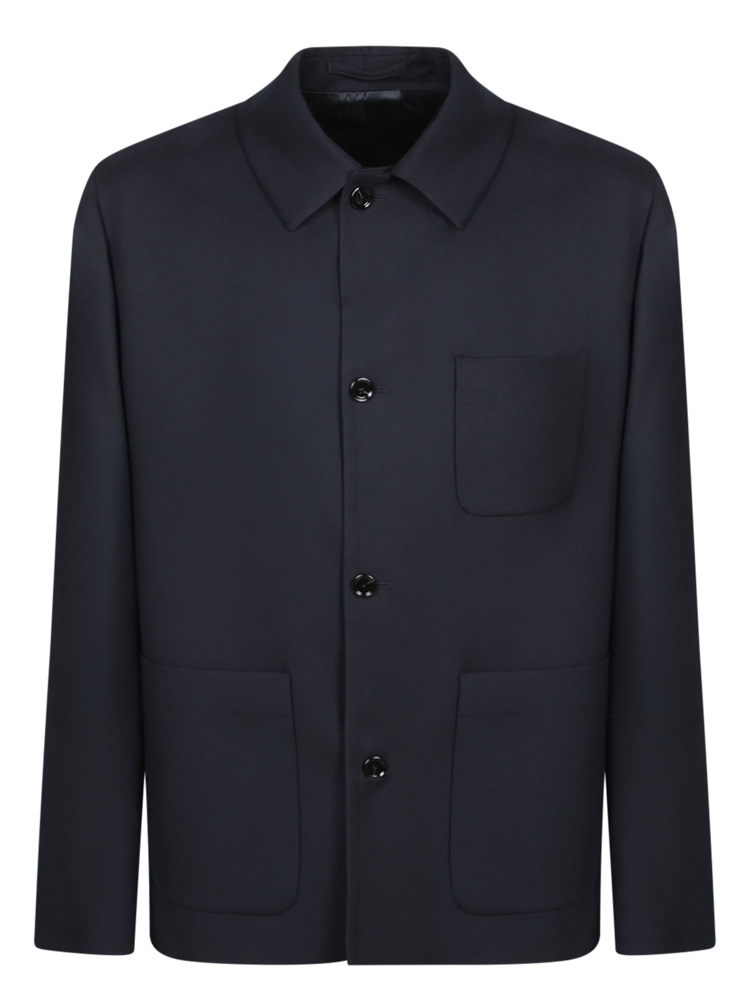Wool overshirt with a shirt collar and button front closure. Features a chest pocket and side patch pockets.