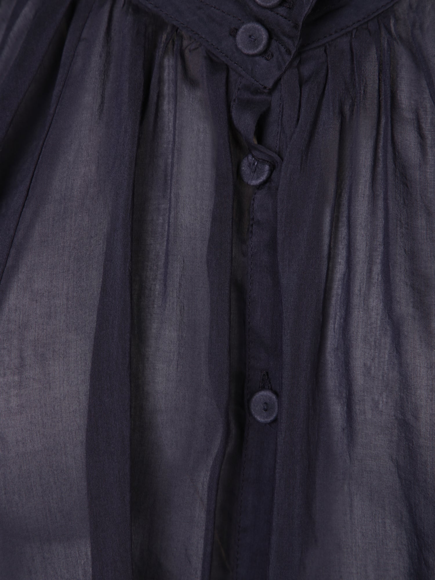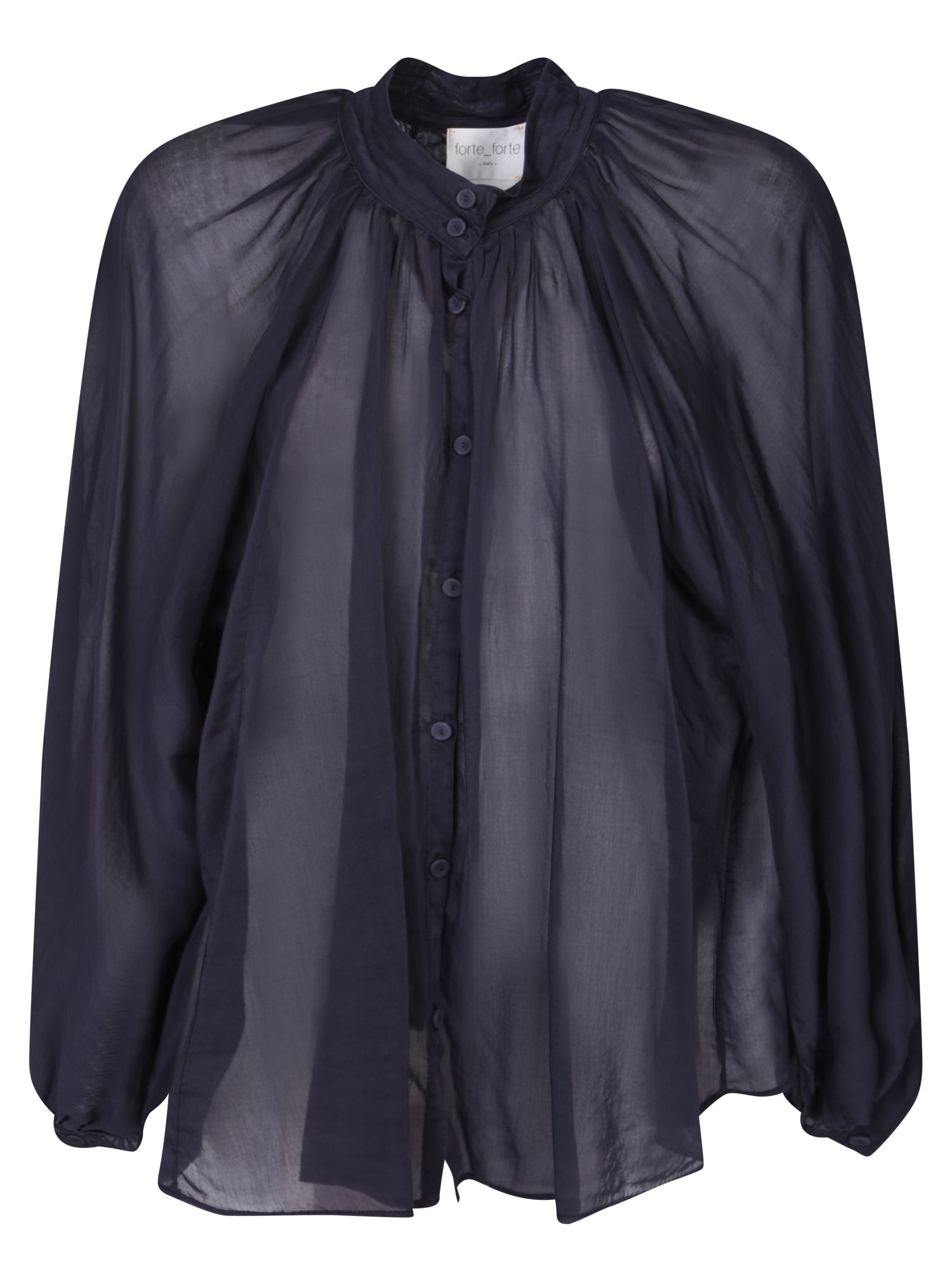 Stand-up collar. Loose sleeves. Front button fastening. Tonal stitching.