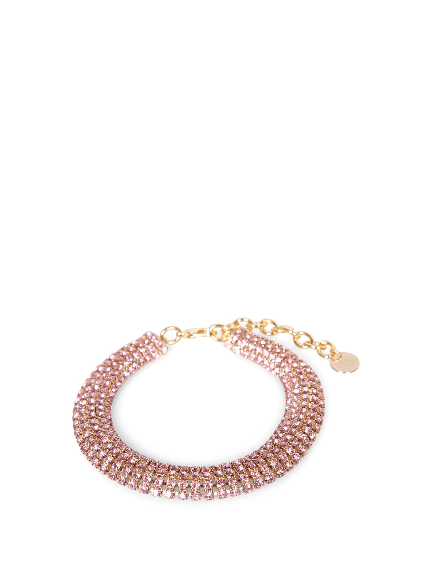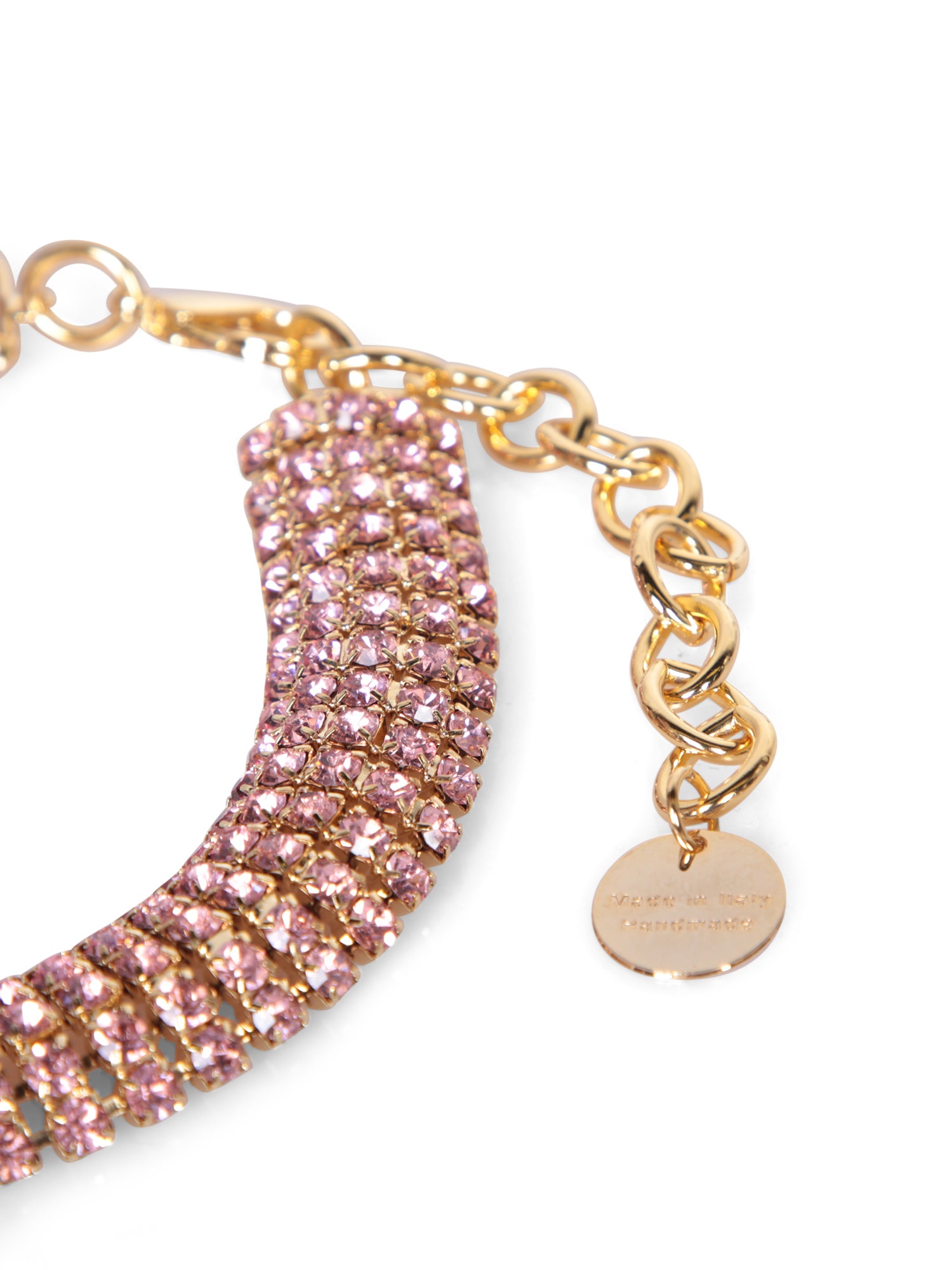 This Boldy necklace by Silvia Gnechhi, crafted with a luxurious rose gold alloy, is adorned with sparkling pink crystals that catch the light with every movement, adding a touch of sophisticated glamour to any outfit.
