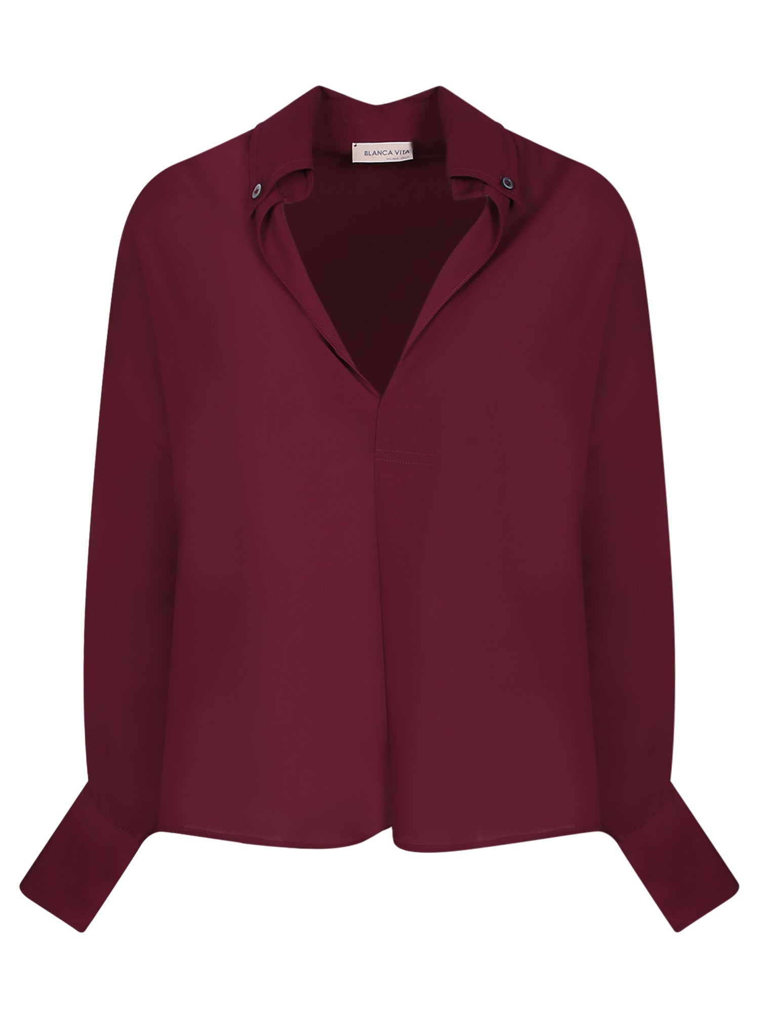 Elegant shirt with a classic collar and long sleeves. Features a hidden button front closure.
