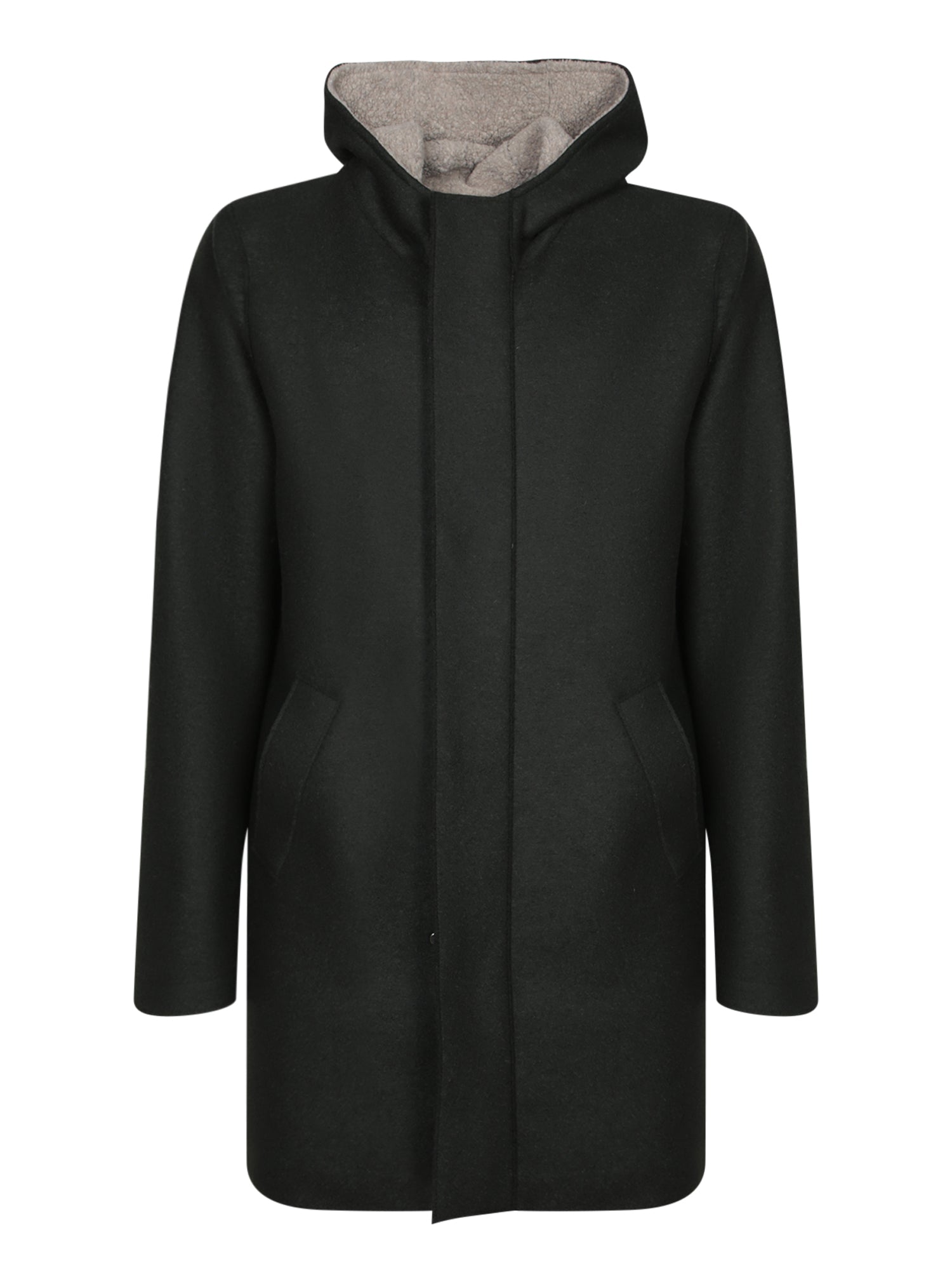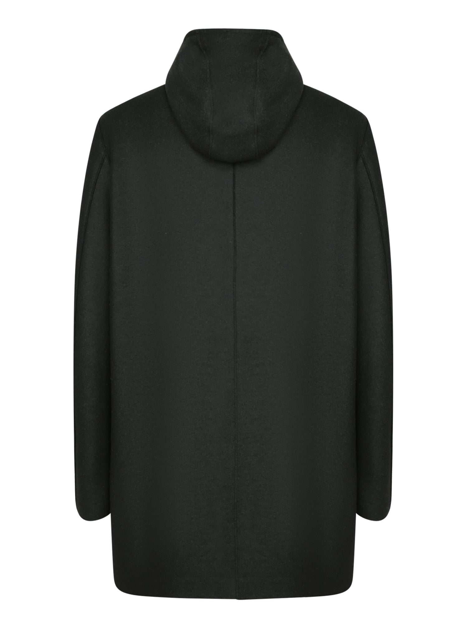 Bouclé wool parka with concealed magnetic closure. Integrated side pockets and raised collar.