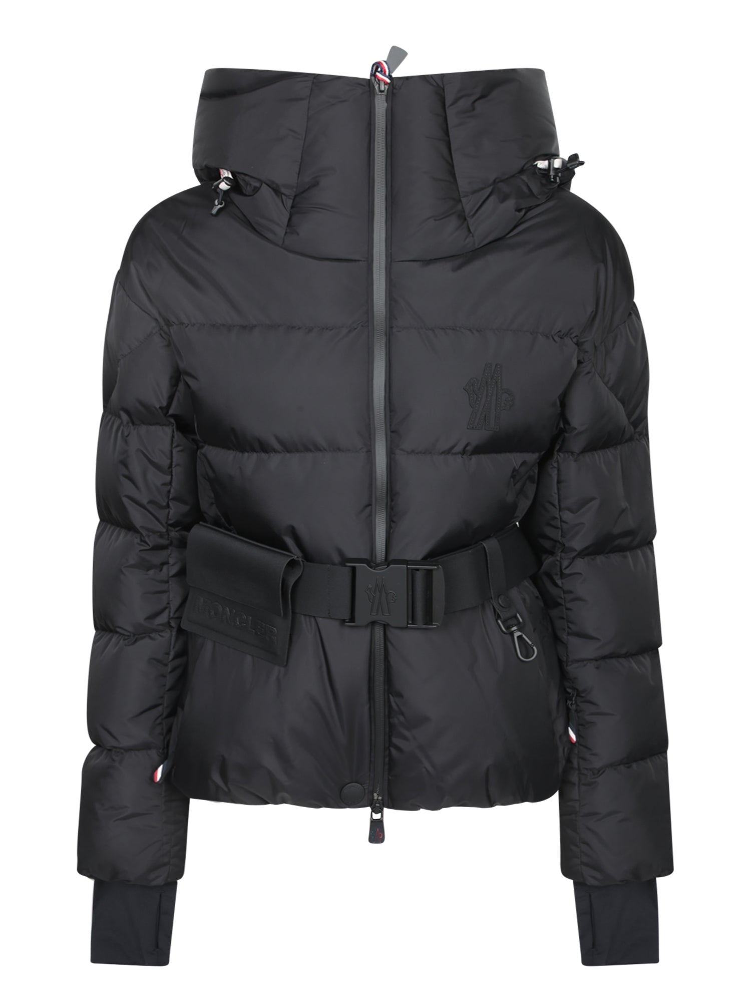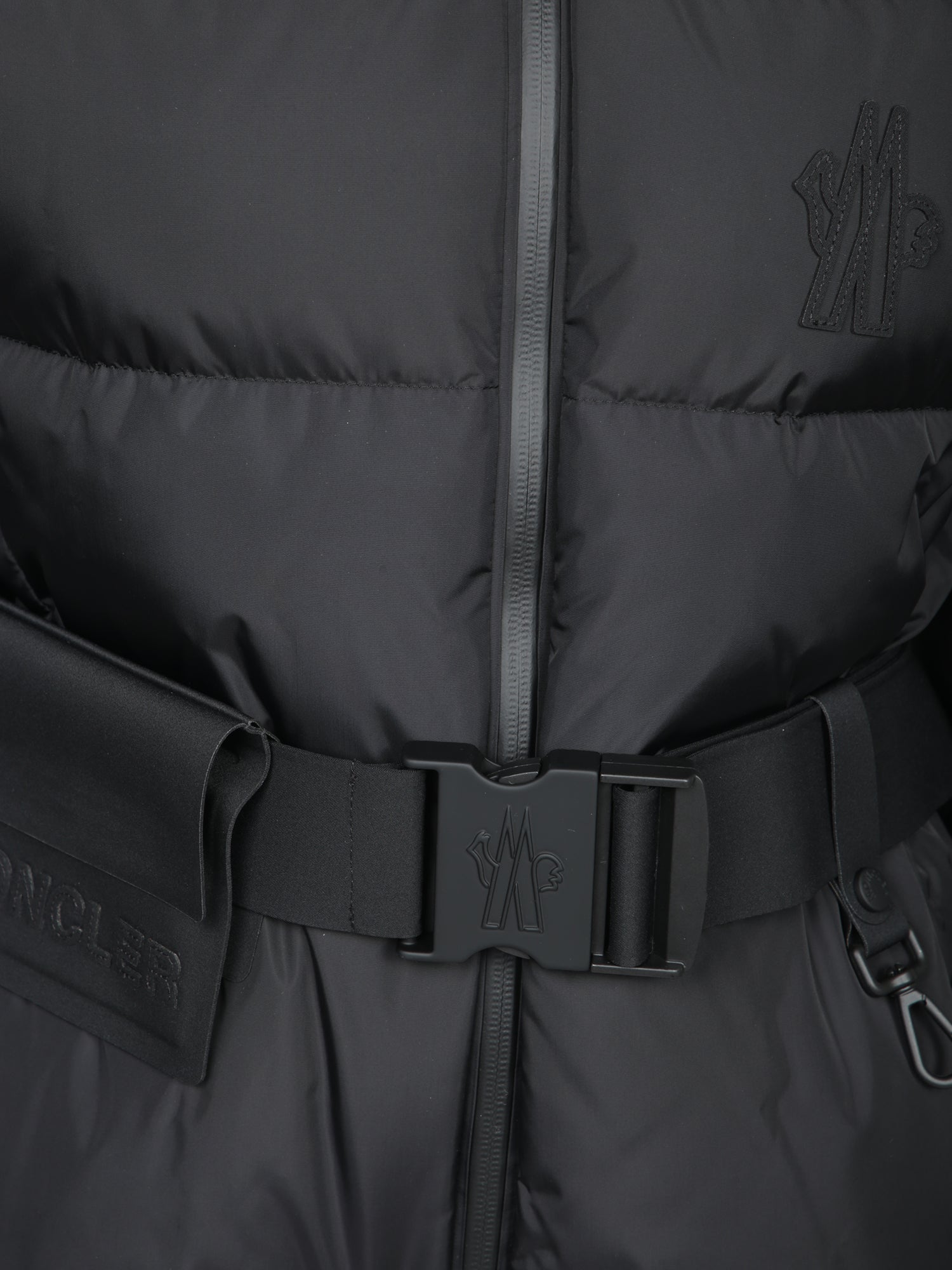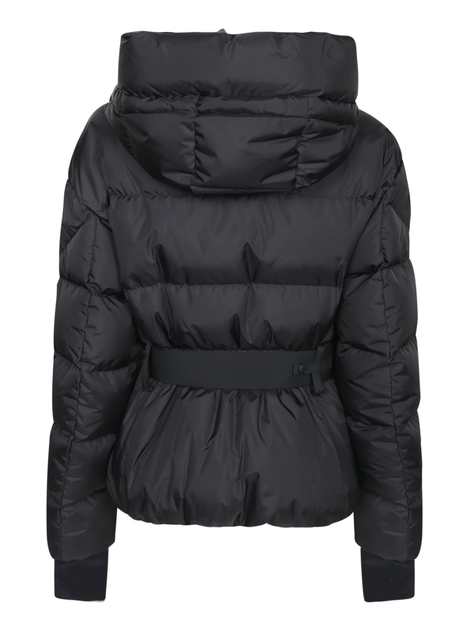 Padded down jacket, logo waist belt, adjustable hood, front zip closure.
