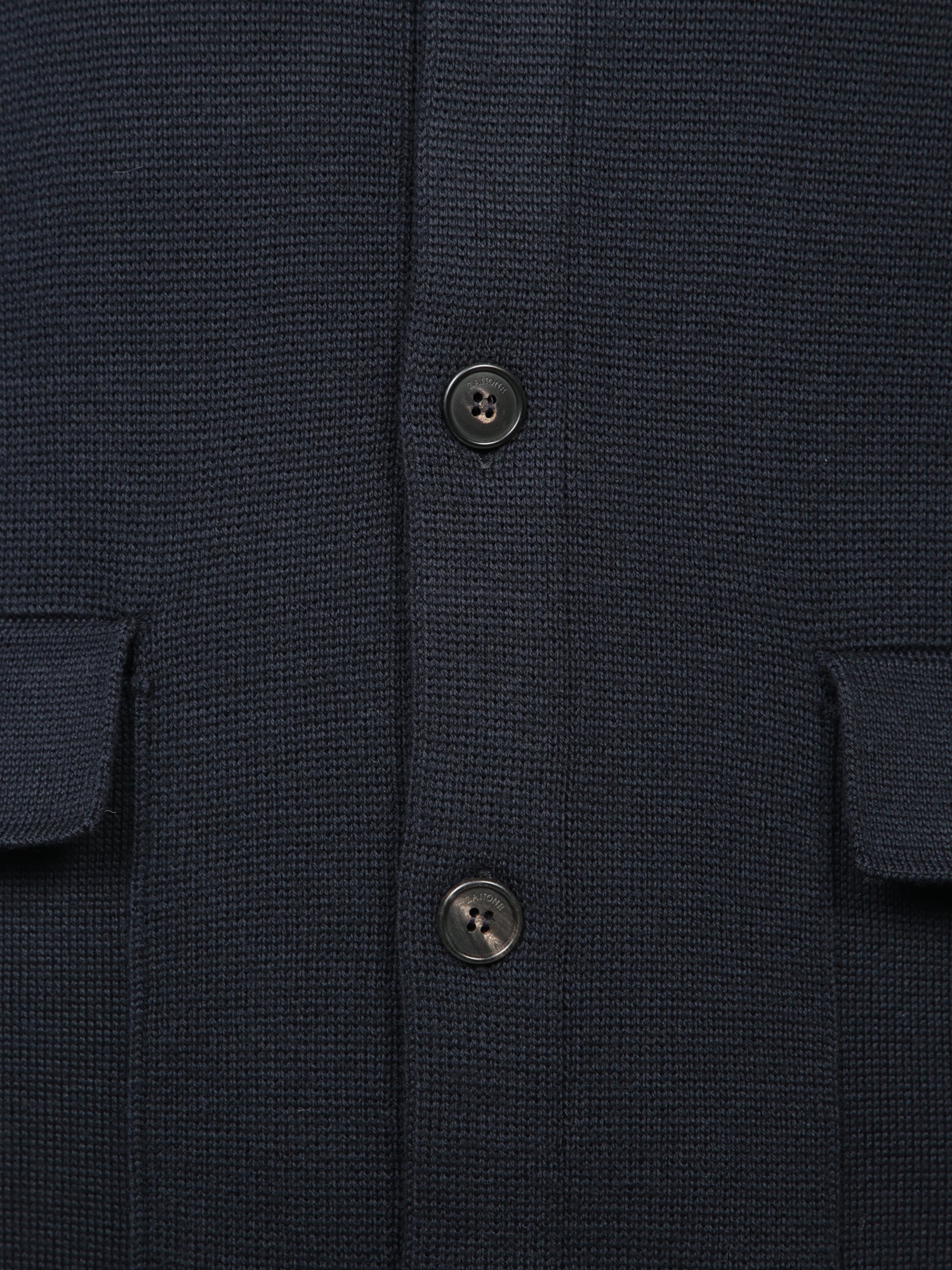 Cardigan with ribbed collar, button front closure, and patch pockets on the front.