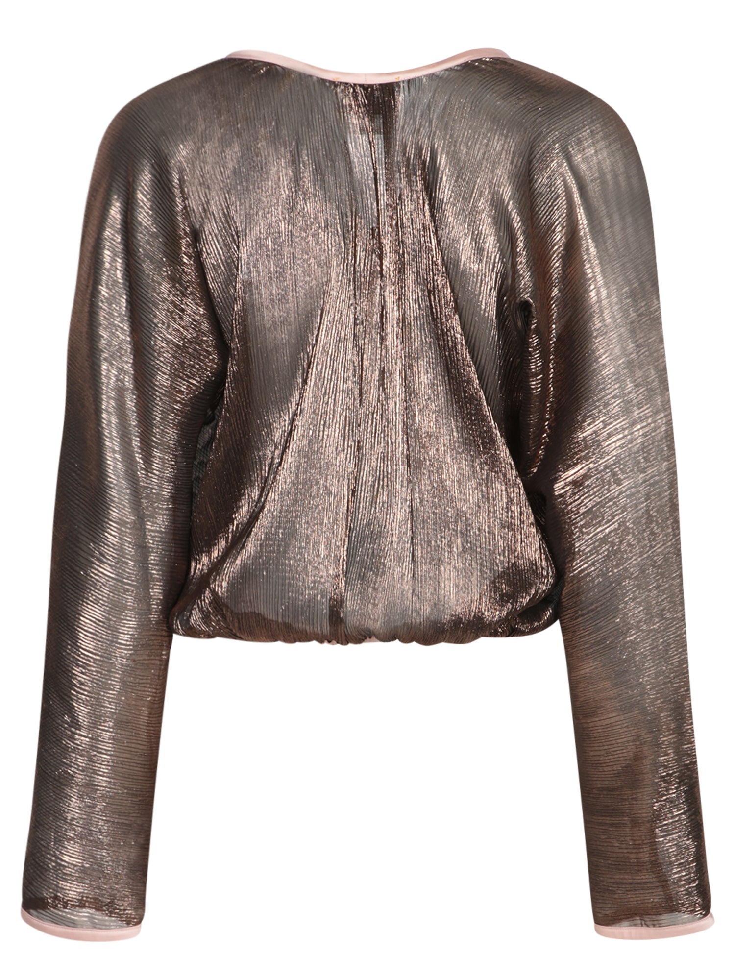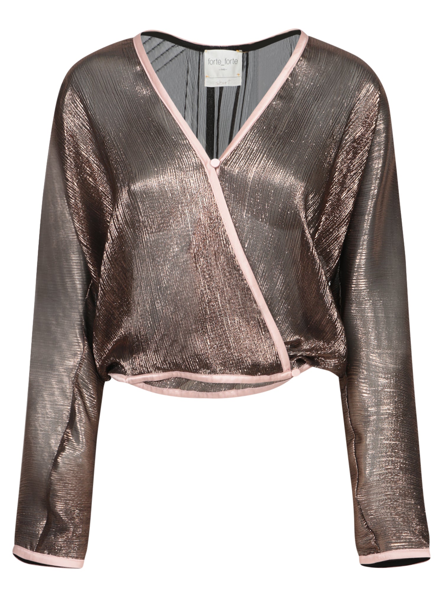 Bronze lamé fabric shirt. Kimono cut with long sleeves and a single front button. Trimmed in pale pink contrast.
