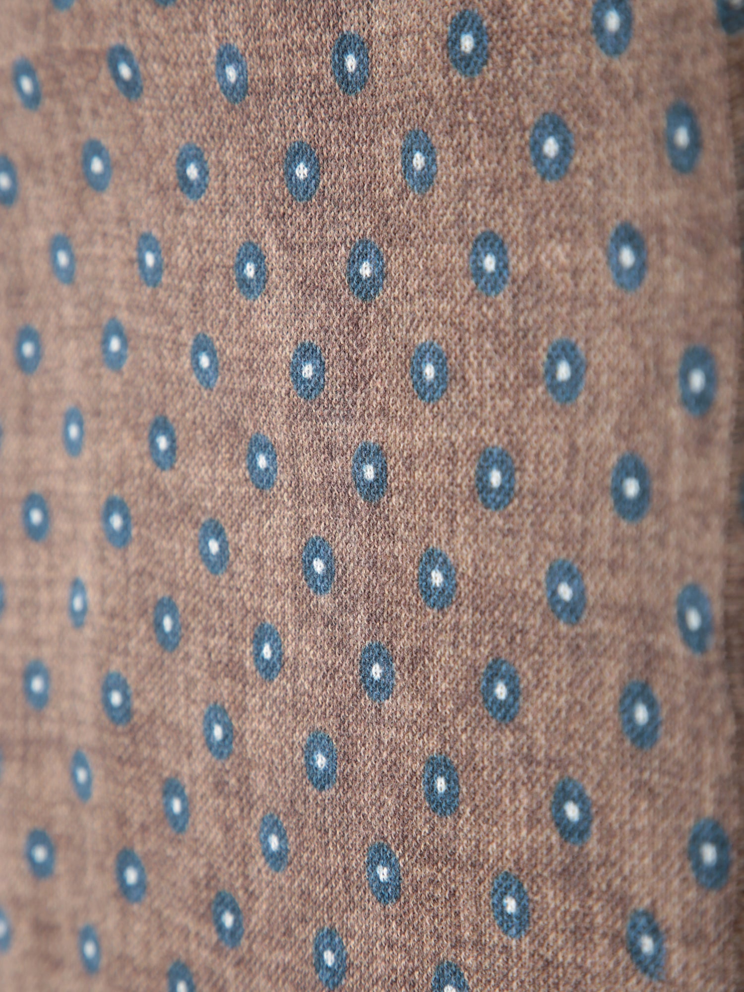 Cashmere scarf. Blue polka dot pattern on a brown base. Fringed edges.