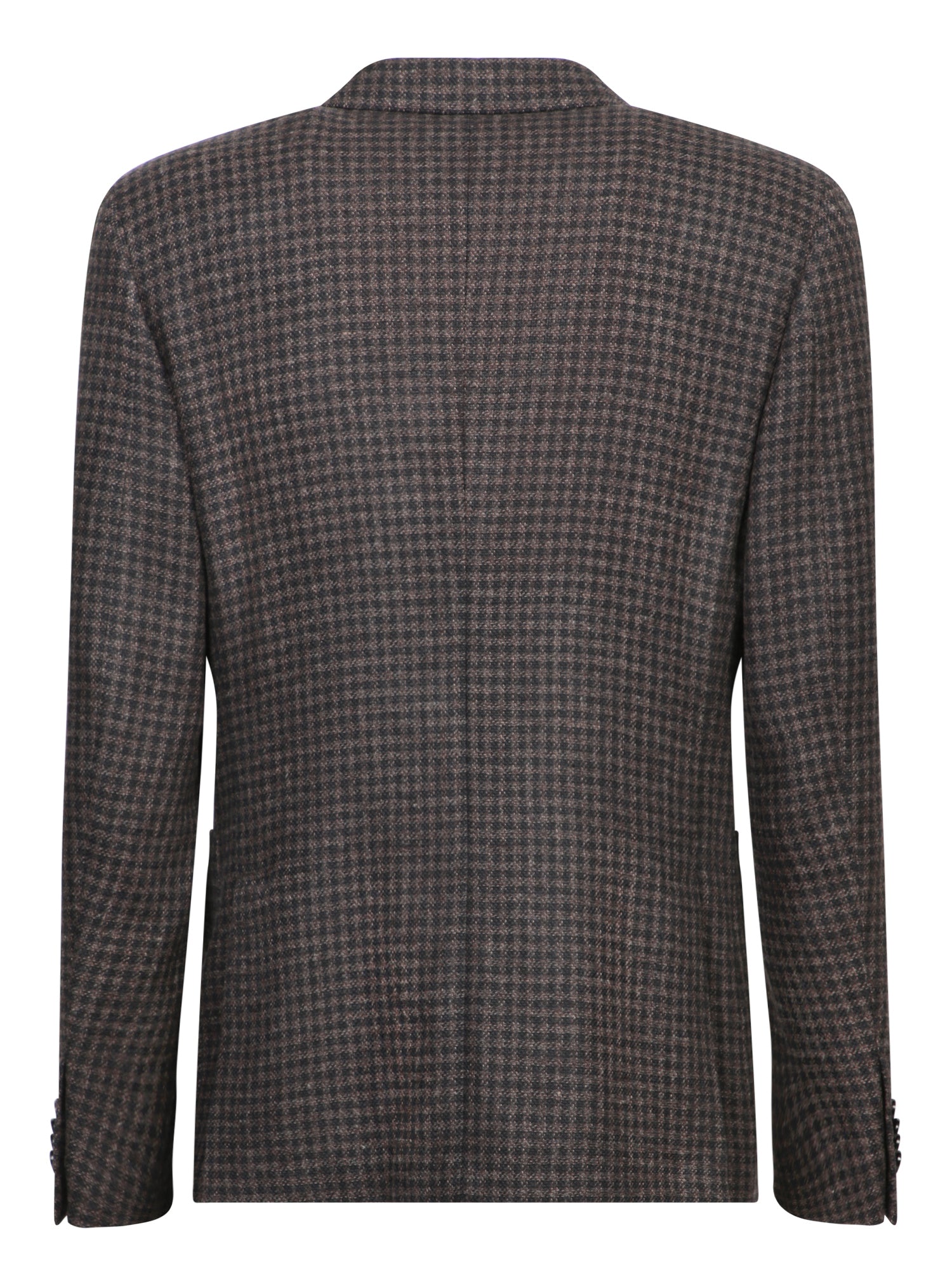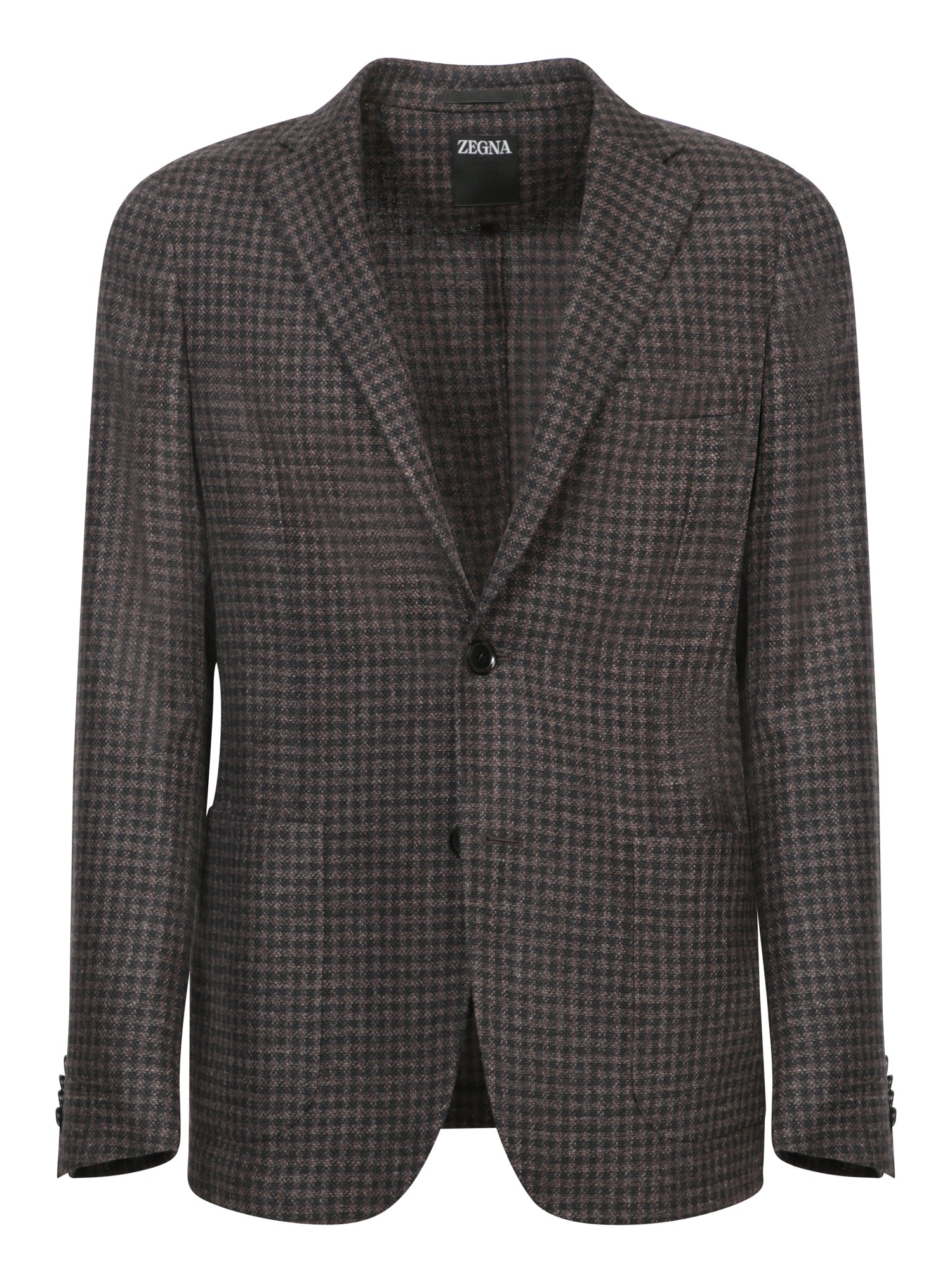 This Zegna jacket embodies timeless elegance with its brown and black check pattern in fine wool and cashmere, perfect for a sophisticated look on any occasion.
