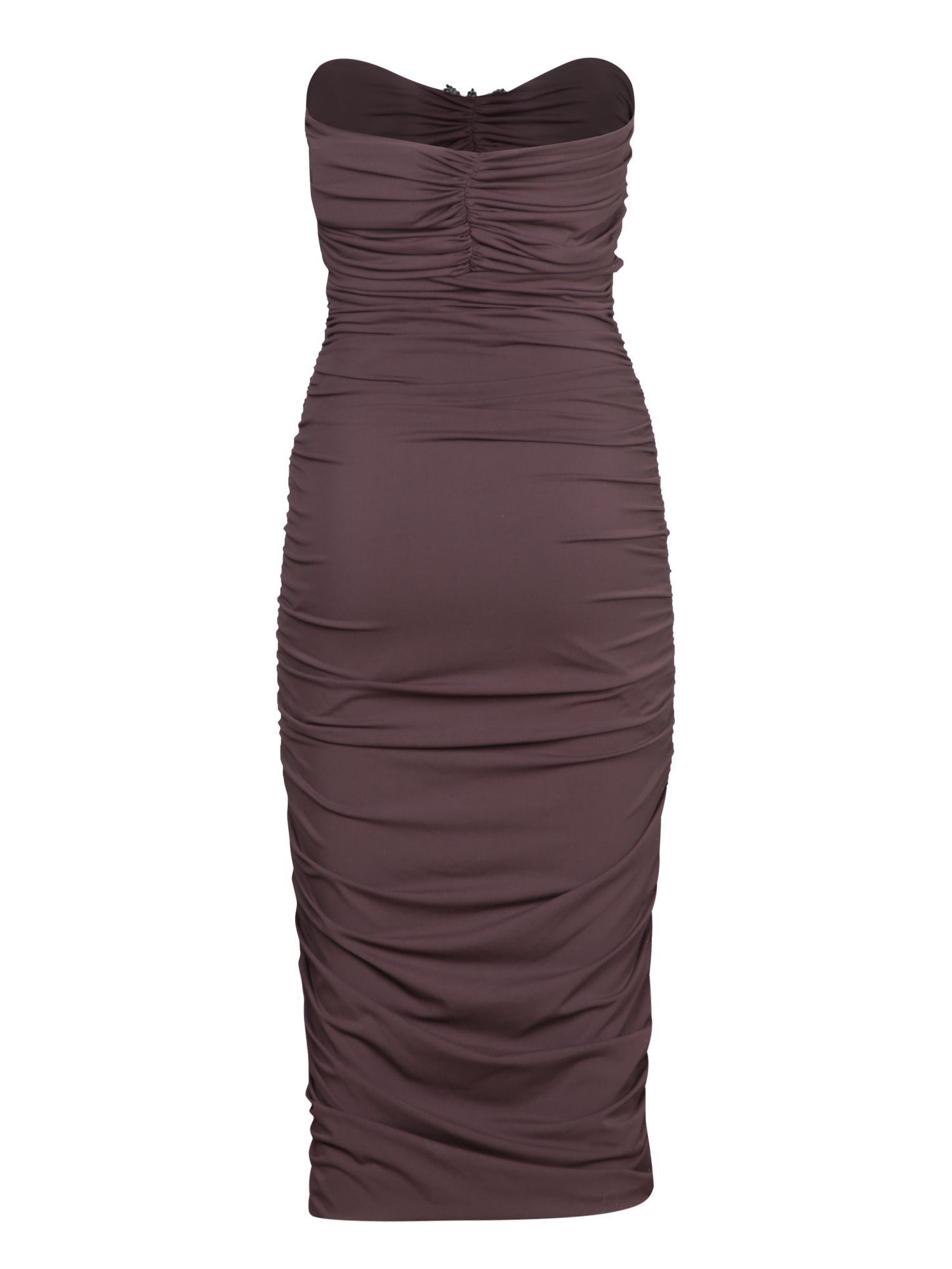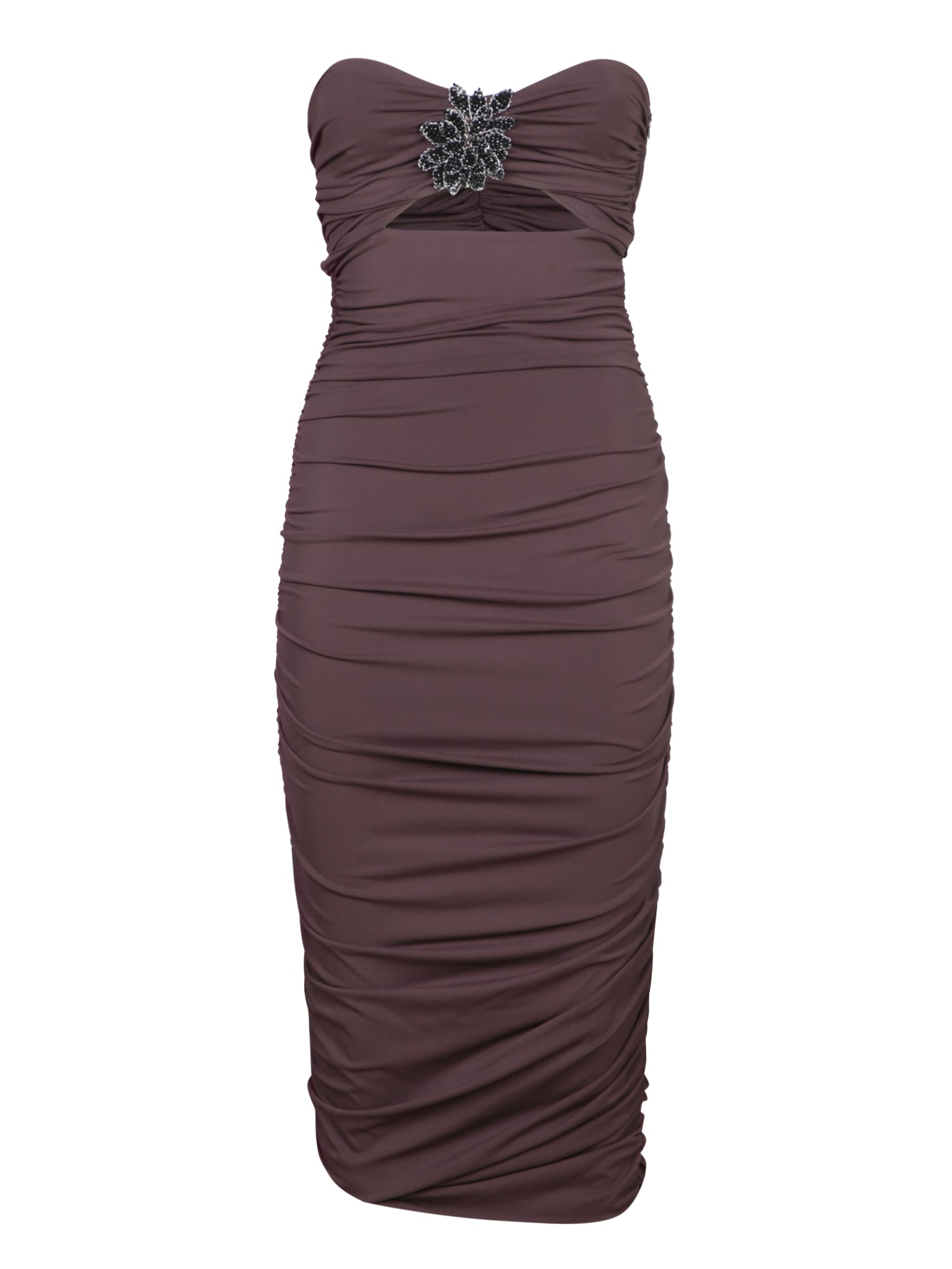 Strapless dress. Draped jersey fabric. Brocade decorative detail.