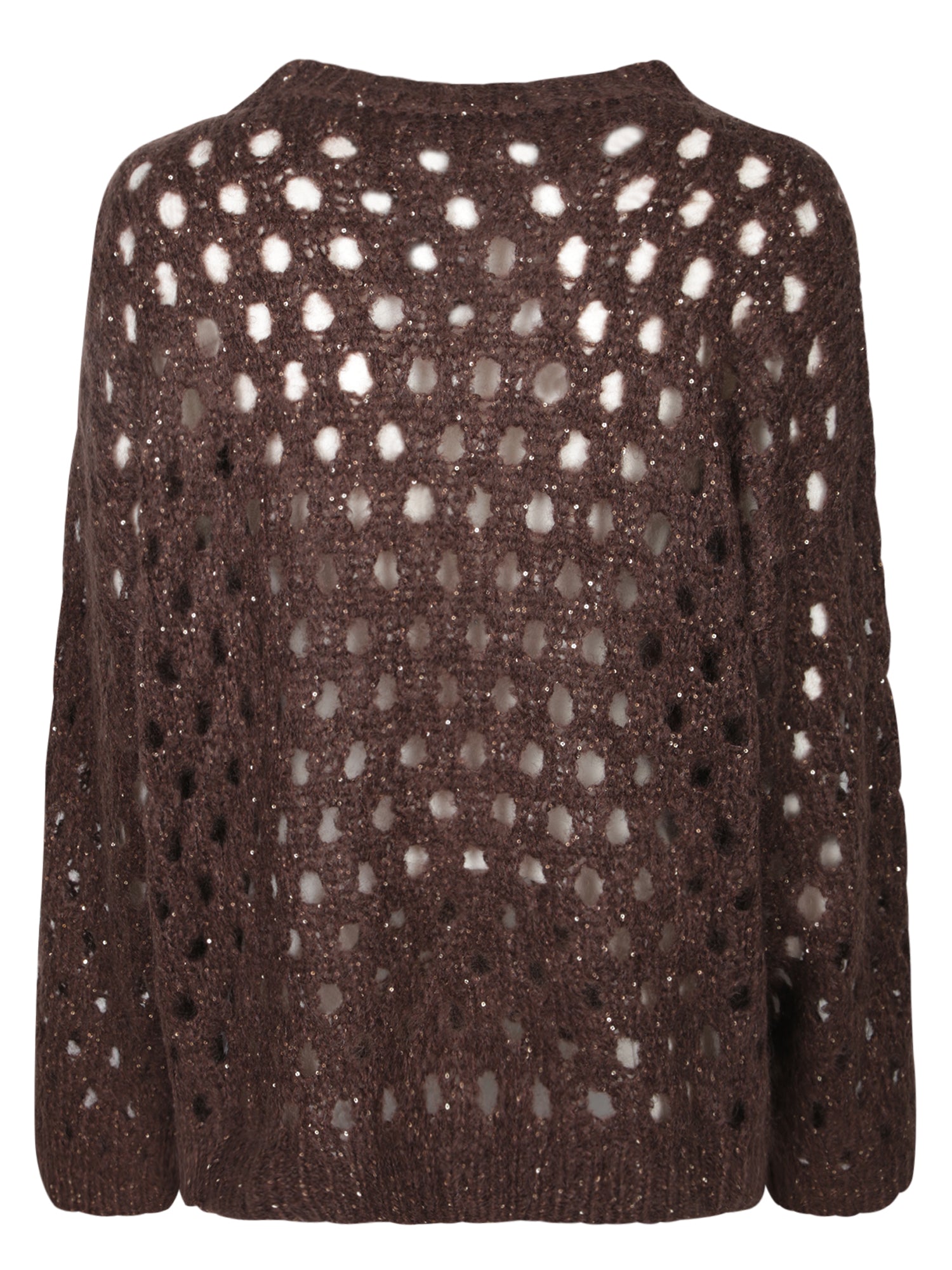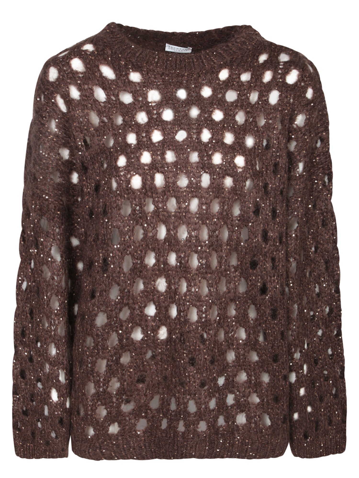 Long sleeve sweater. Brown mohair design with sequin detailing. Crew neckline.