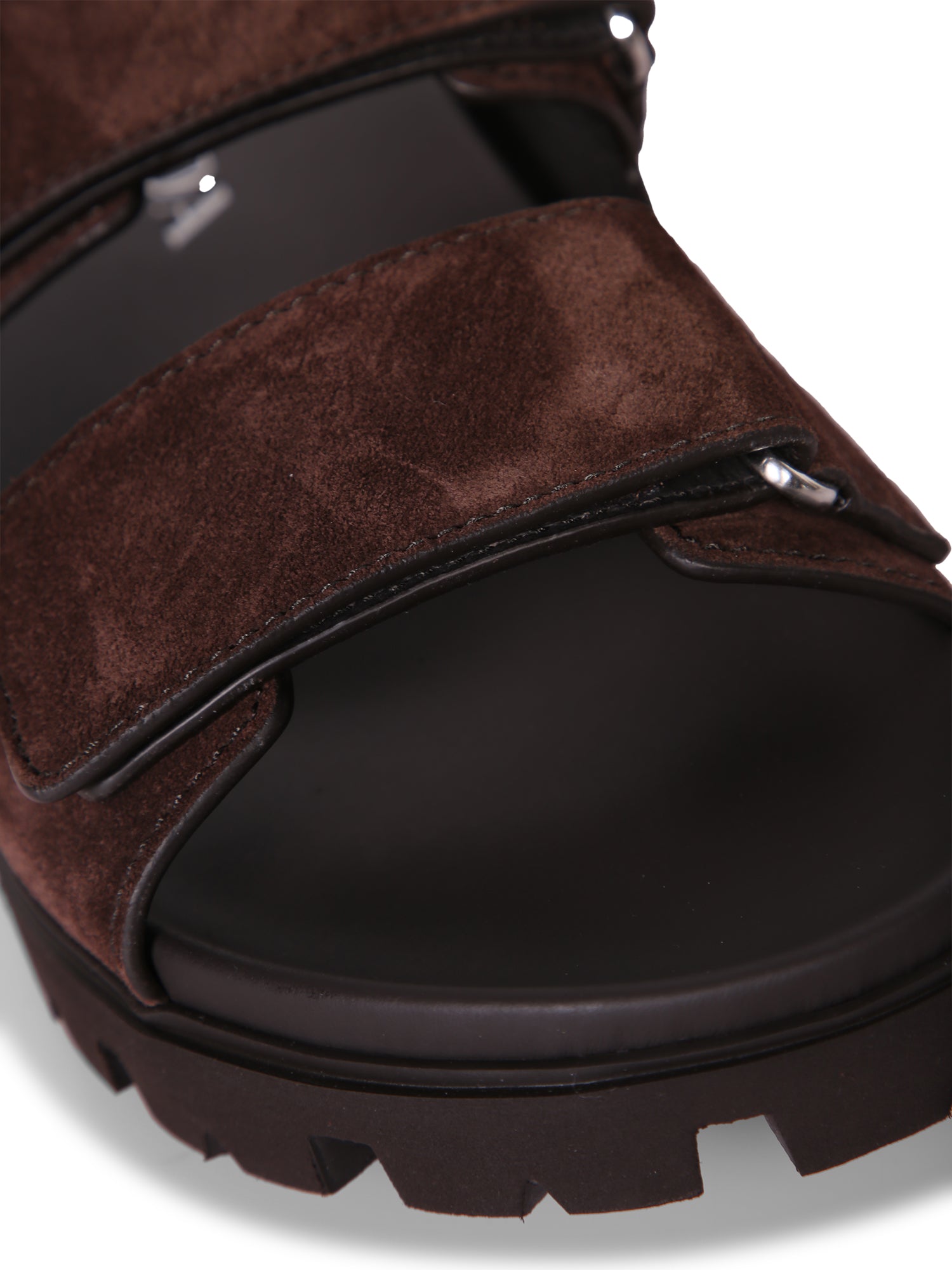 Sandal with rubber sole, brown suede upper. Adjustable Velcro closure.