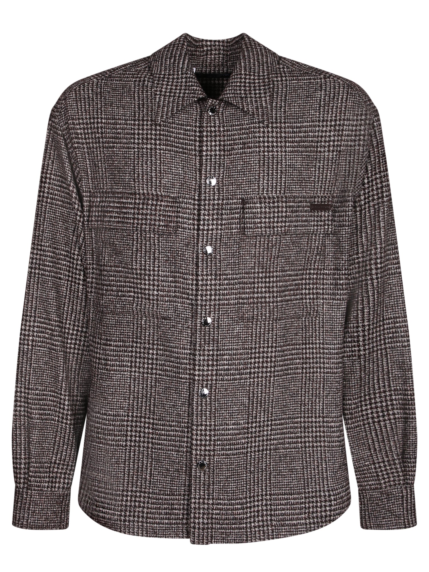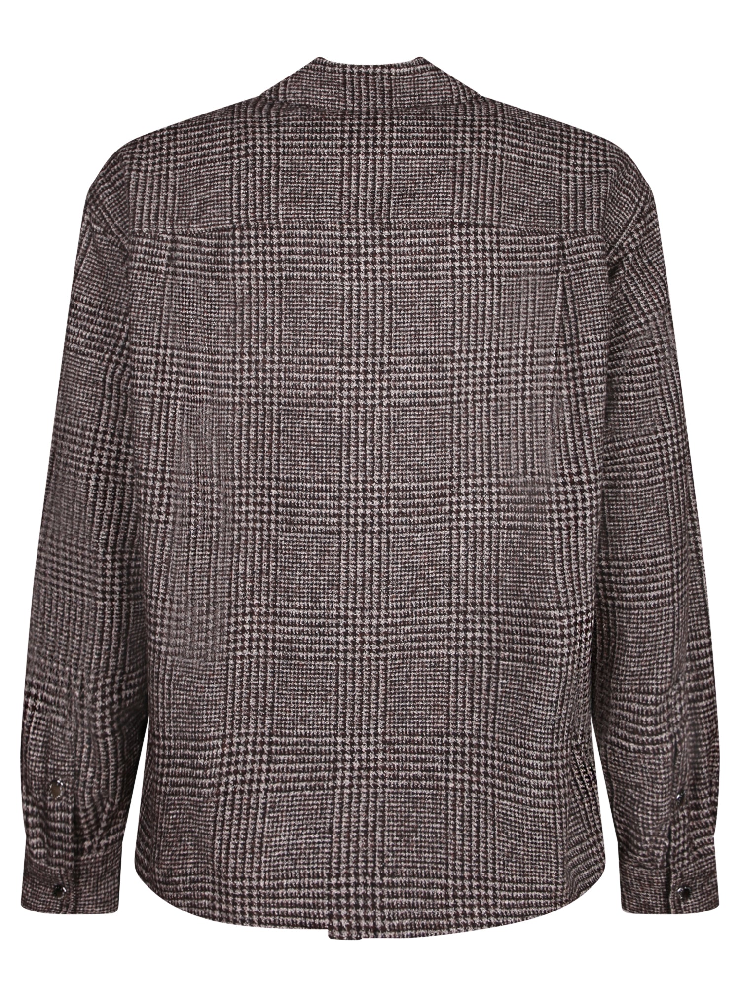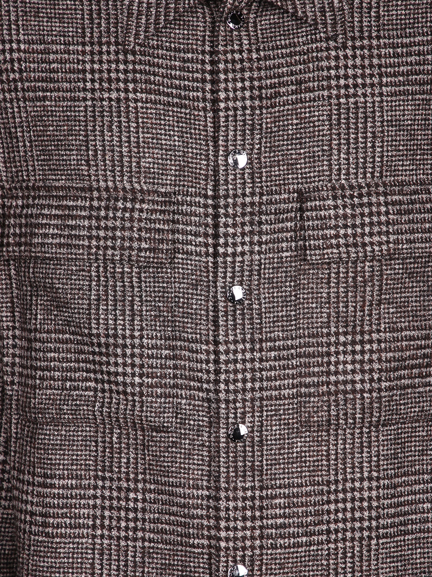 Long sleeve wool shirt. Features a classic collar and button front closure. Chest pocket.