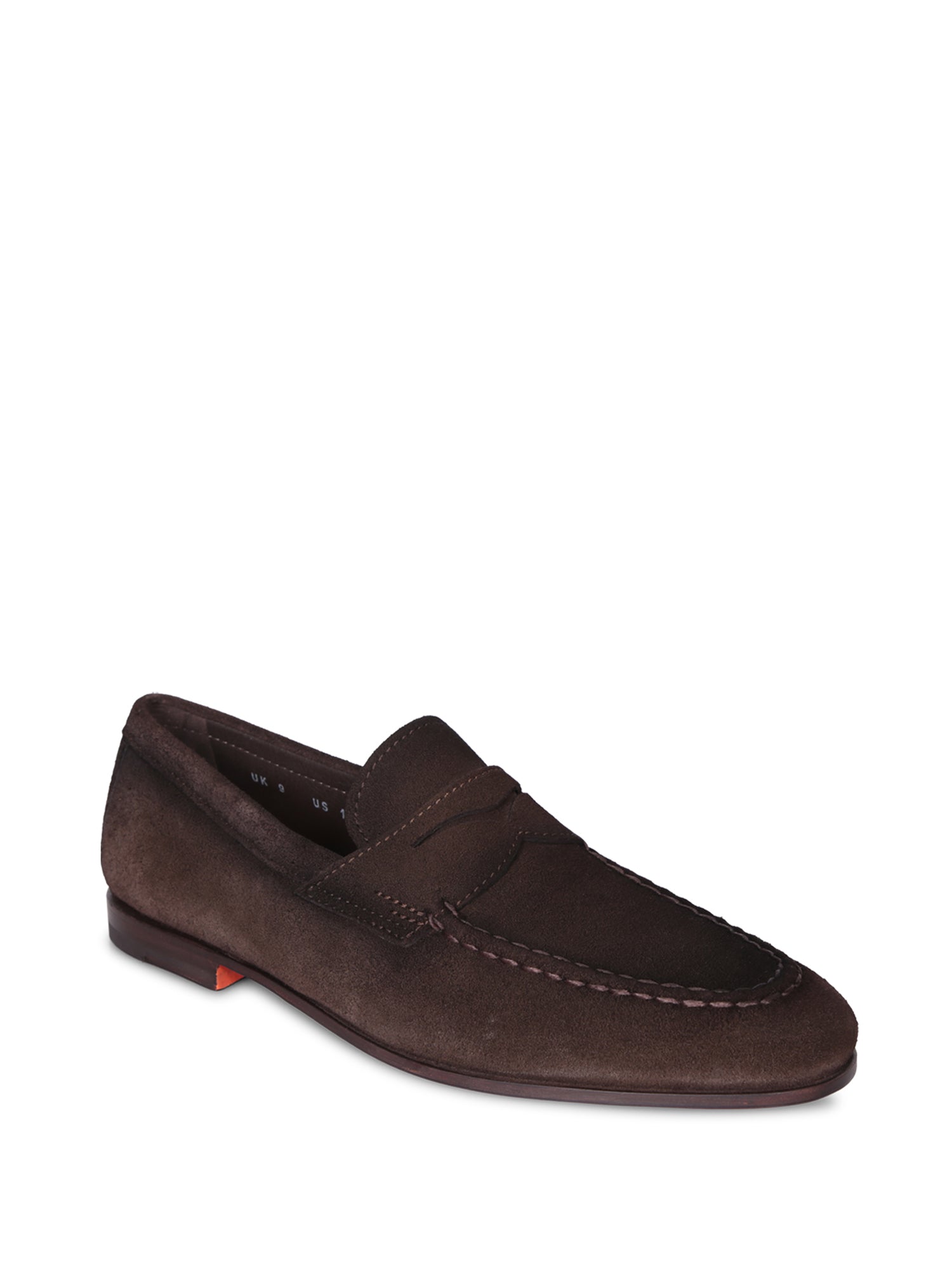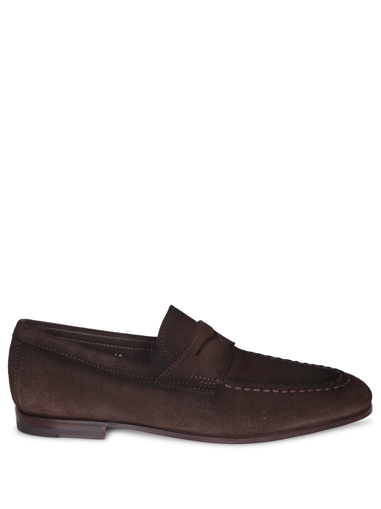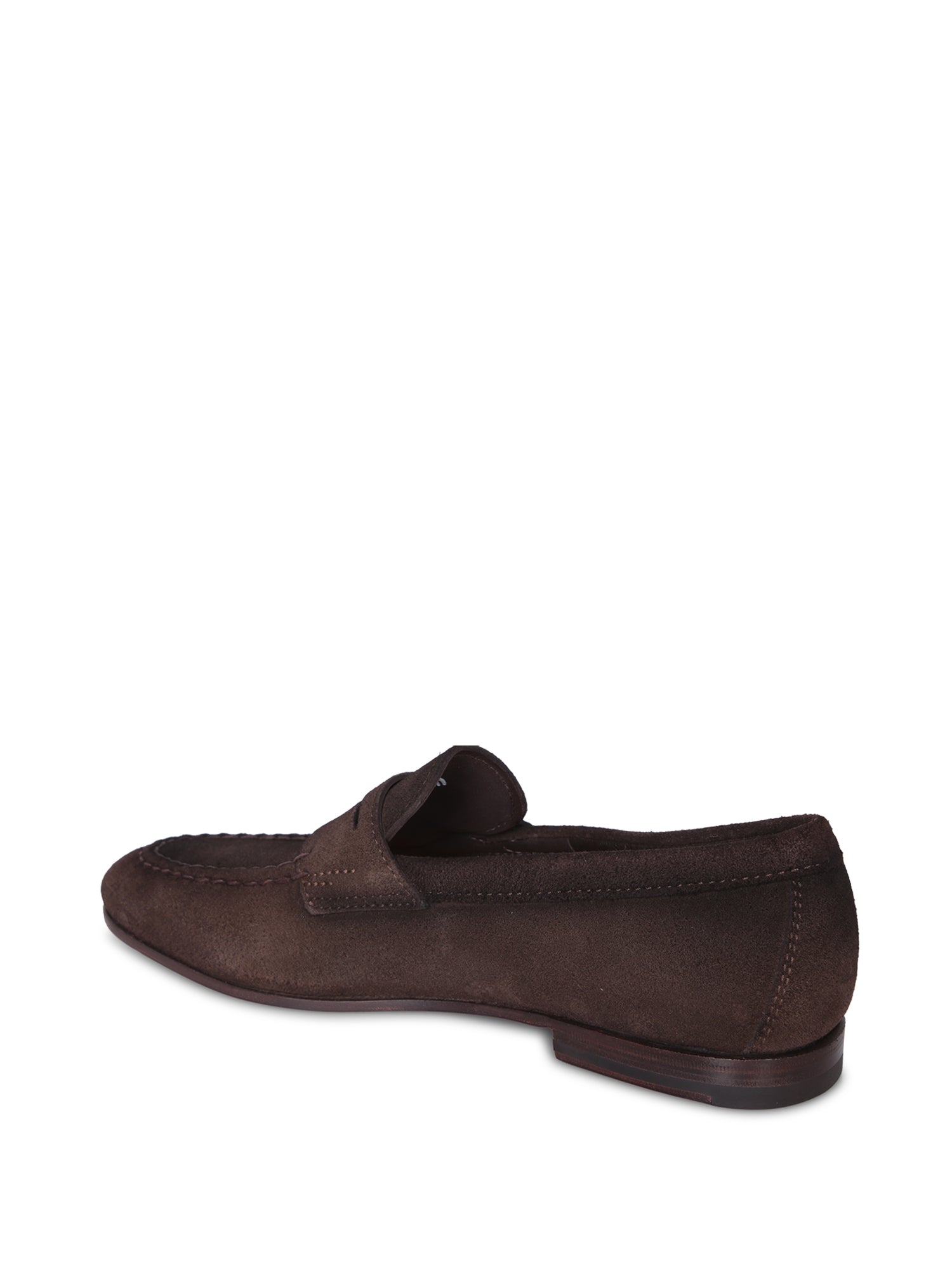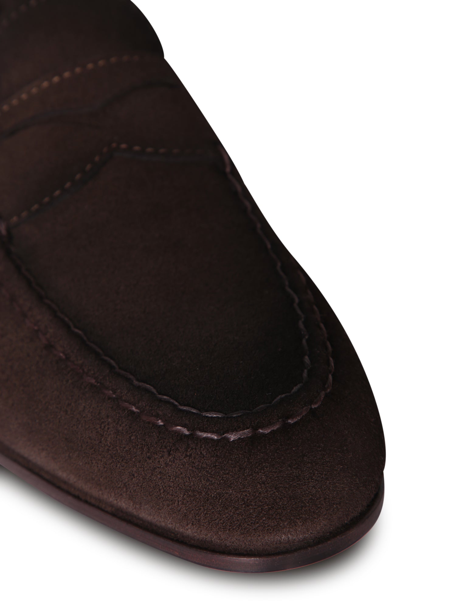 Suede loafer with visible stitching and strap detail. Rubber sole for maximum grip.