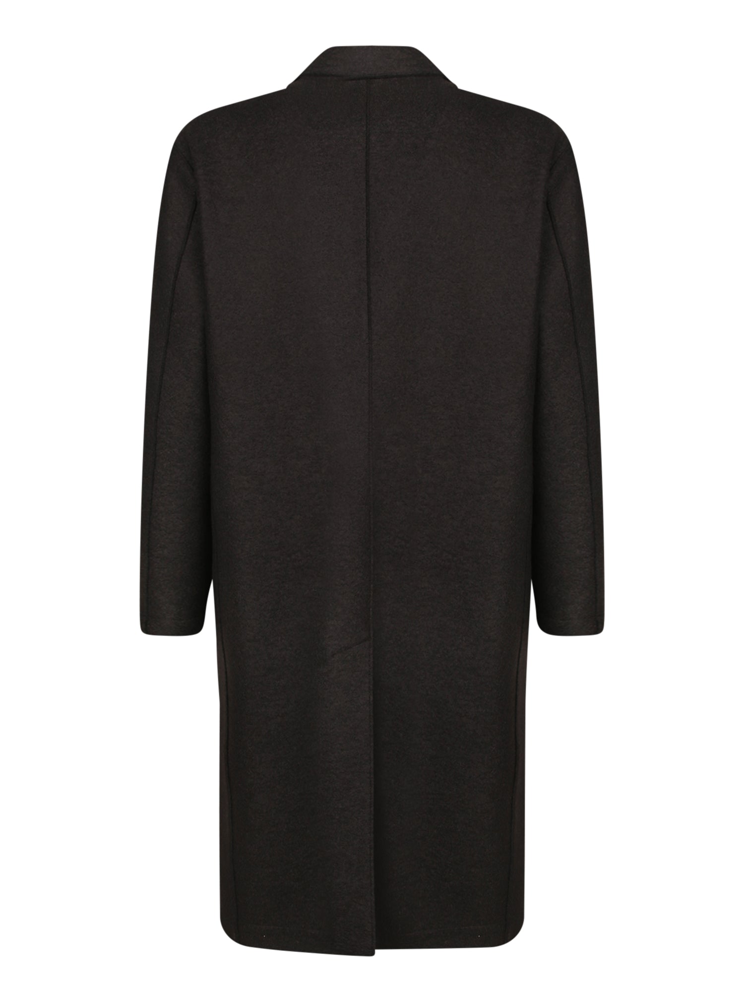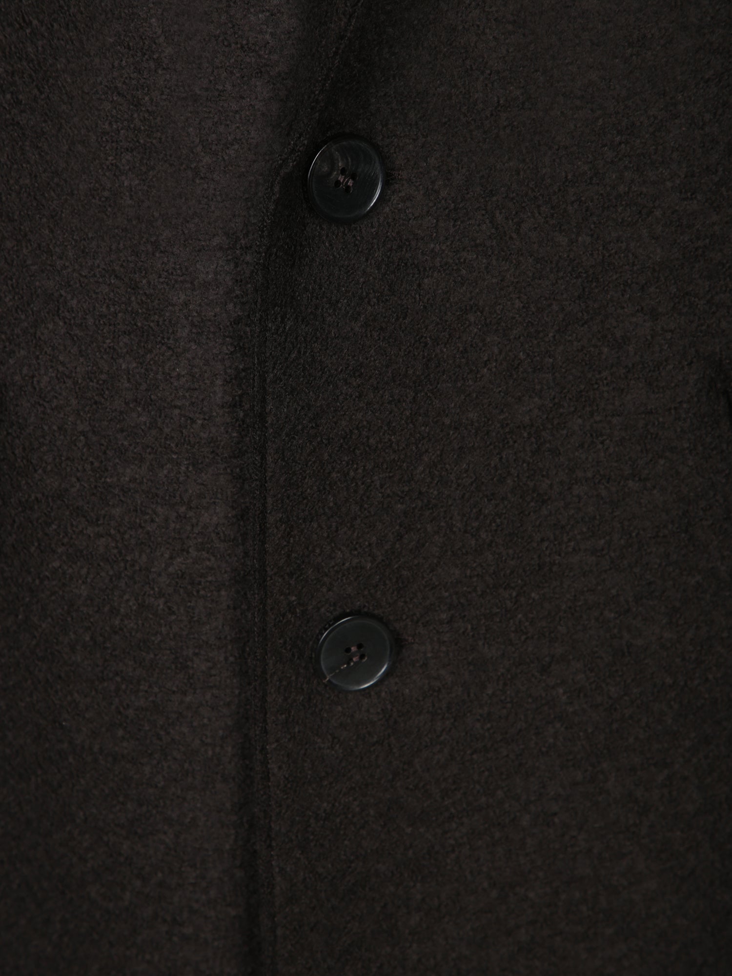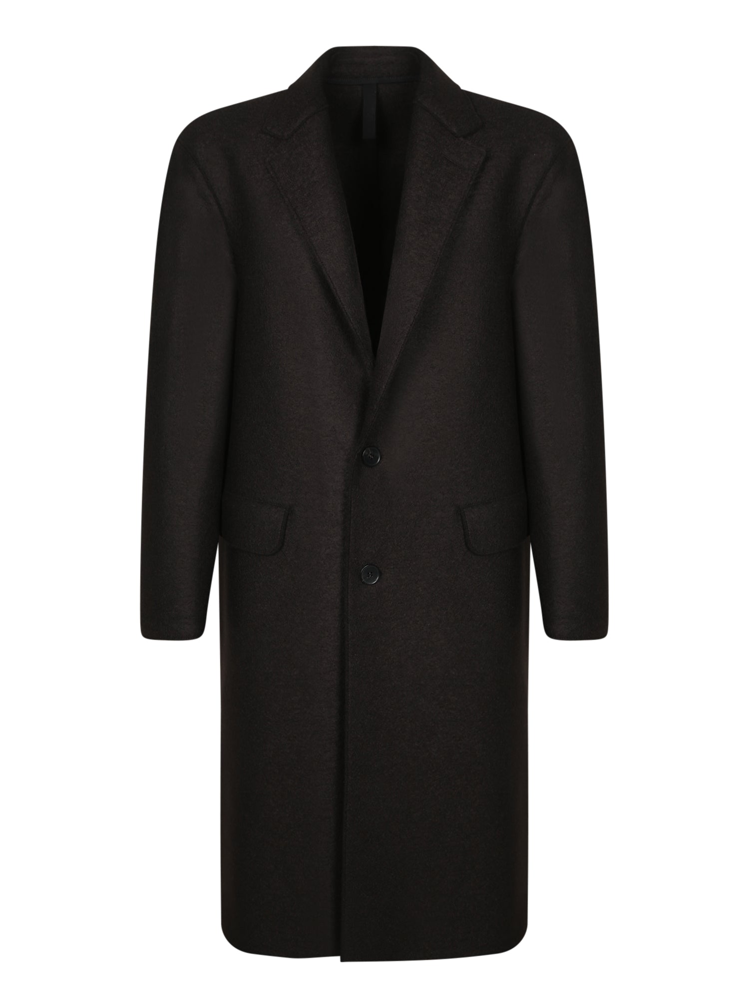 Wool coat with two-button closure. Features classic lapels, long sleeves, and flap pockets.