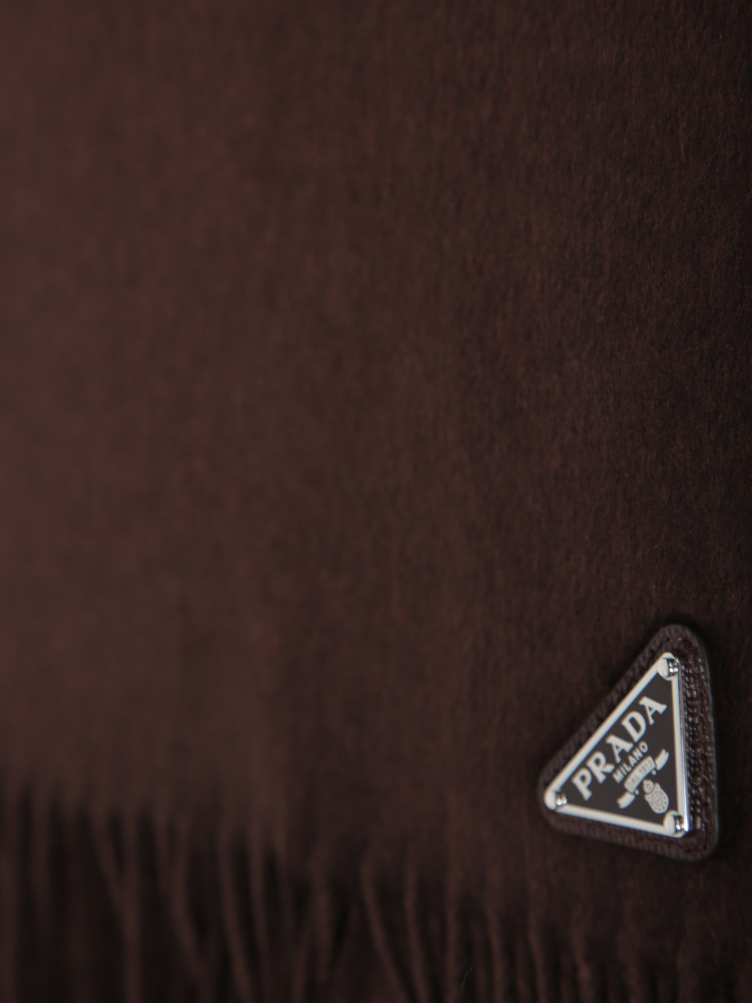 Silk and cashmere scarf in burnt color. Metallic PRADA logo at the corner. Fringed finish.