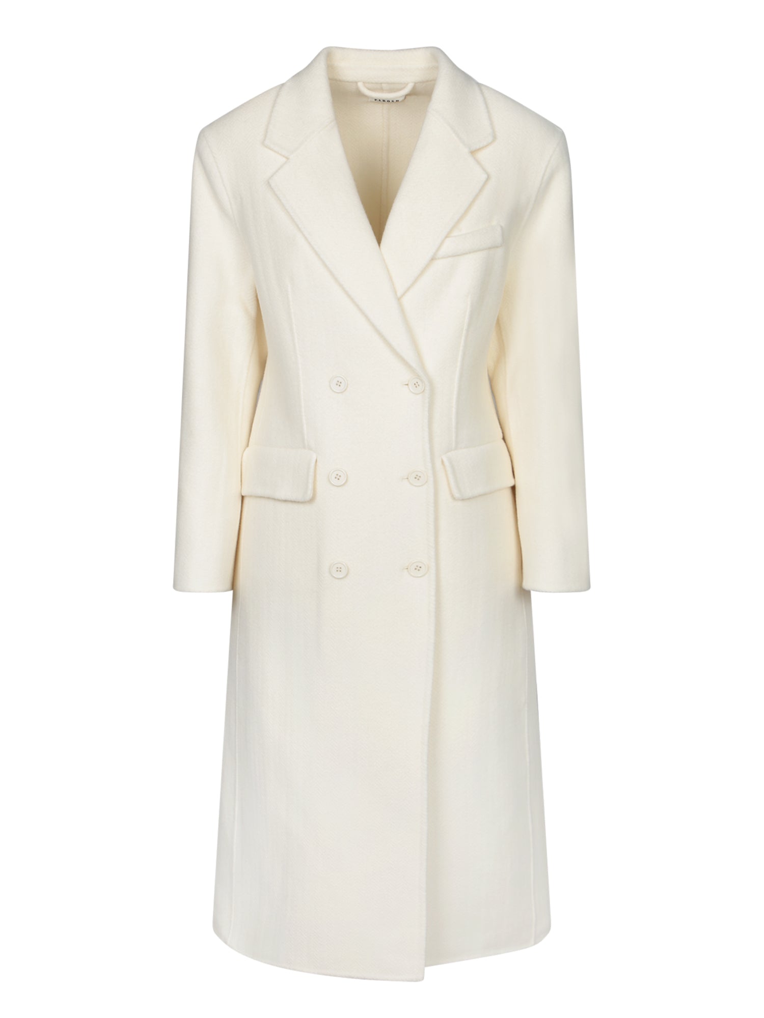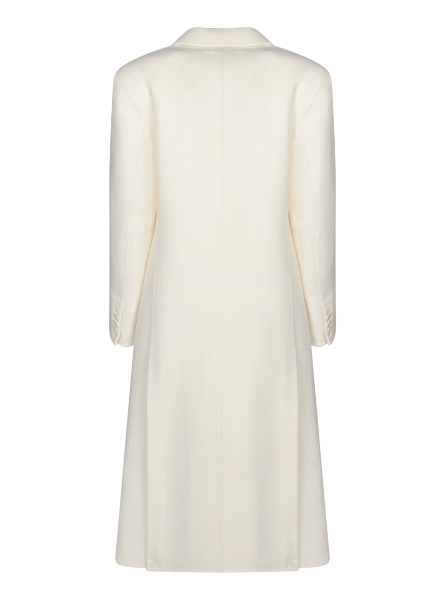 Double-breasted coat with houndstooth pattern. Features a wide peak lapel, flap pockets, and long sleeves with buttoned cuffs.