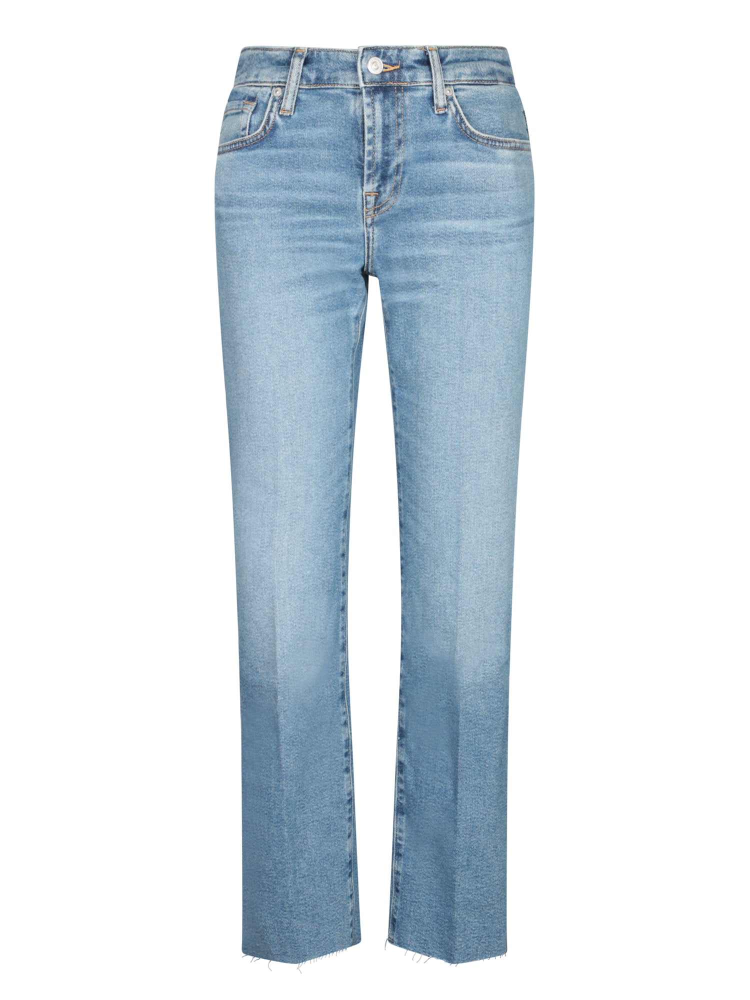 Mid-rise jeans with a straight cut to the ankle. Frayed hem. Medium blue denim fabric.