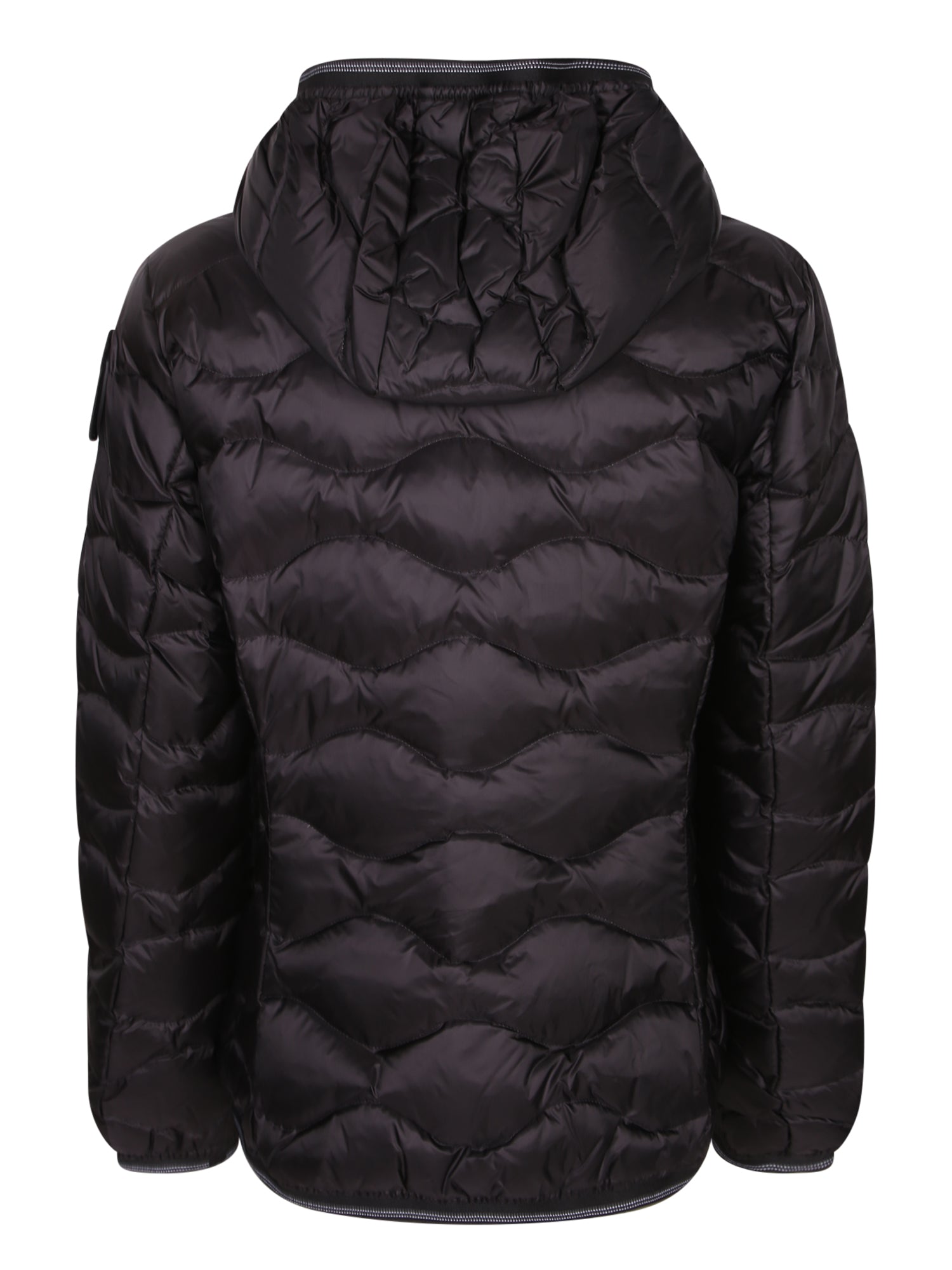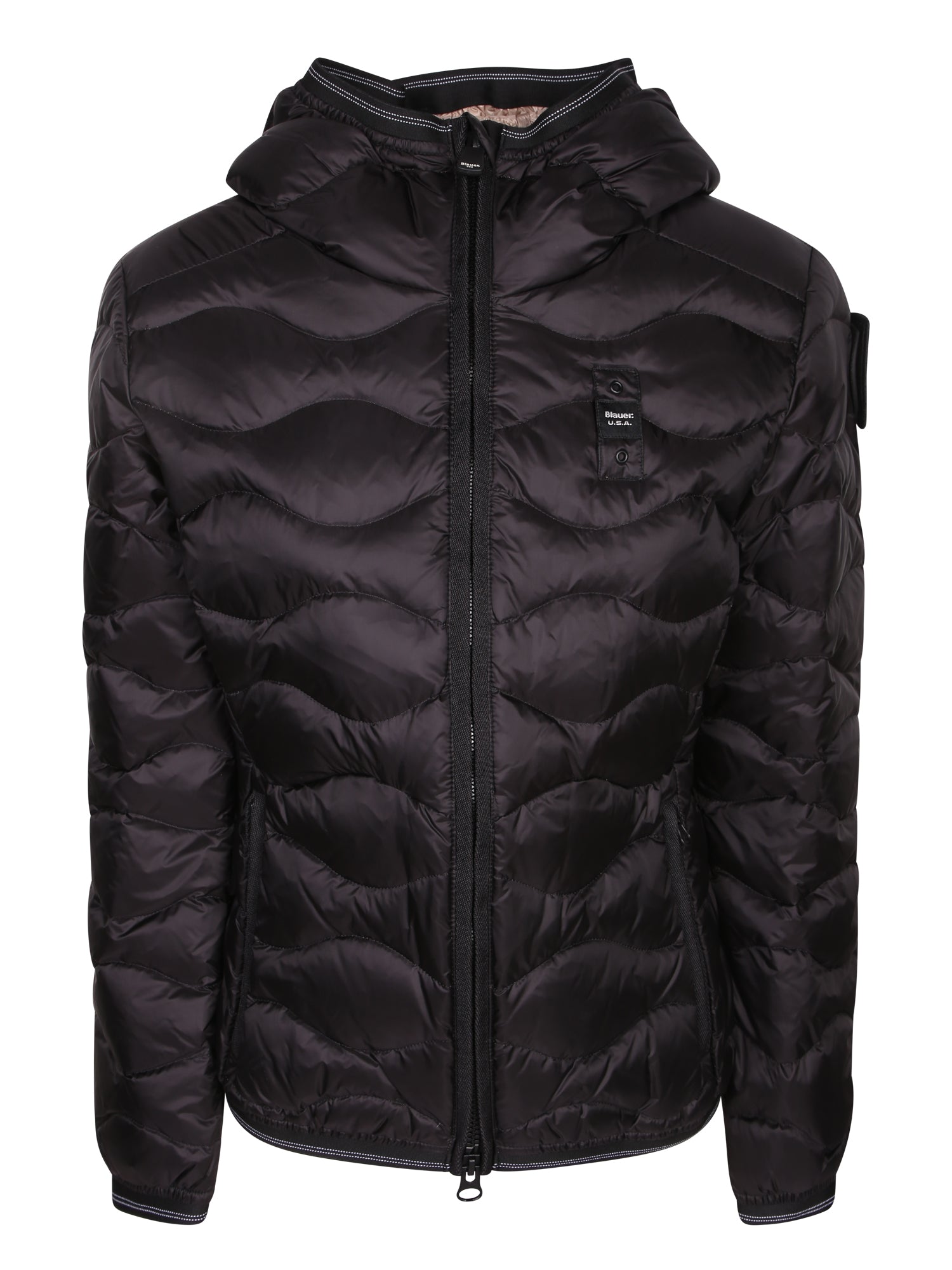 Down jacket with hood, front zip closure, side zip pockets.