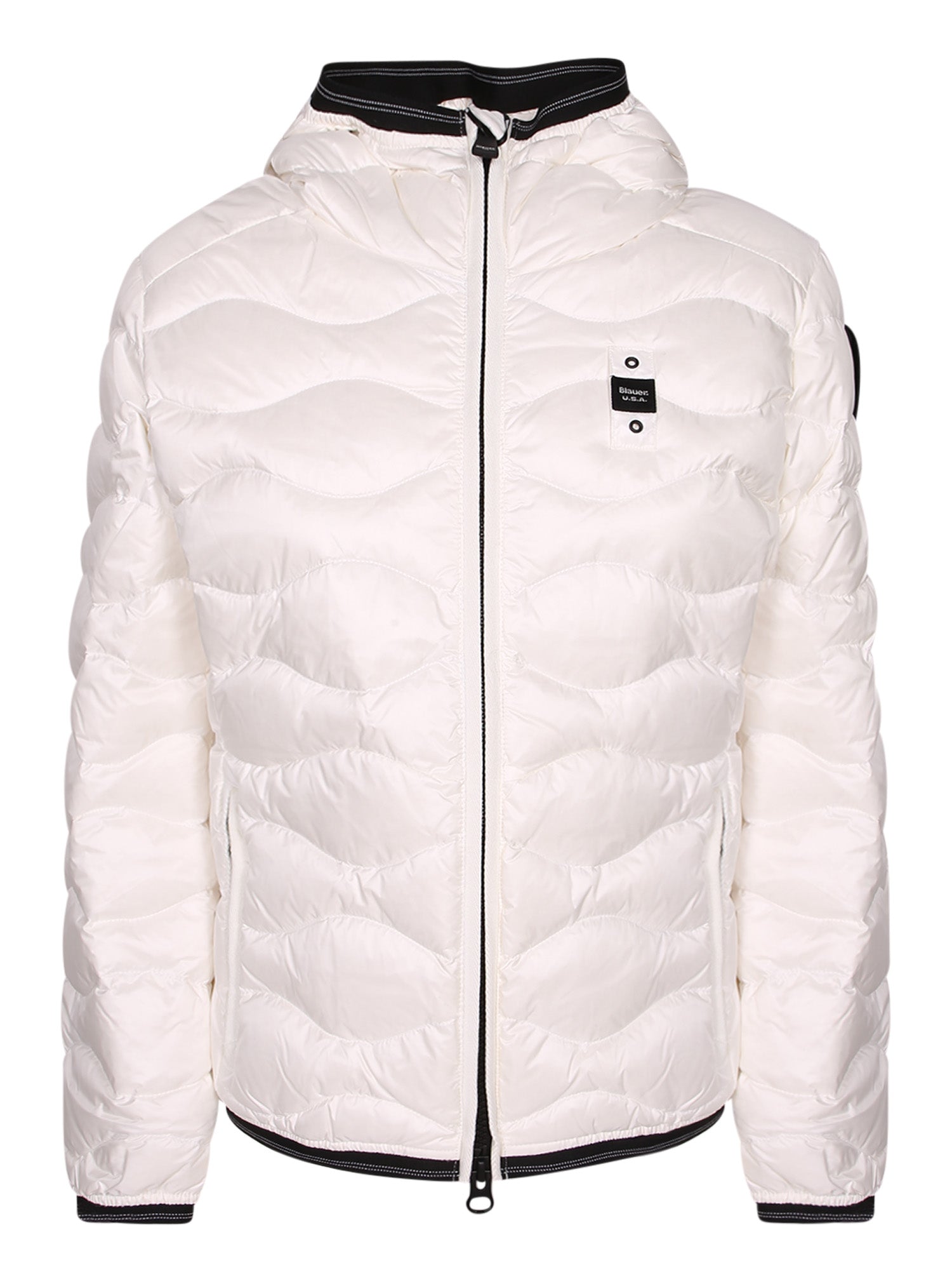 Padded down jacket with full zip closure. High collar with black interior contrast. Elasticated cuffs and hem.