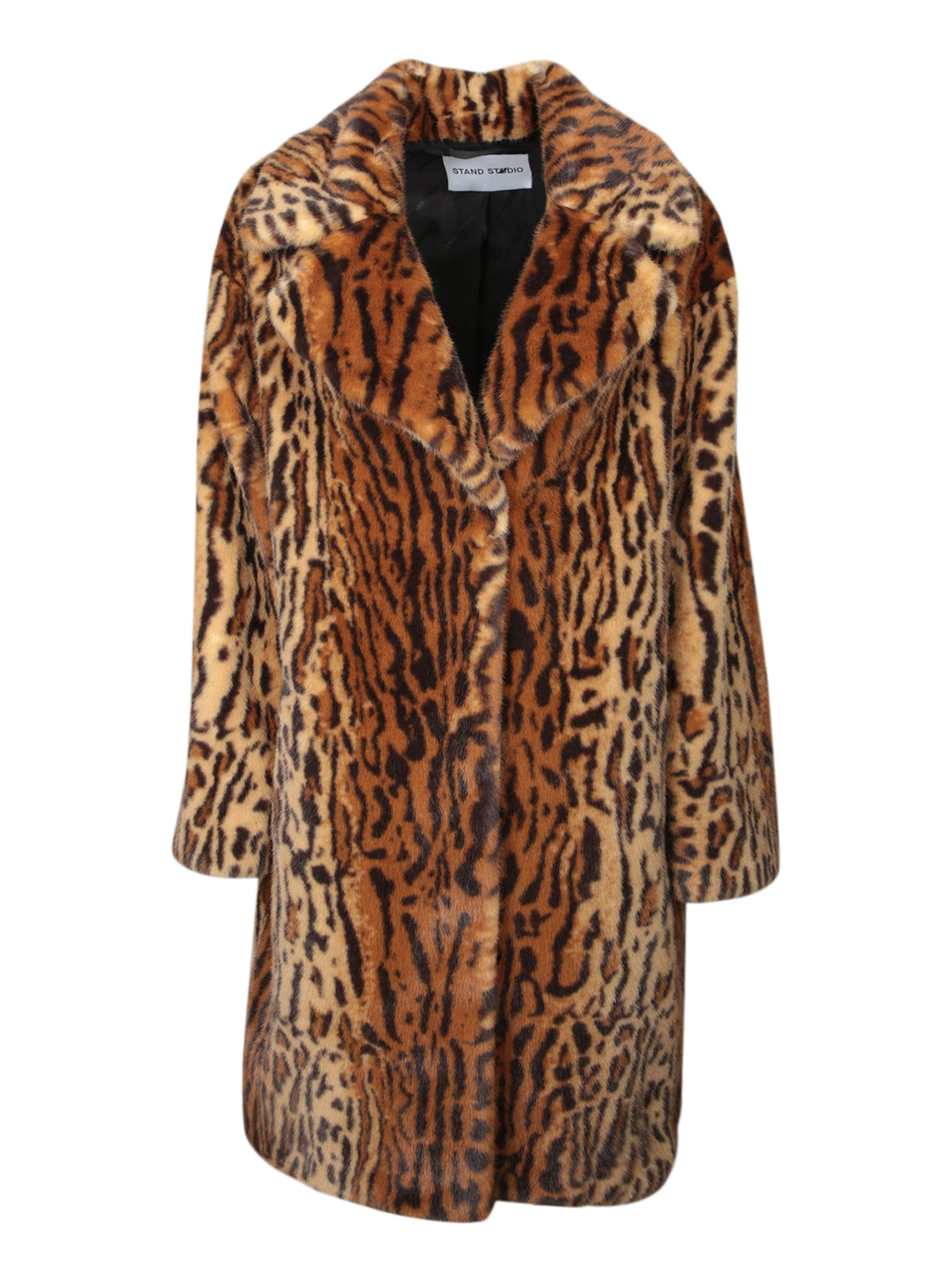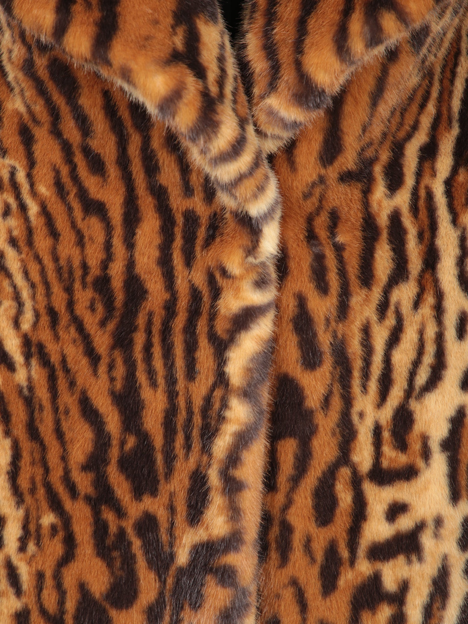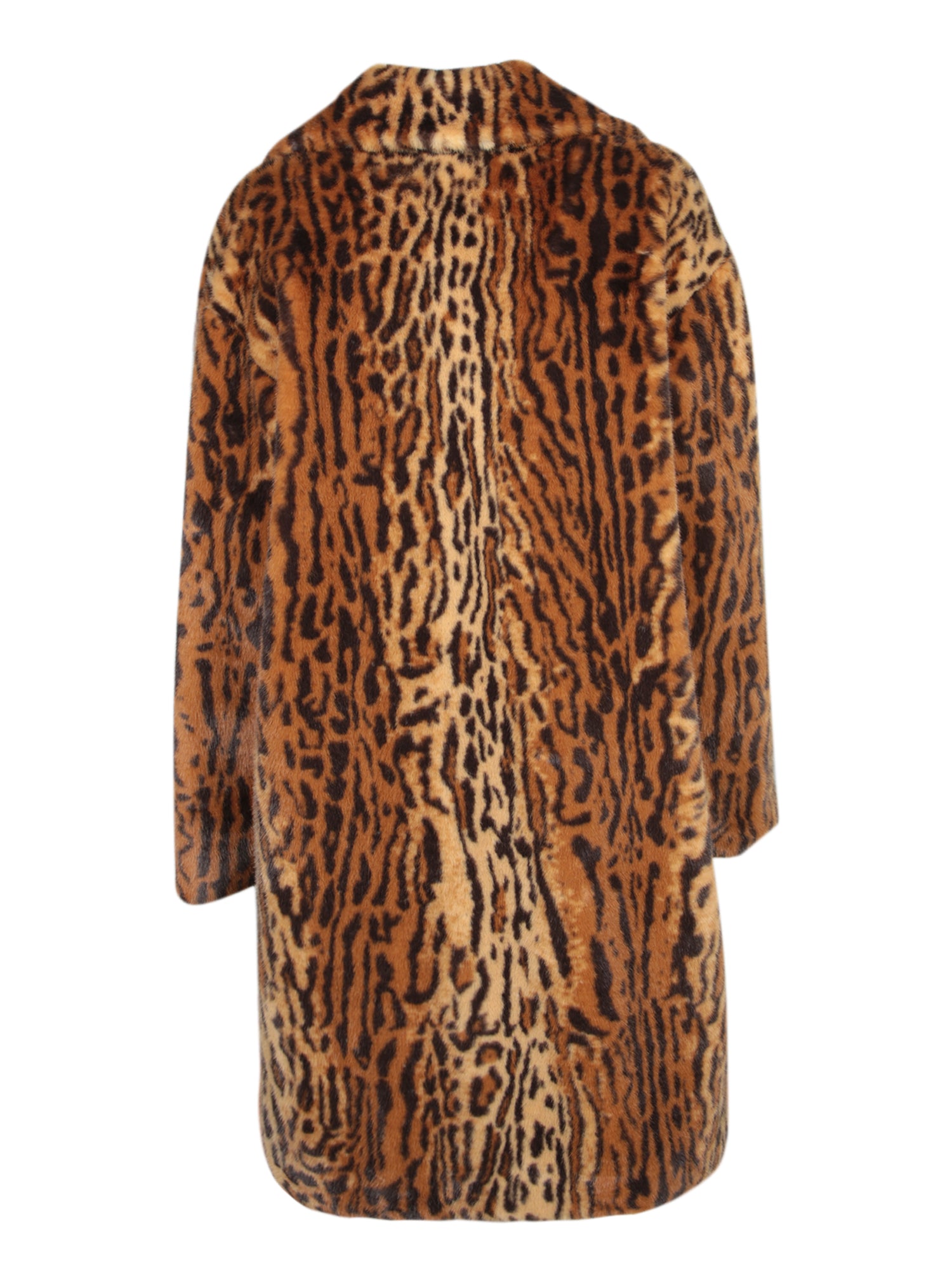 Oversized coat with leopard print. Long sleeves, front hook closure. Lined interior.