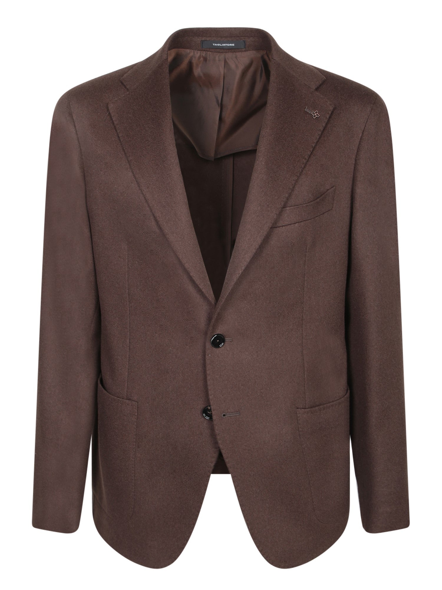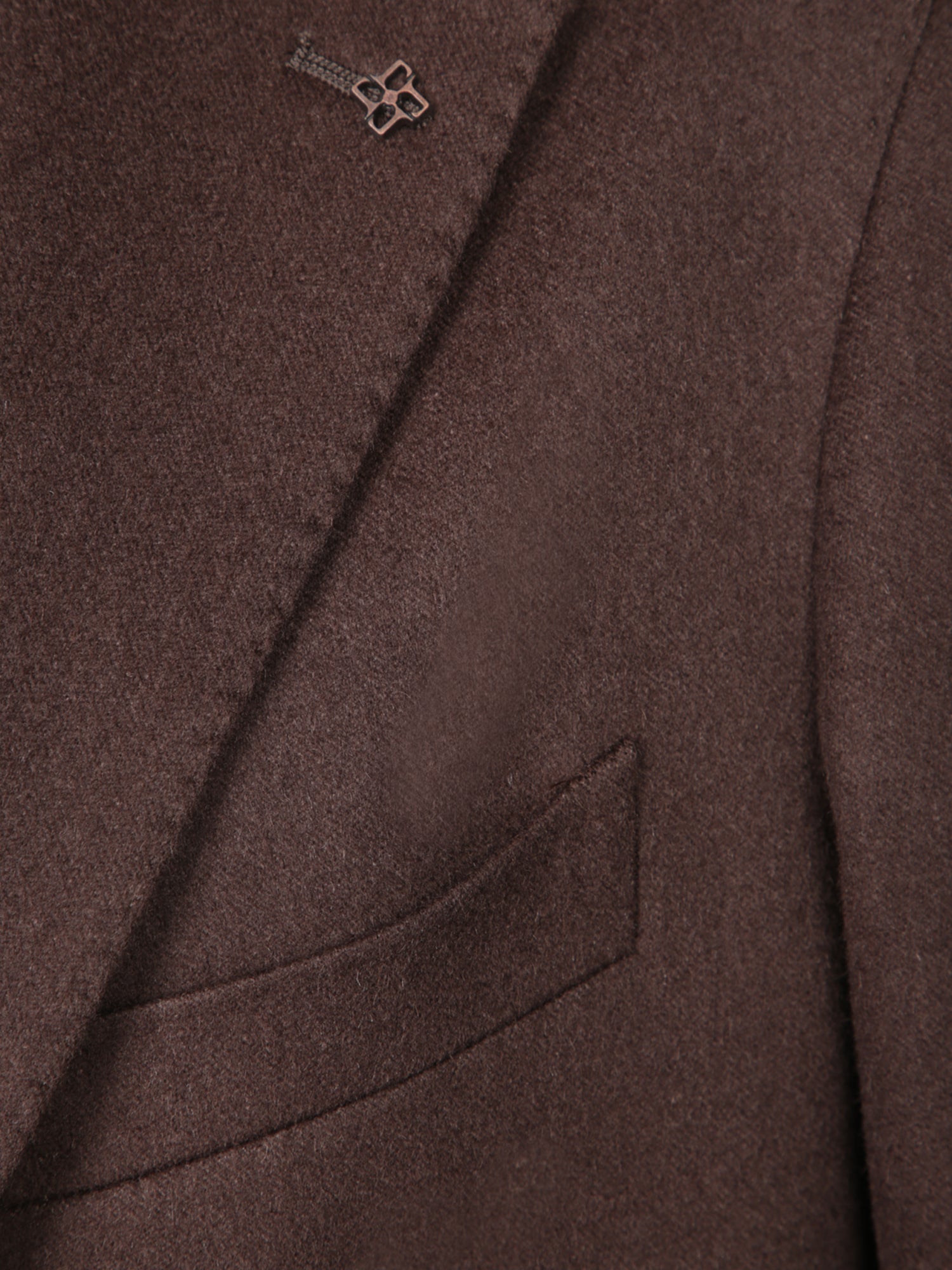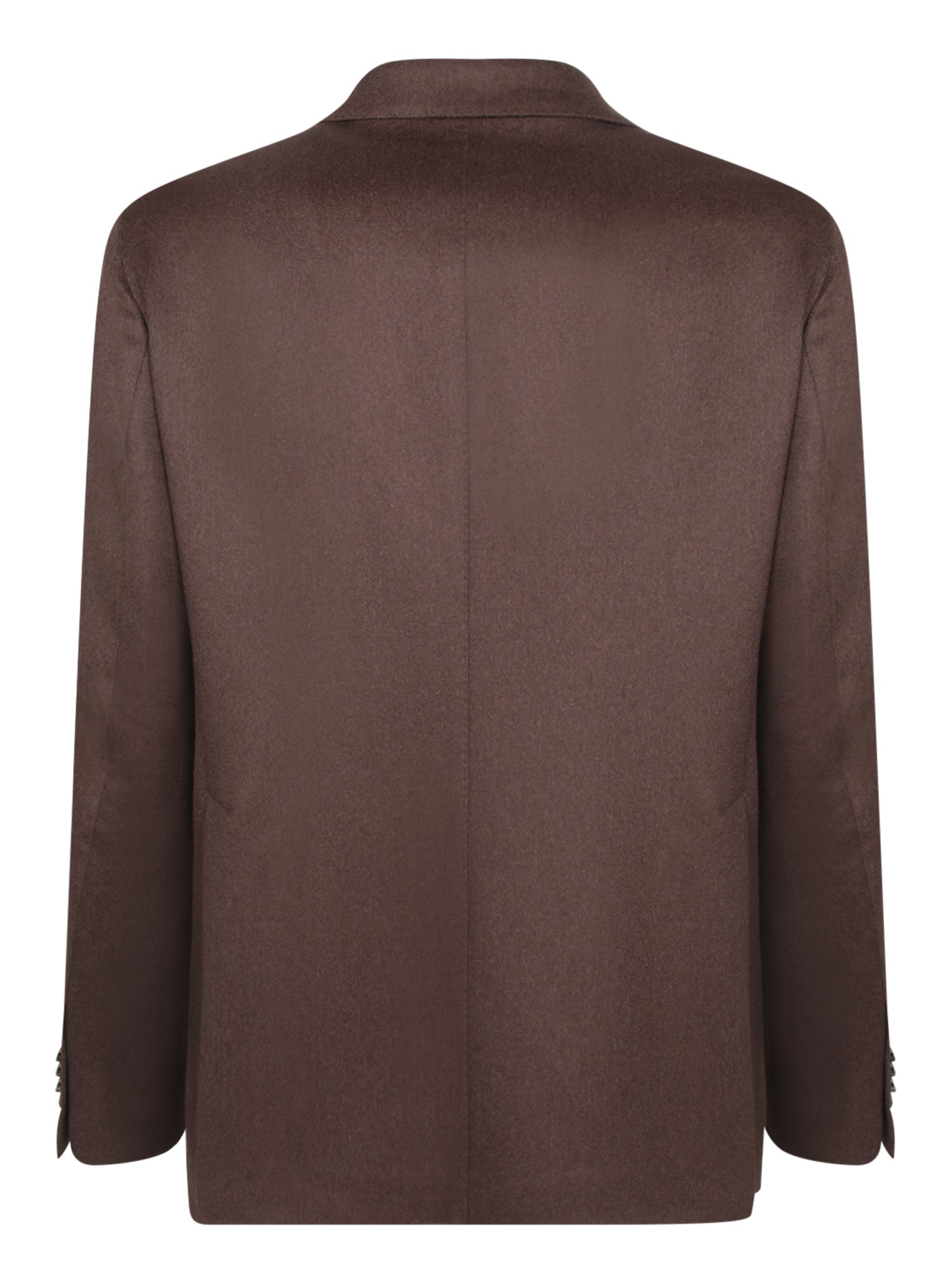 Single-breasted jacket with two-button closure. Brown wool fabric. Smooth inner lining.