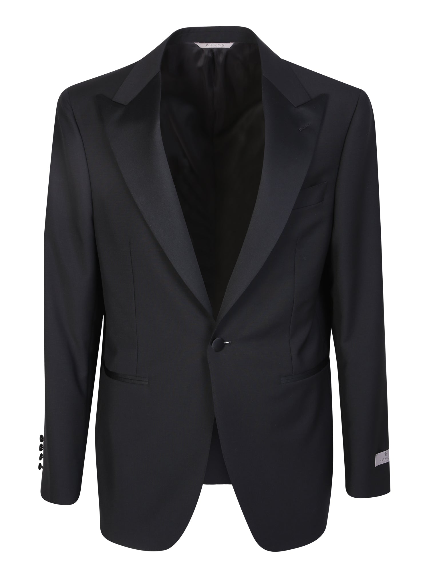 Classic black tuxedo in pure wool feautres silk lapels for a distinctive finishing touches