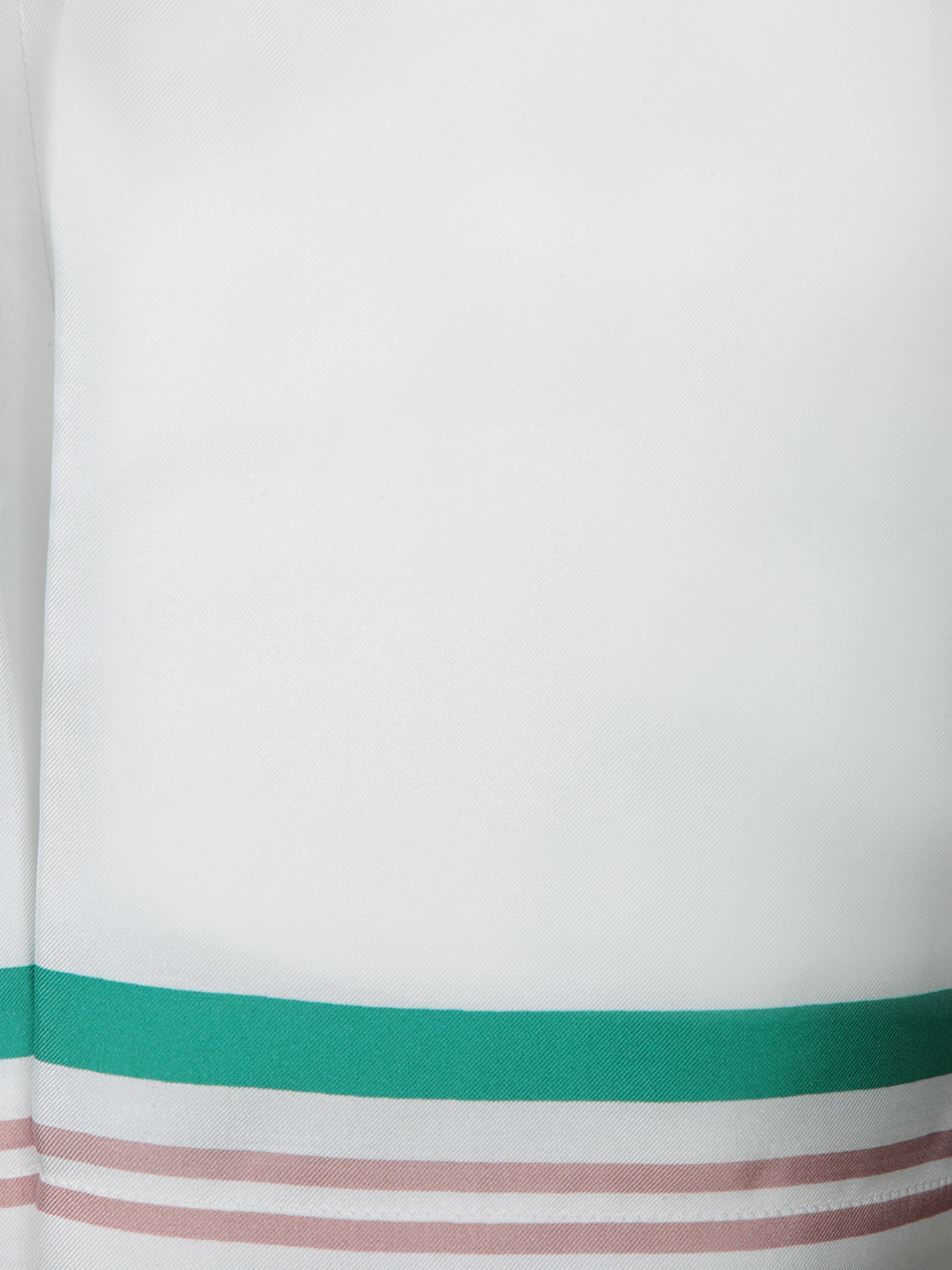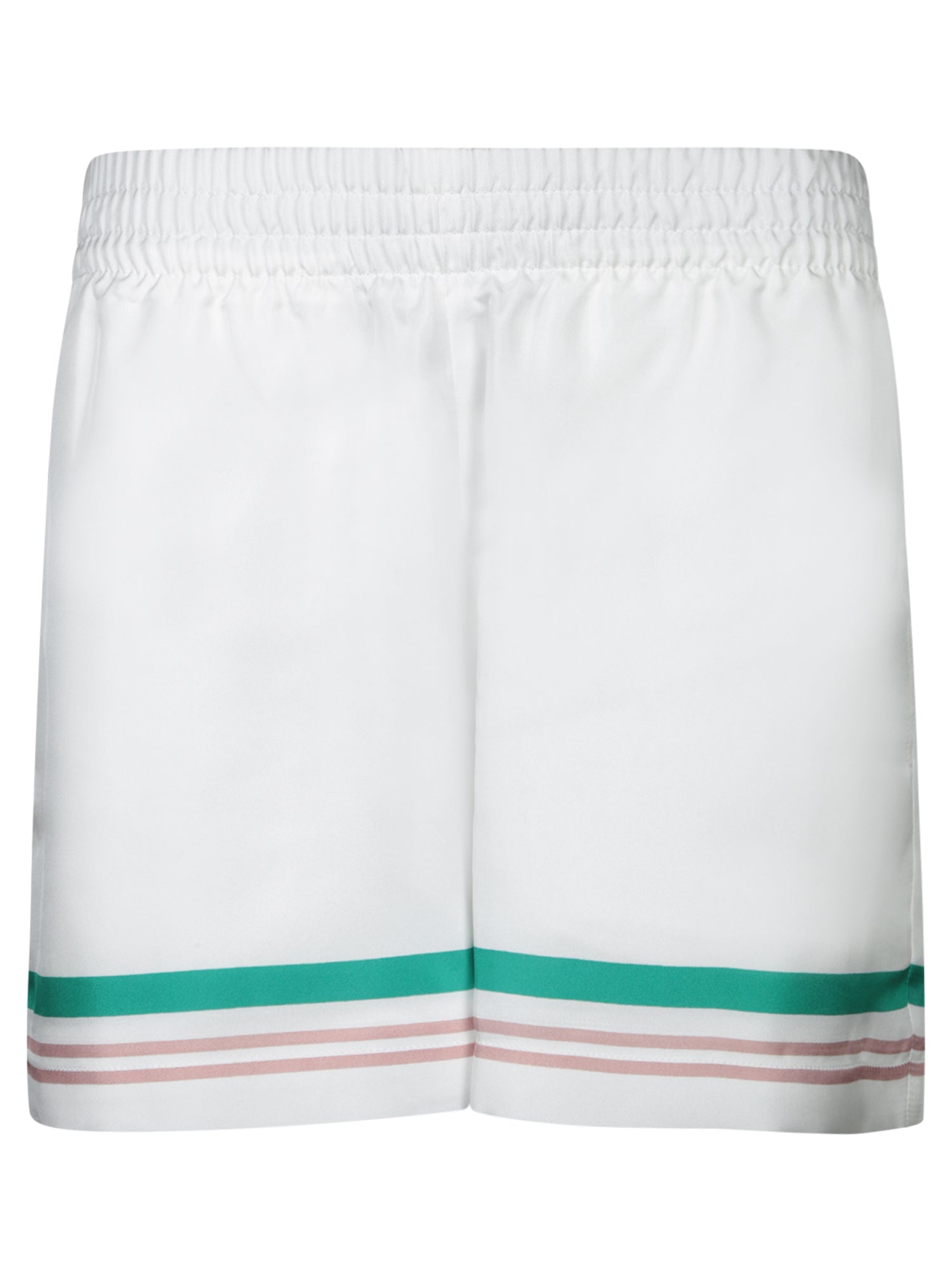 Elastic waistband. Two horizontal green and red stripes on a white base. Short cut.