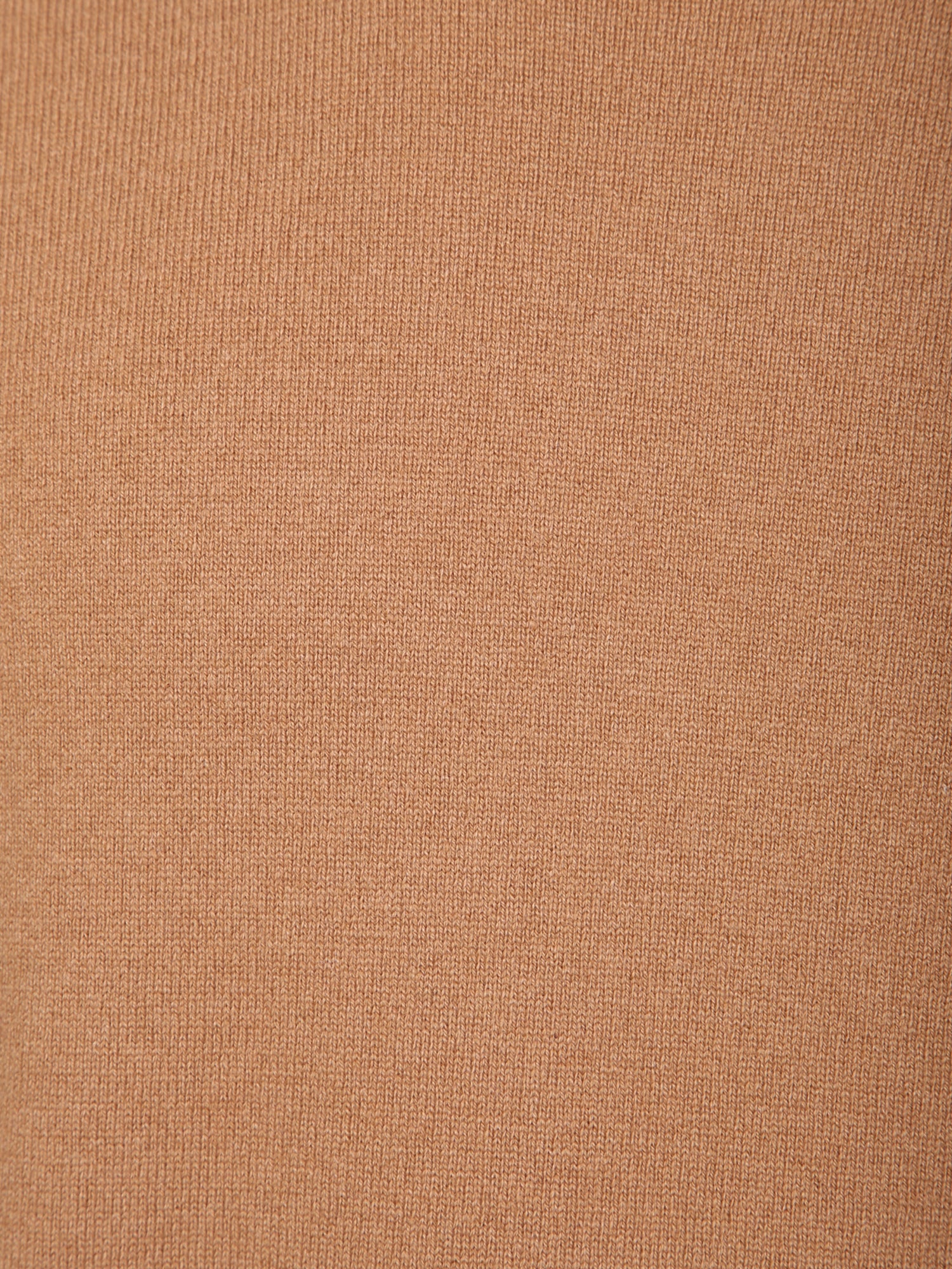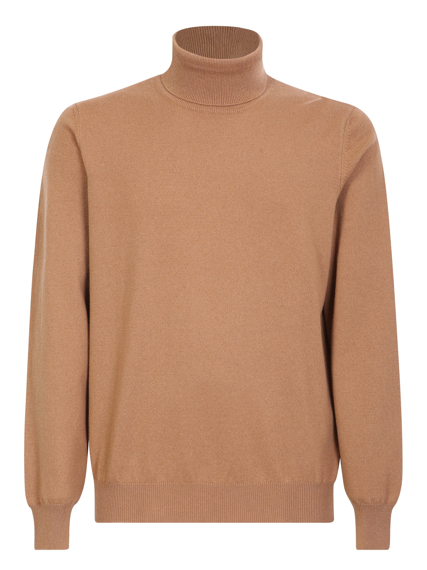 Roll neck. Long sleeves. Fine knit. Ribbed trim. Straight hem. Color: camel