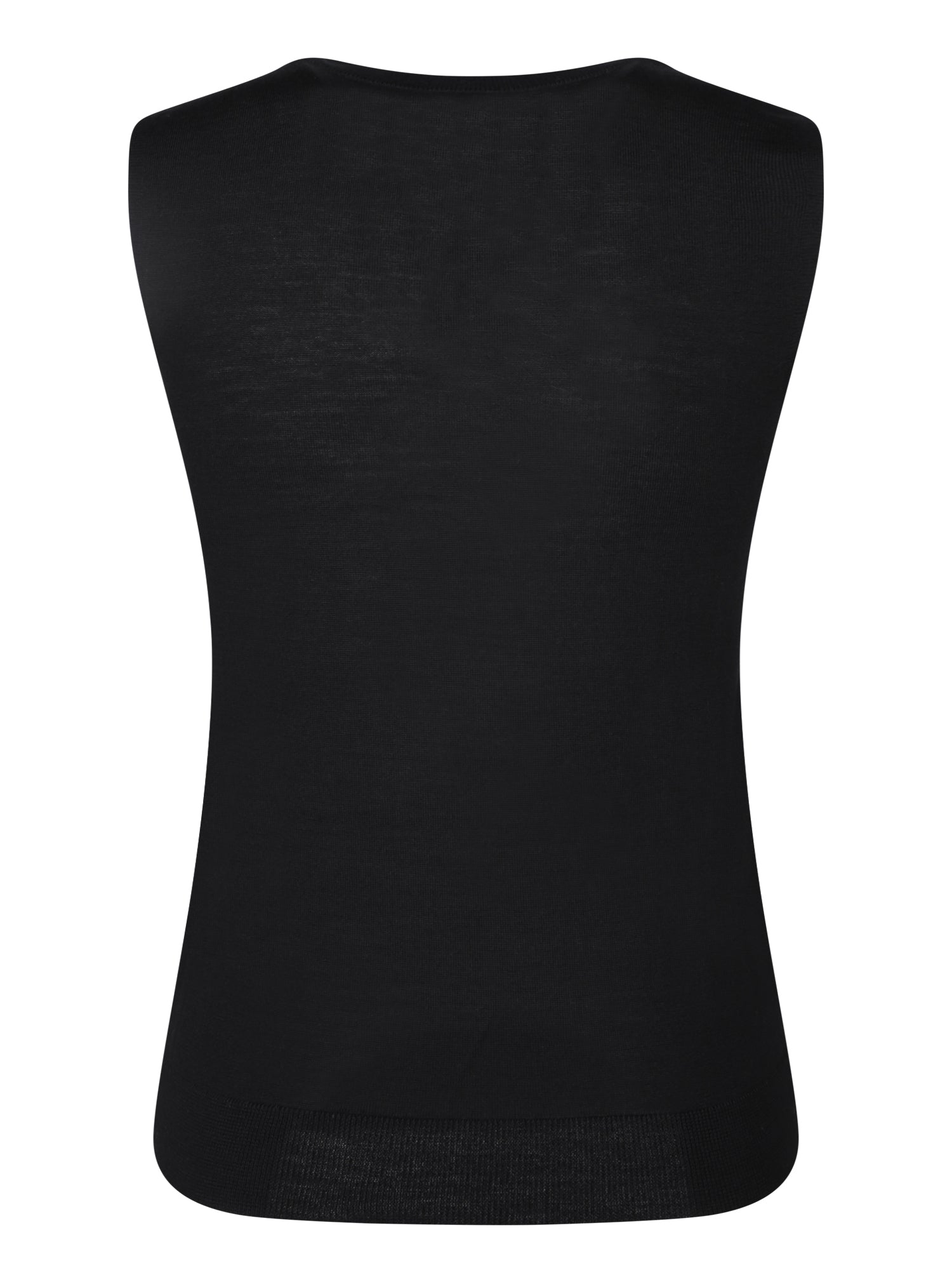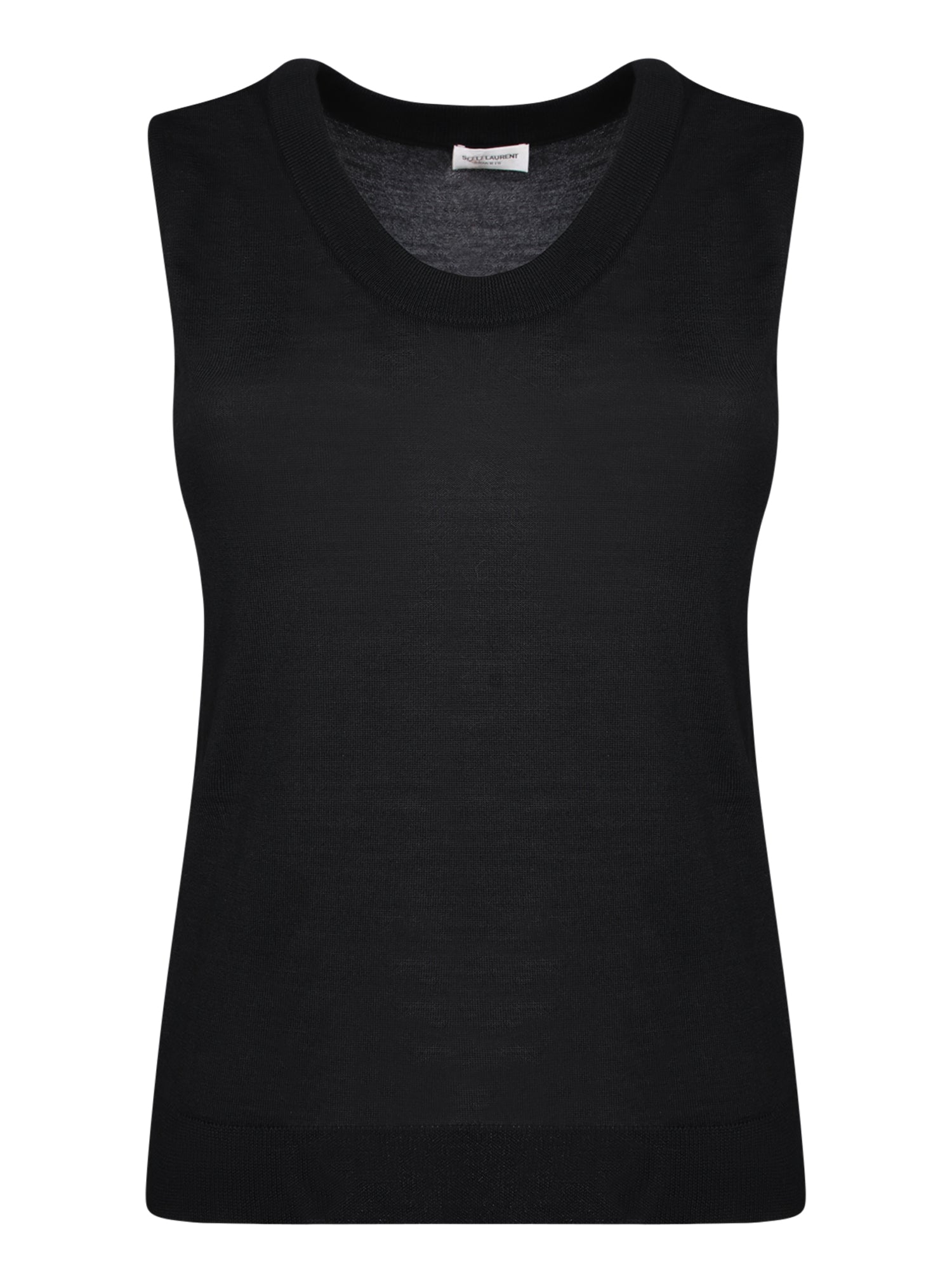 Sleeveless. Embroidered YSL to the front. V-neck.