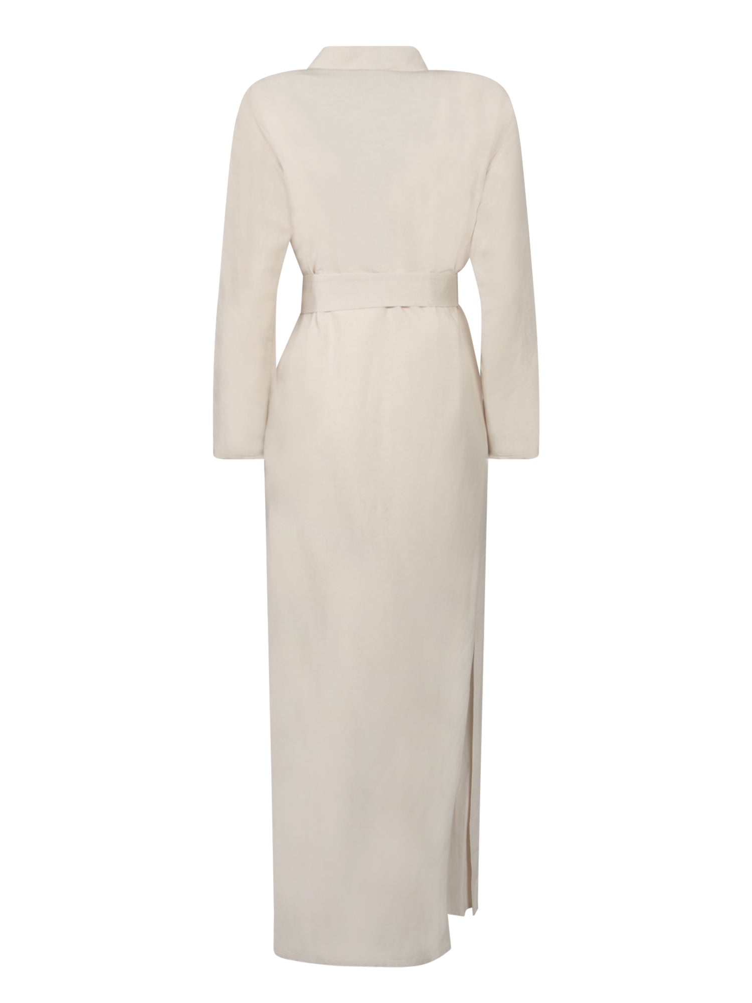 Long dress with belt, front button closure, classic collar, long sleeves.