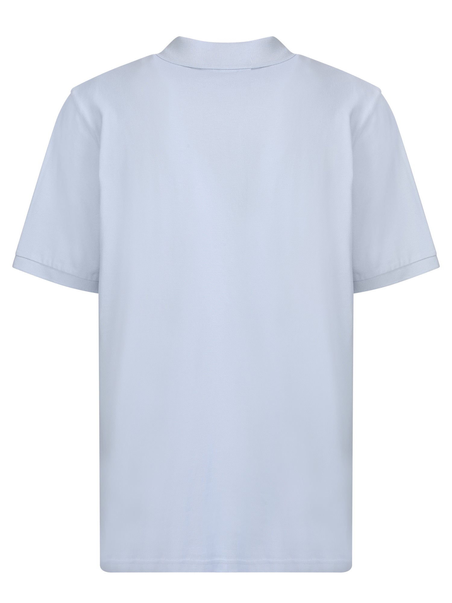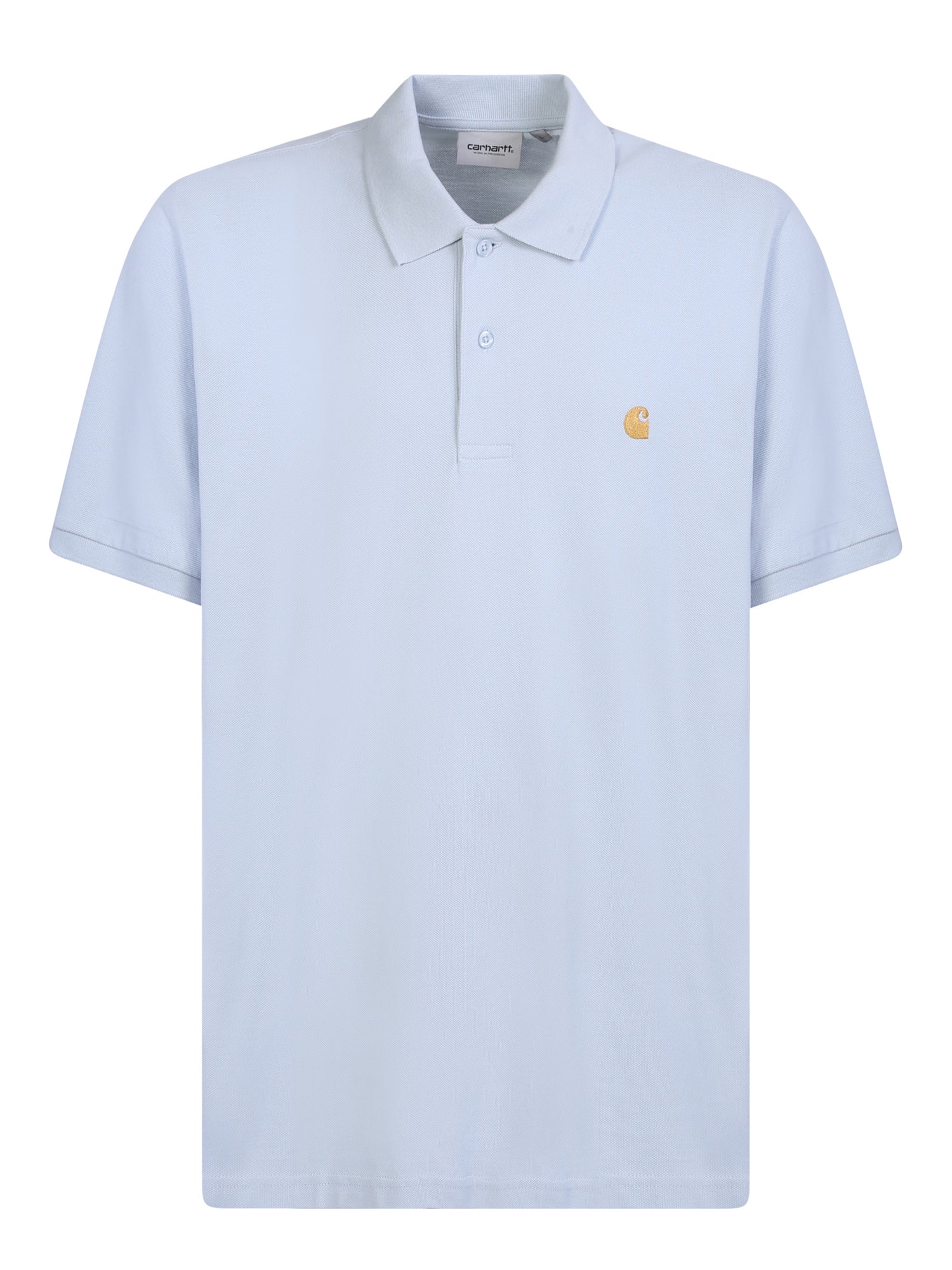 Polo collar. Short sleeves. Embroidered logo at the chest. Front button placket. Straight hem. Color: light blue