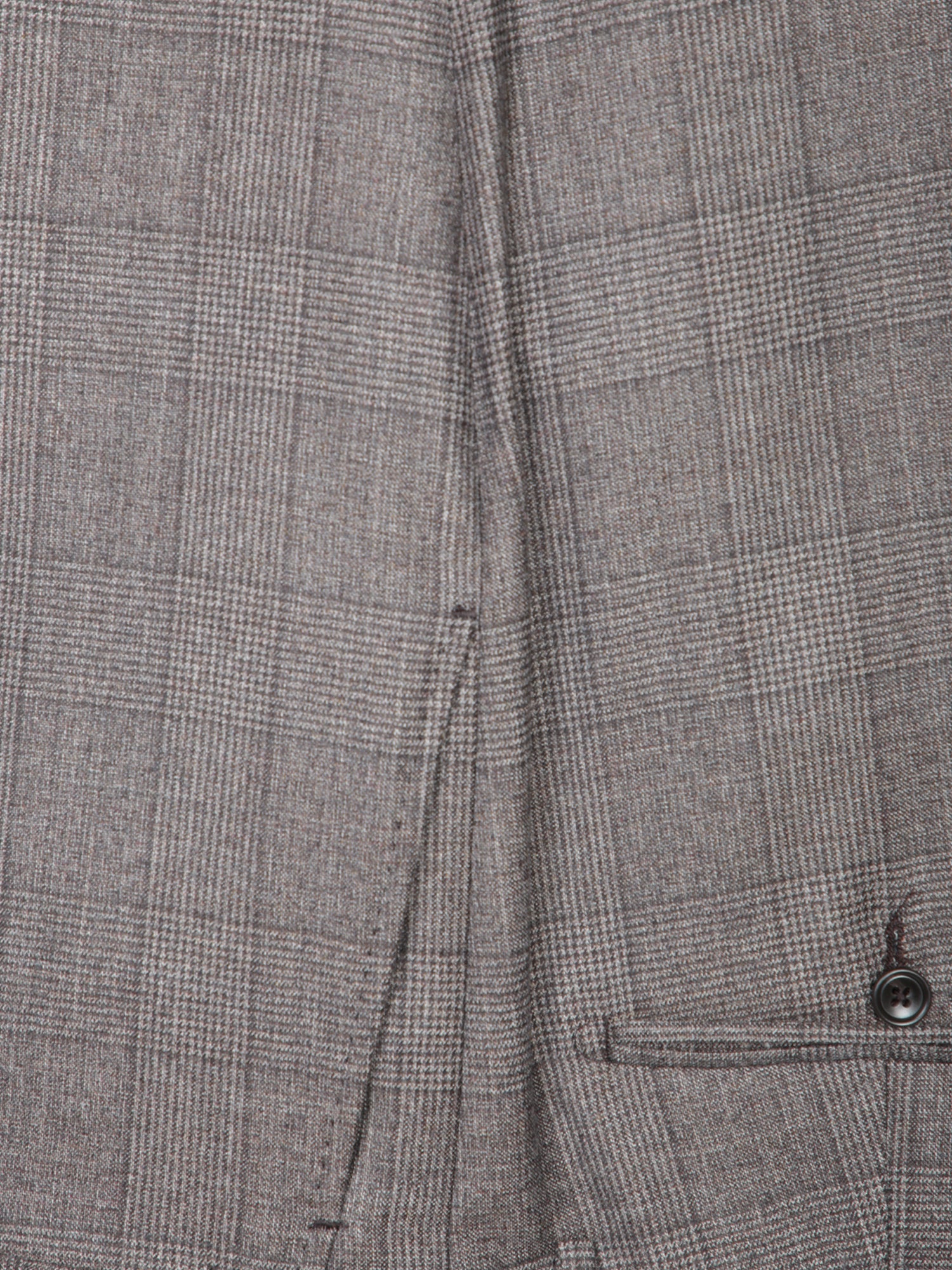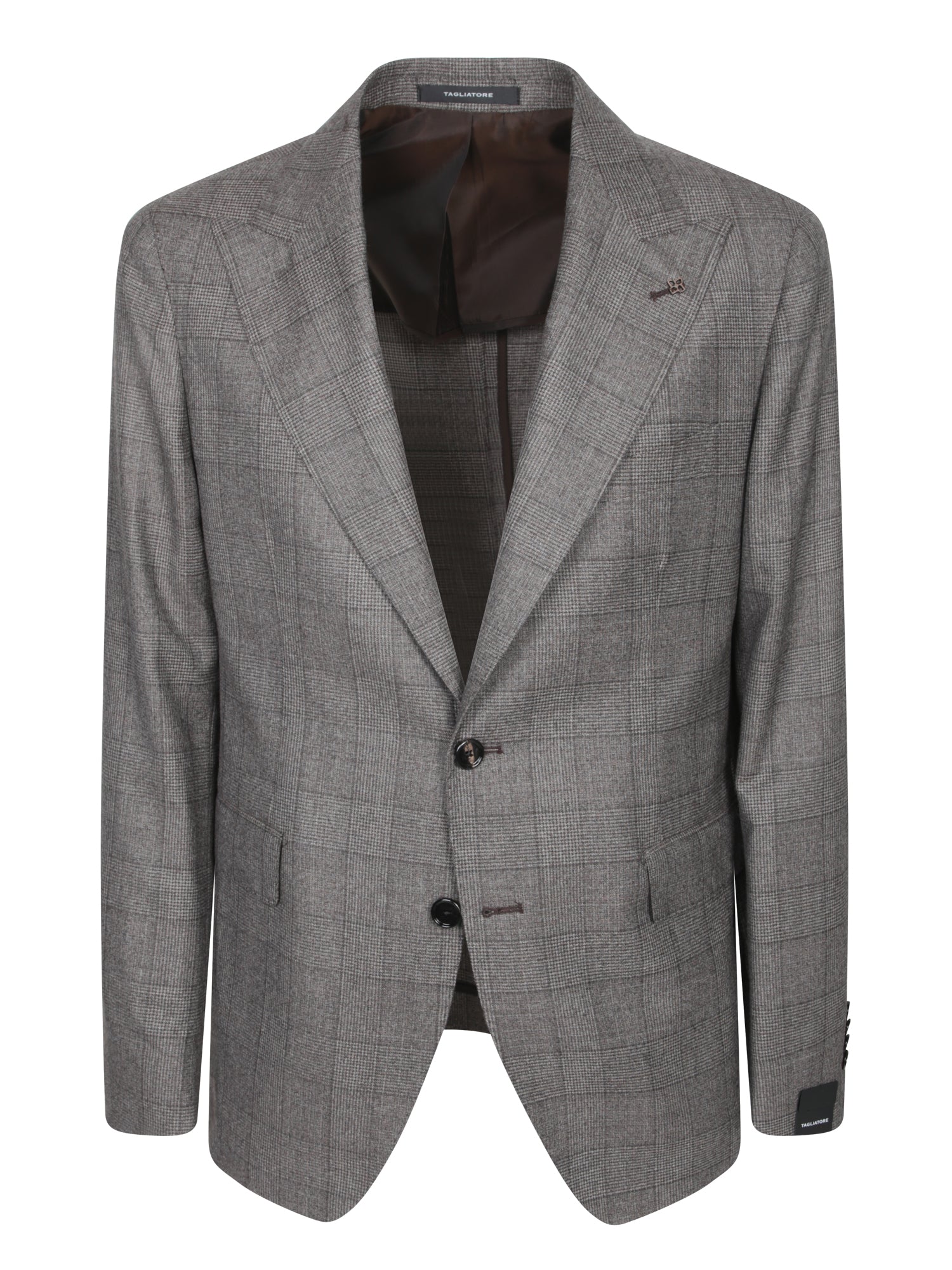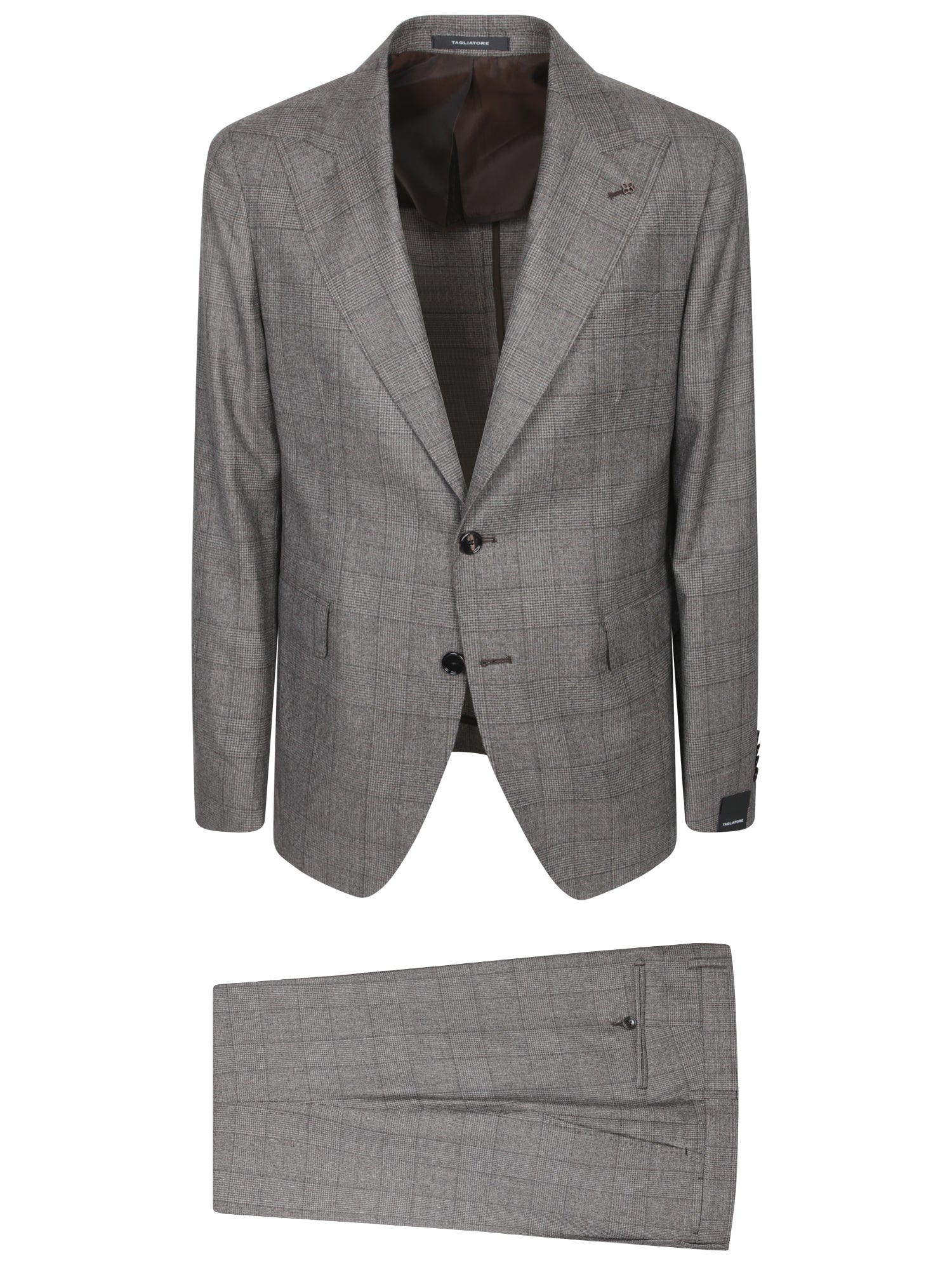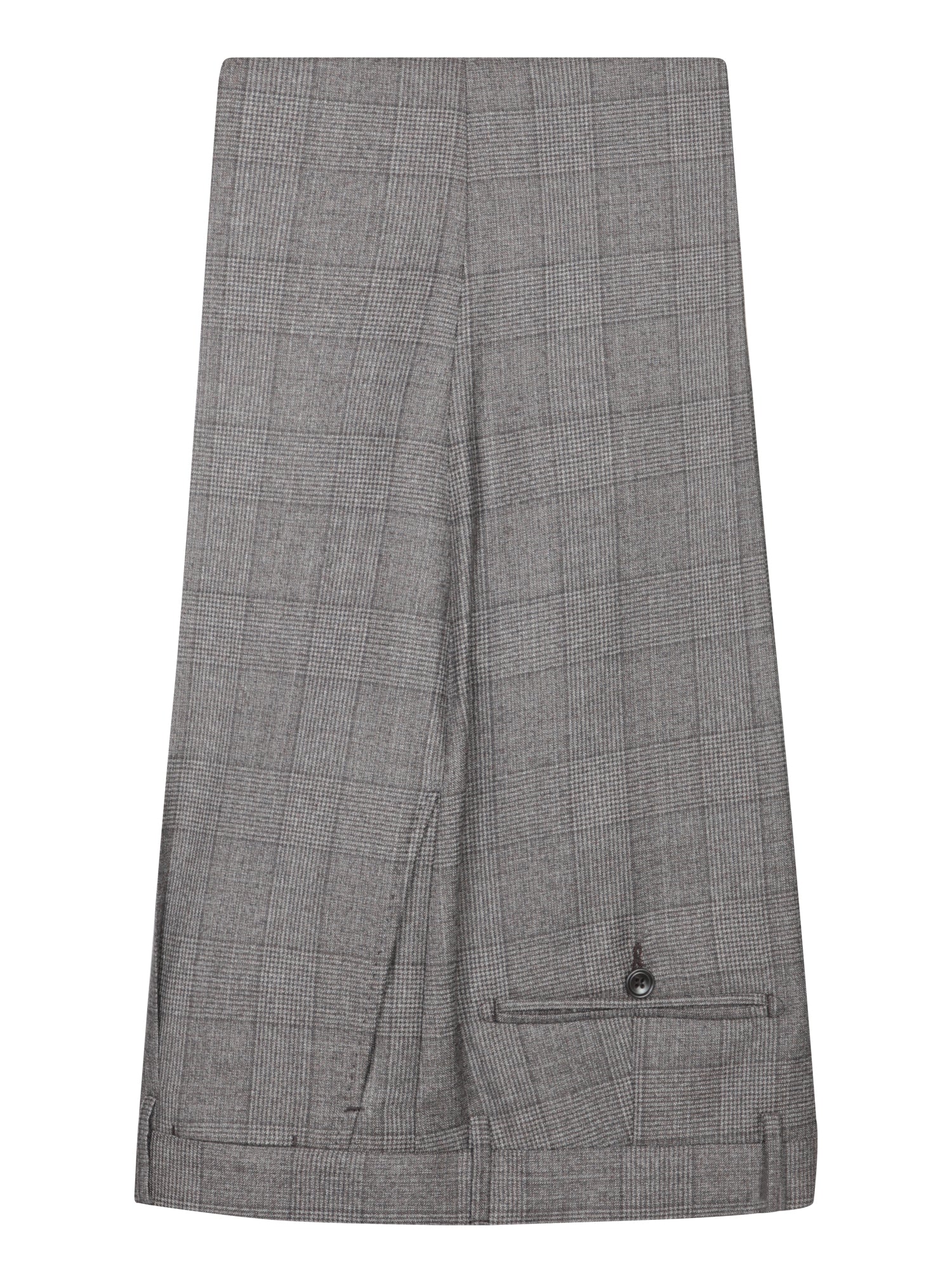 Checkered fabric suit. Jacket with classic lapels, two front buttons, and flap pockets. Straight cut trousers with zip closure.