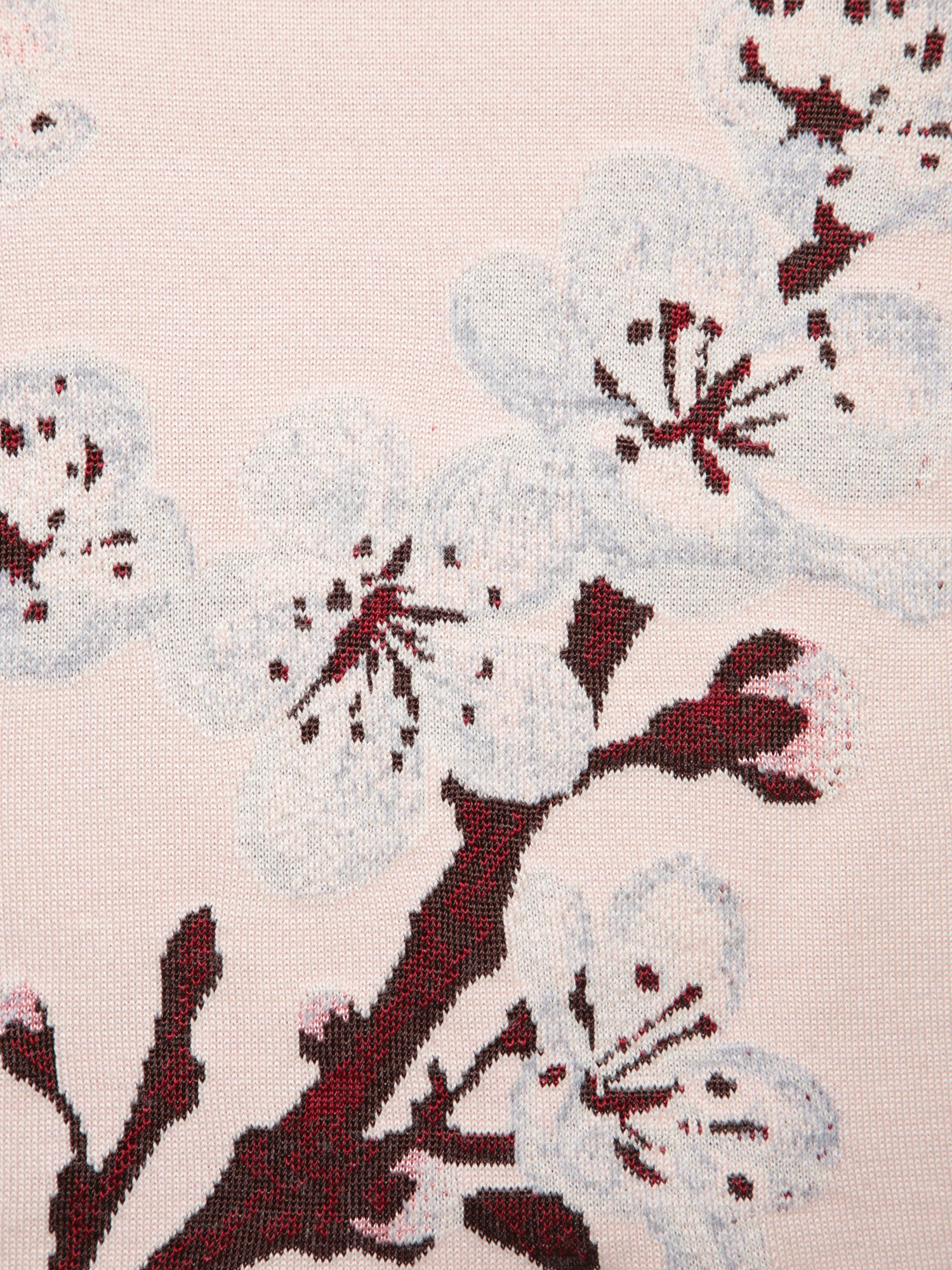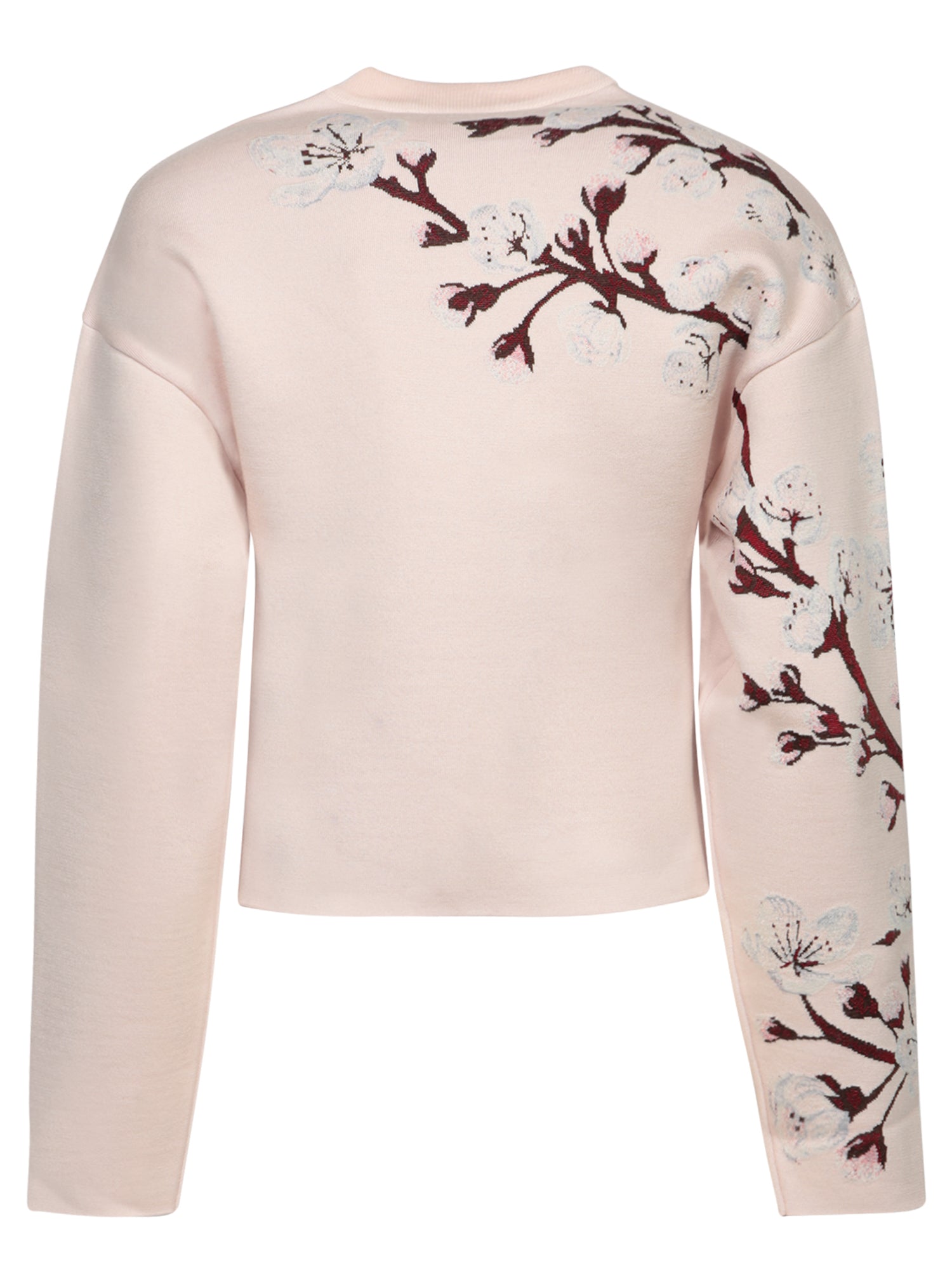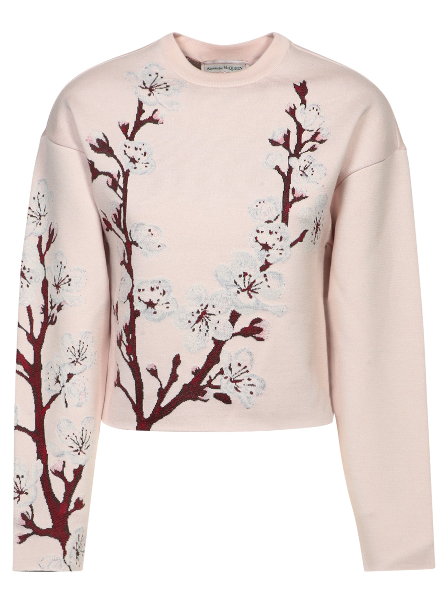 Exclusive Alexander McQueen sweater in delicate pink silk, embellished with a refined Cherry Blossom-themed embroidery, evoking the beauty of Japanese spring.