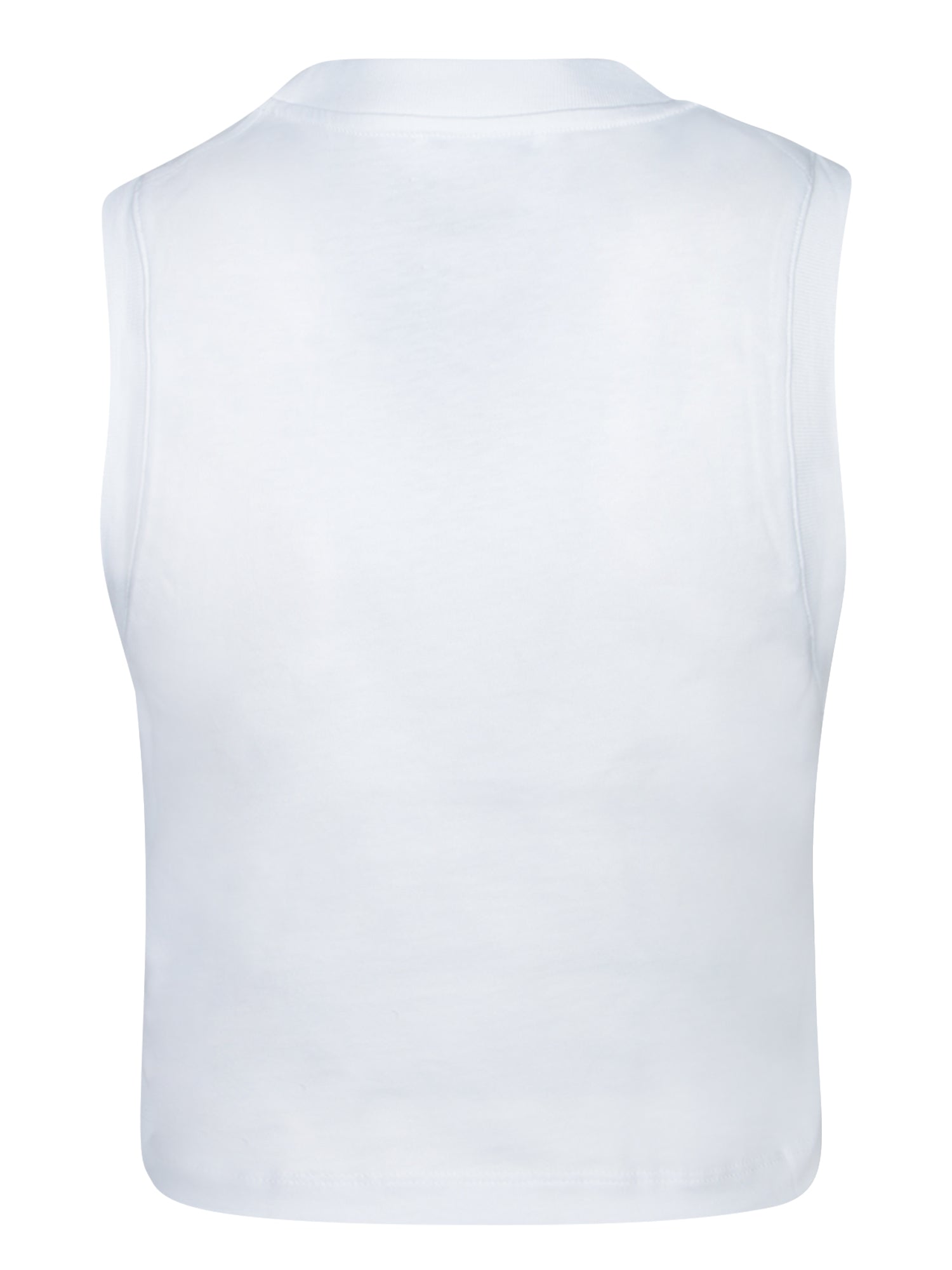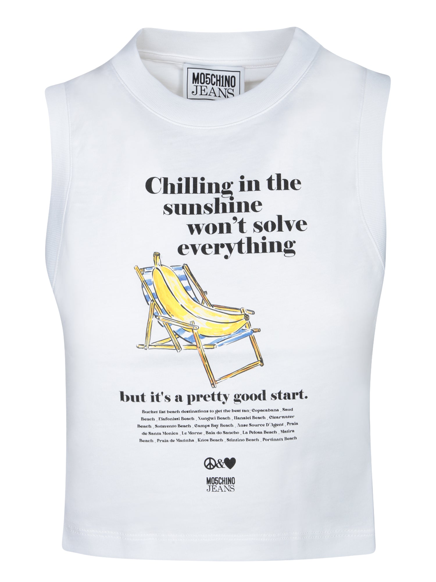 Sleeveless white cotton tank top. Colorful front graphic with text and Moschino Jeans logo detail.