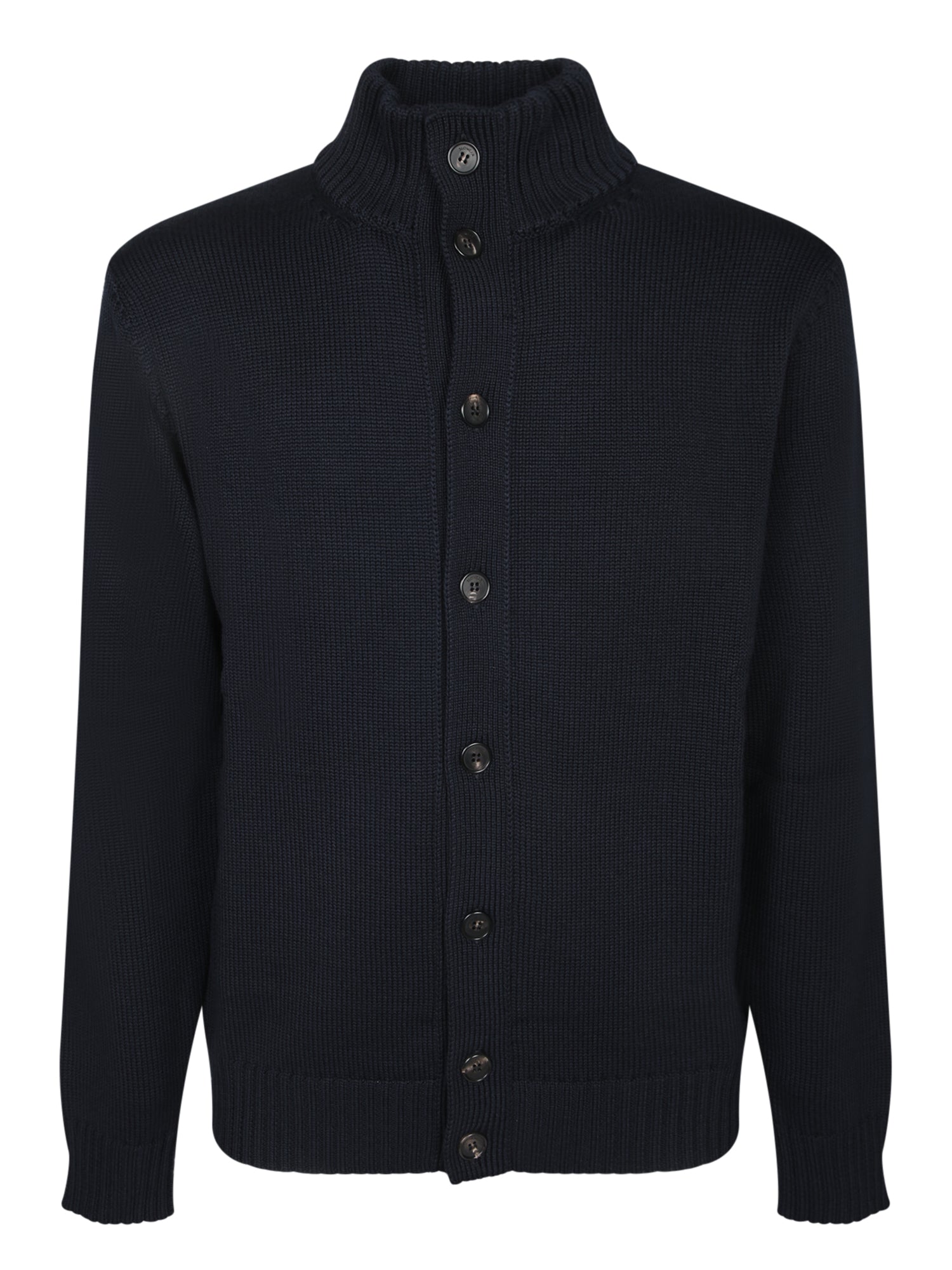 Wool cardigan, high collar, front button closure, long sleeves, ribbed hem and cuffs.