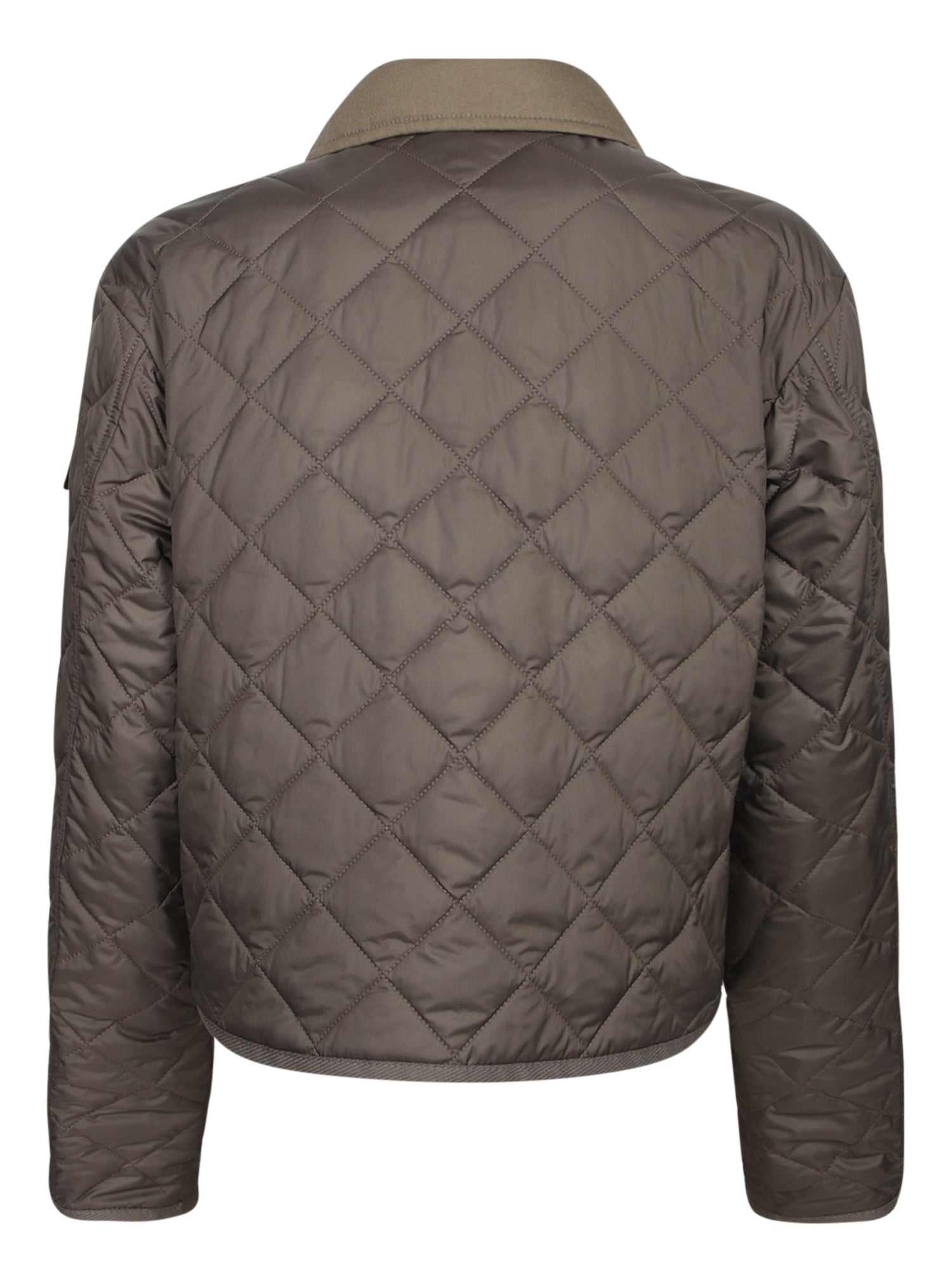 Quilted jacket with contrast collar, golden button front closure, long sleeves, four front pockets.