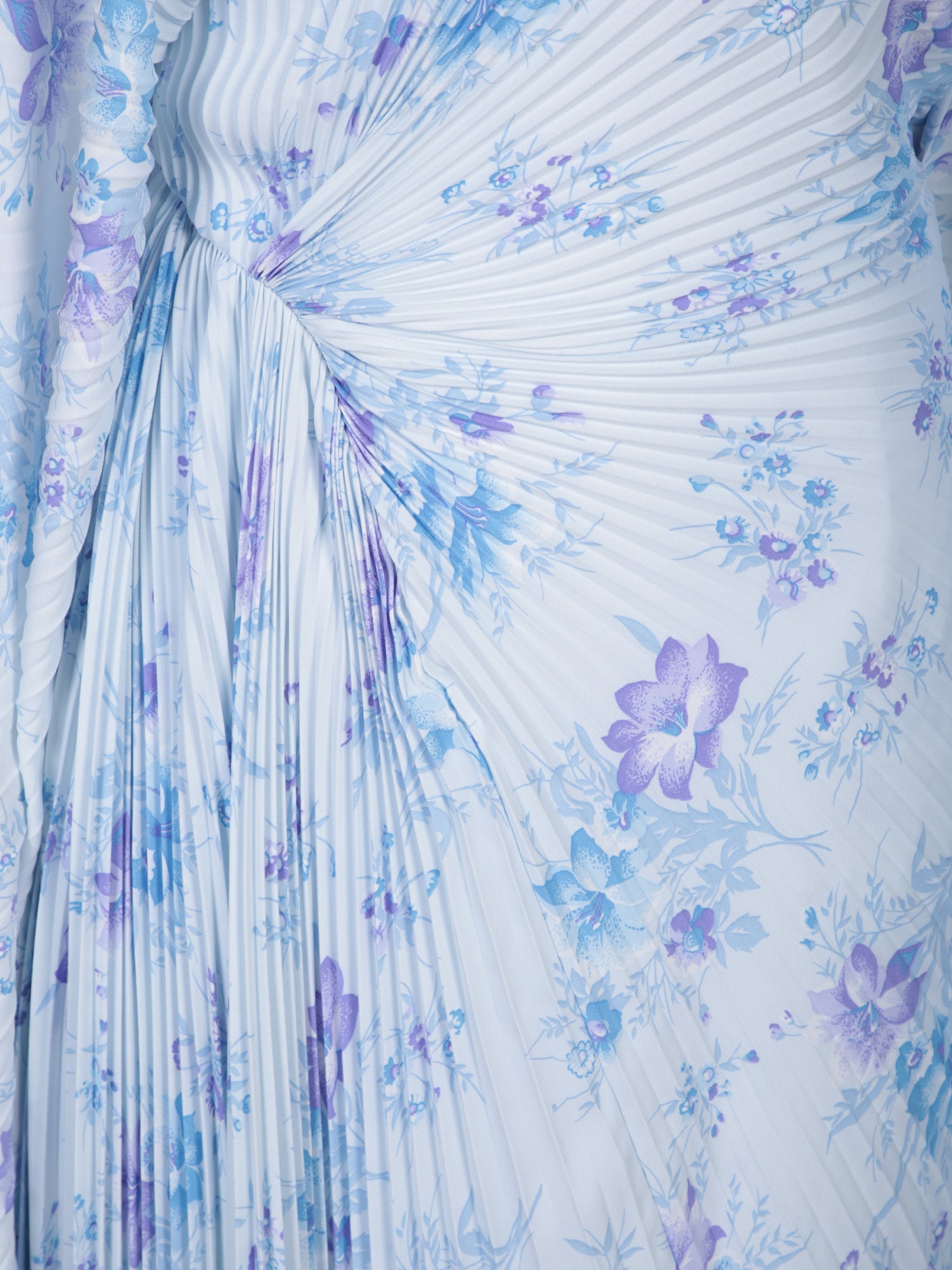 Long dress with long sleeves, floral print, and pleated detail. Lightweight and translucent fabric.