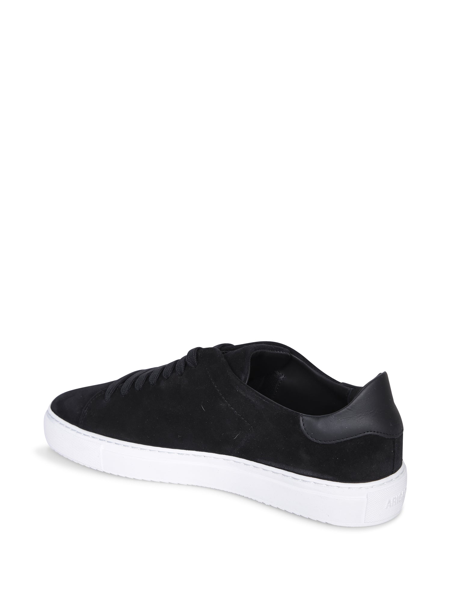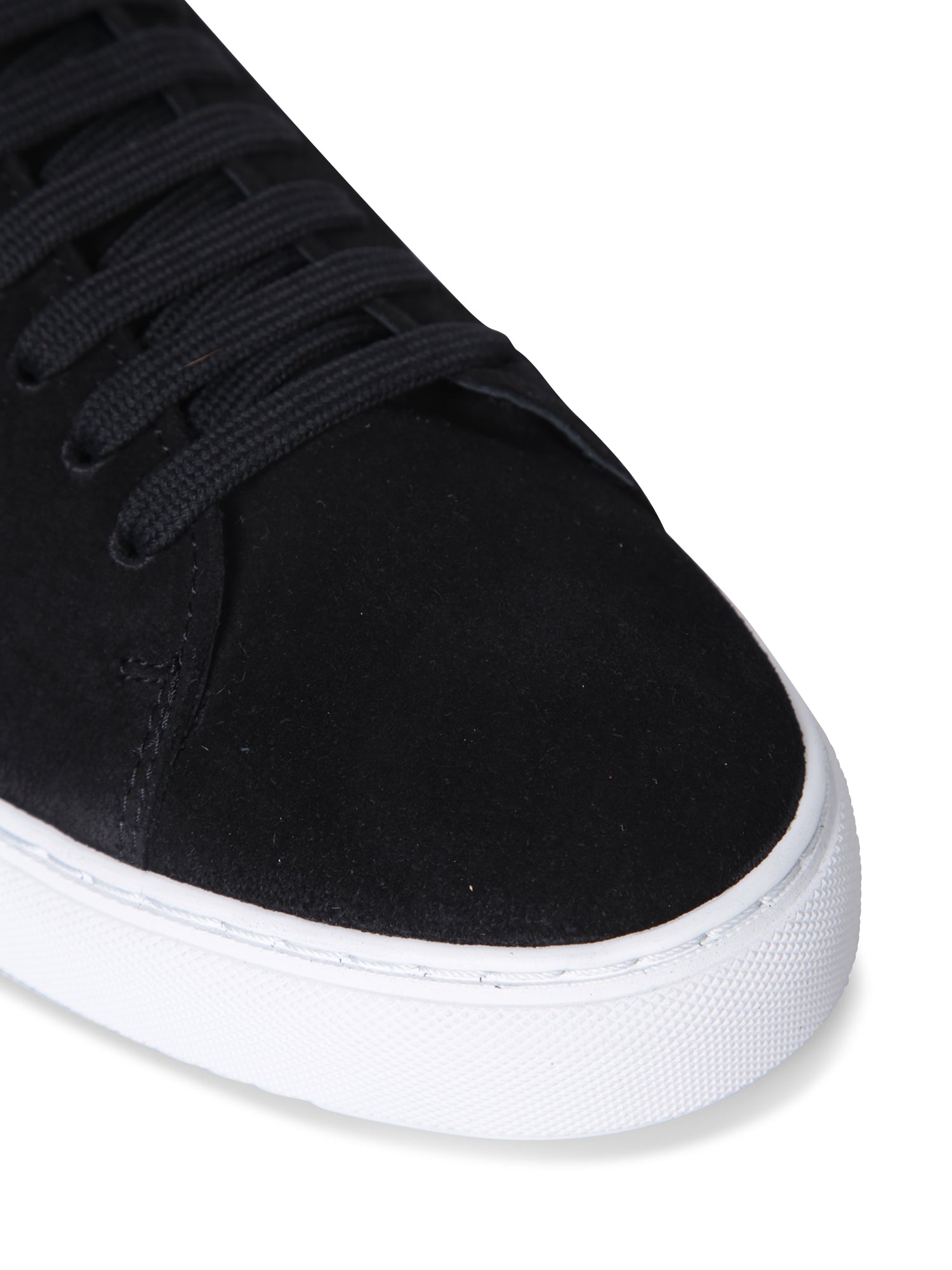 Black suede sneakers with a white sole. Subtle Arigato logo on the outer side.