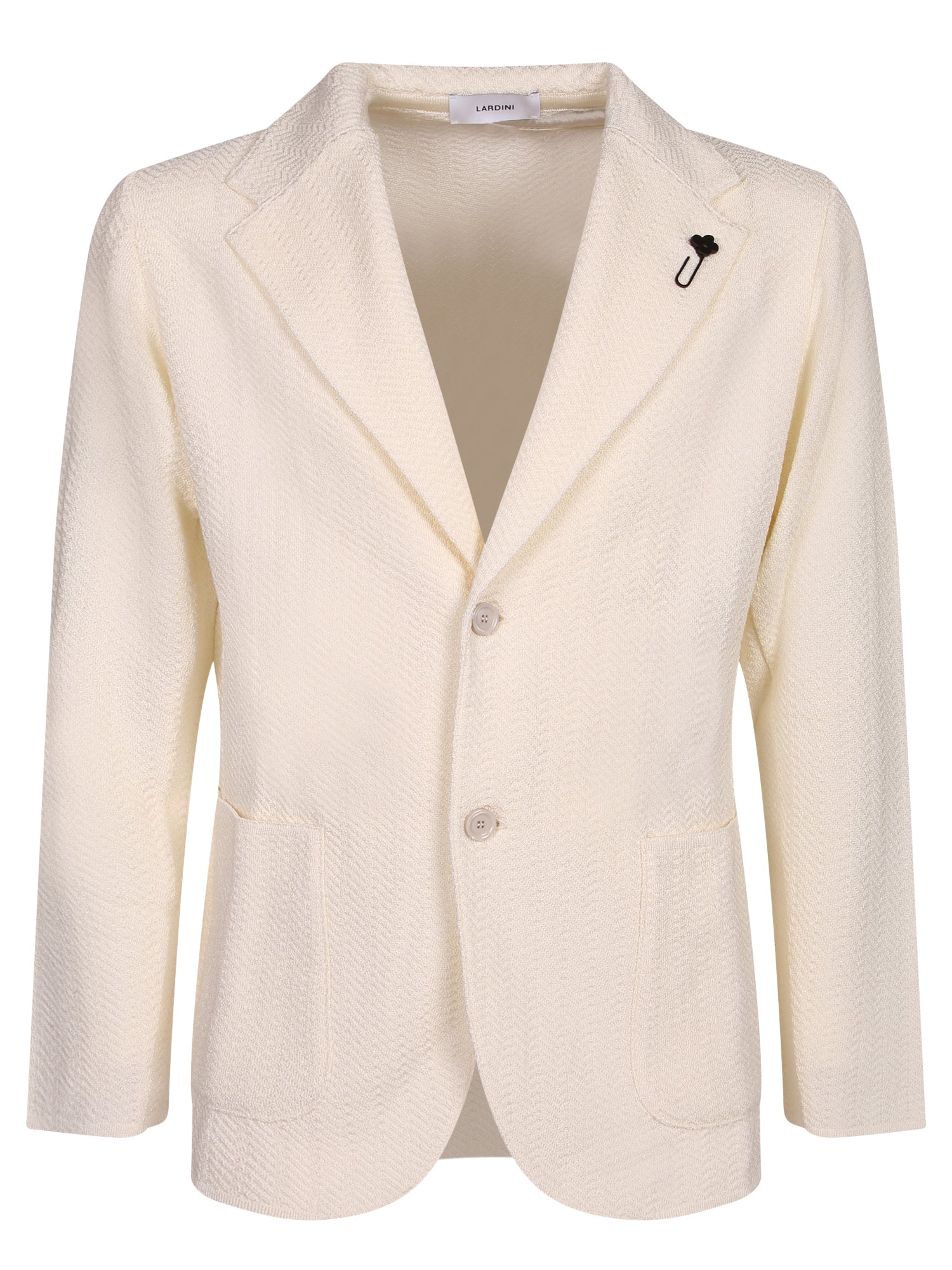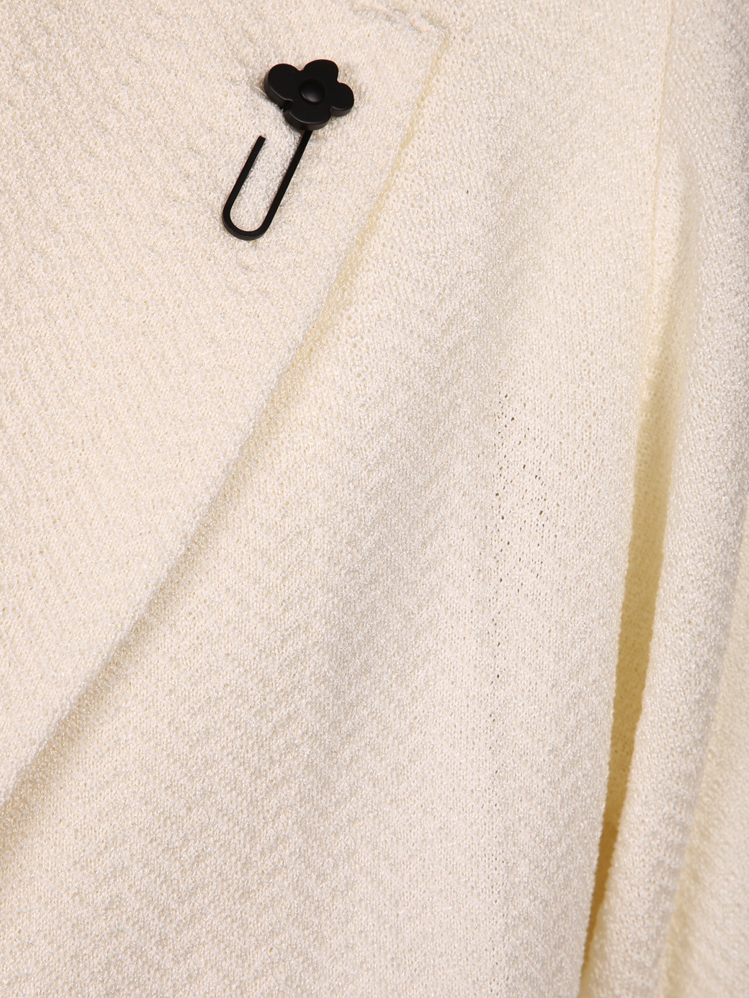 Herringbone knit fabric. Cream color. Two-button closure. Patch pockets. Flower detail on lapel.