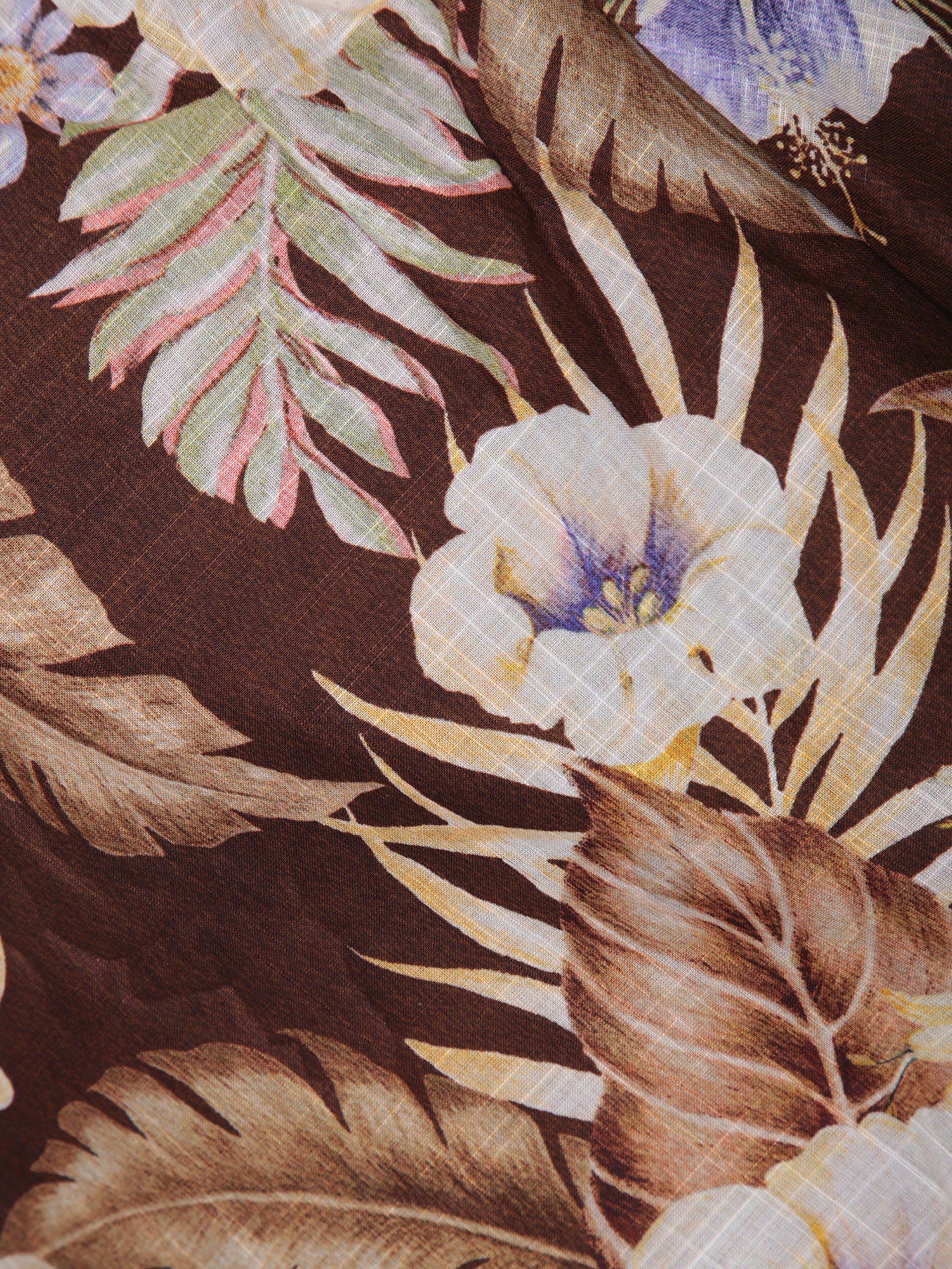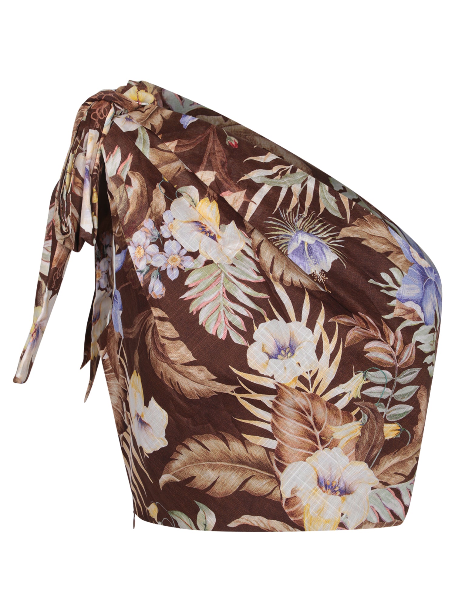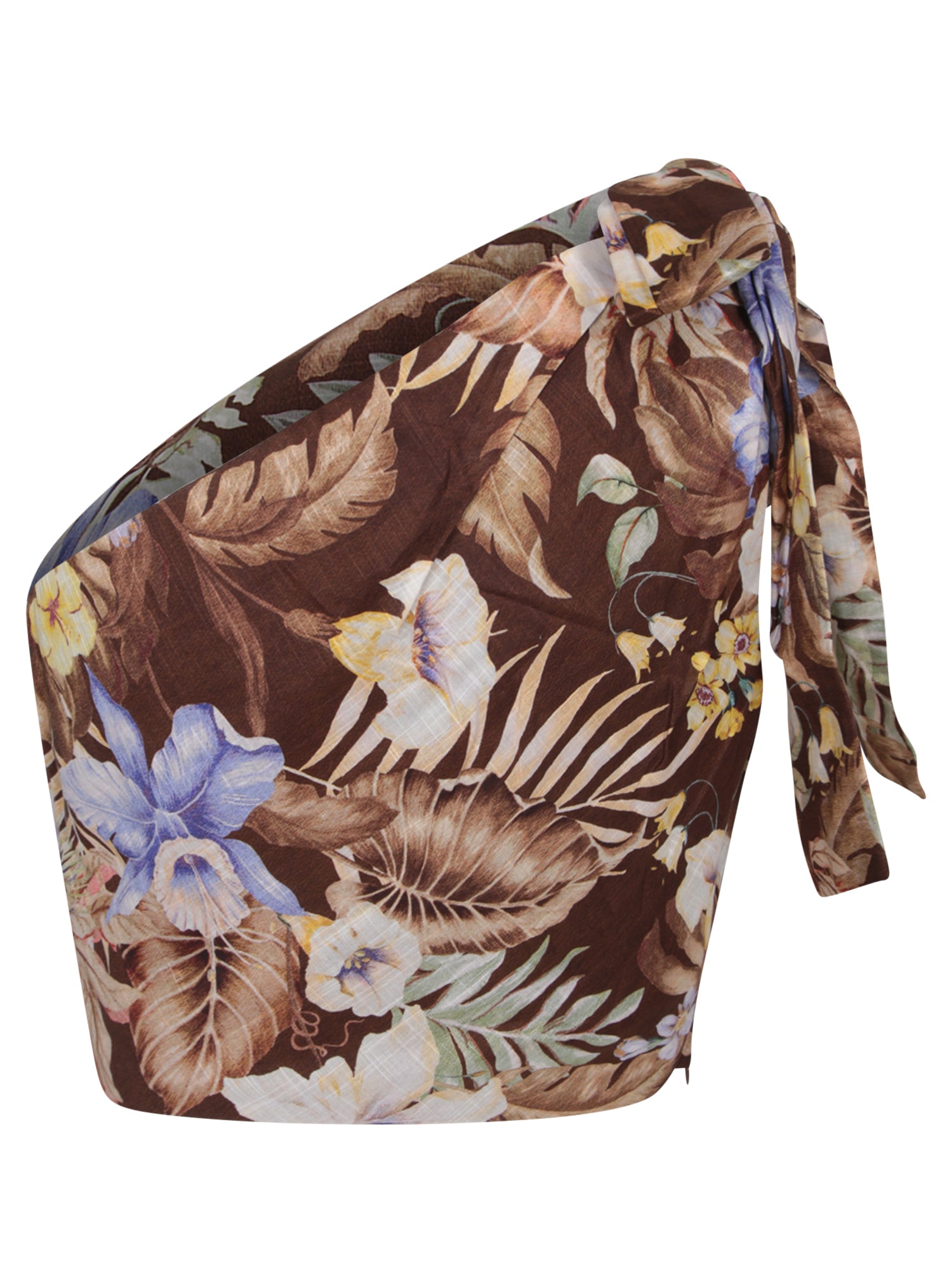 Asymmetric crop top with floral print. Adjustable side tie. Light and fluid fabric.