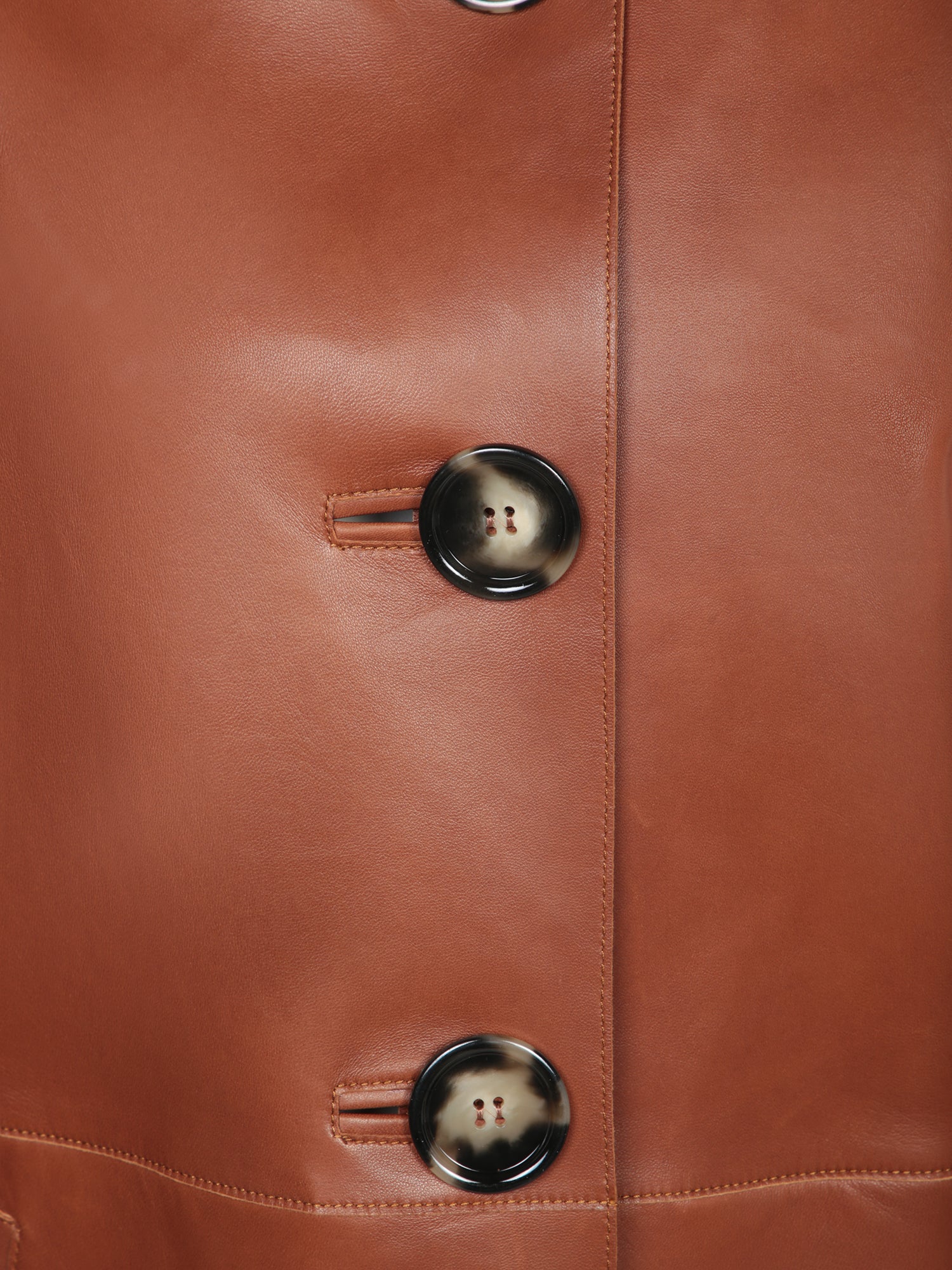 Smooth leather jacket, snap button closure, long sleeves with adjustable cuffs.