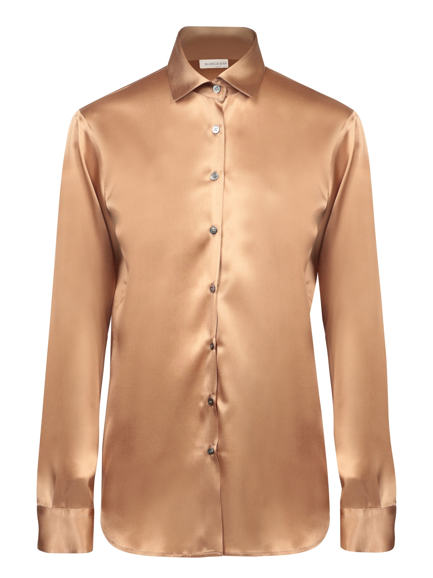 Exquisite Blanca Vita cognac silk satin shirt, featuring an elegant cut that enhances its sophisticated silhouette.