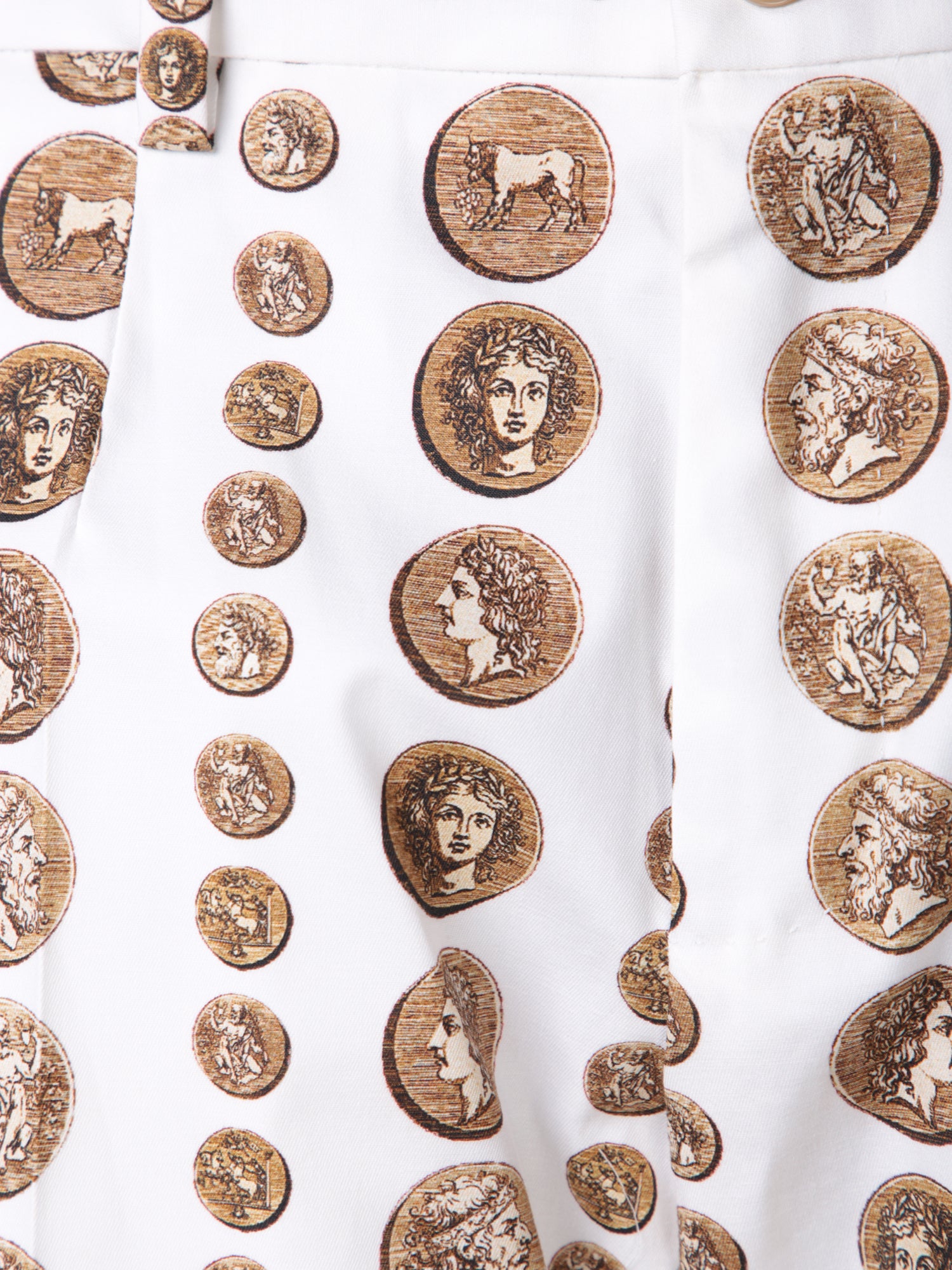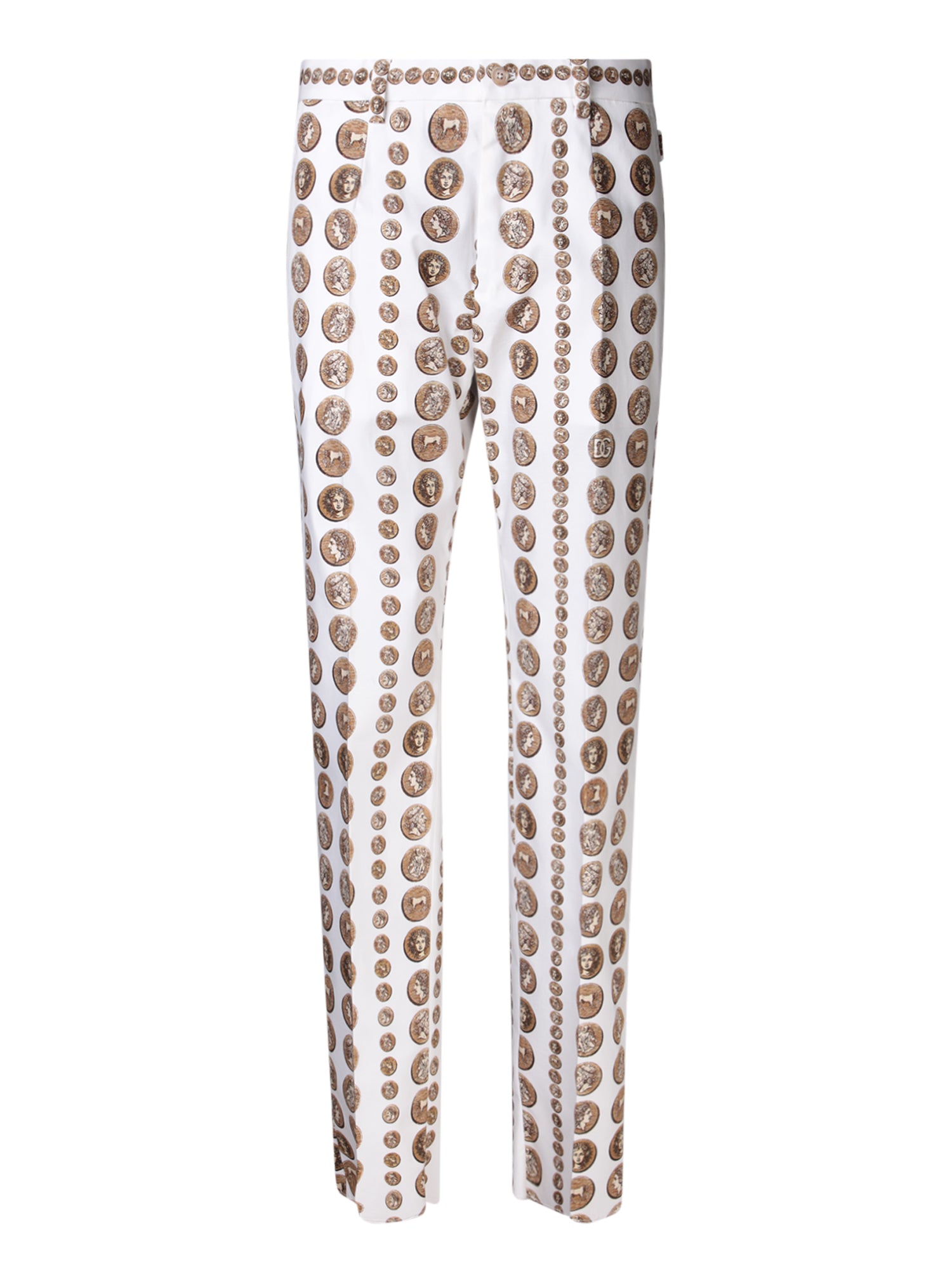 Mid rise. Front button and zip fastening. Belt loops. Side adjusters with buttons. Two side pockets. Two rear pockets. All-over coin print. Regular fit. Color: white/gold