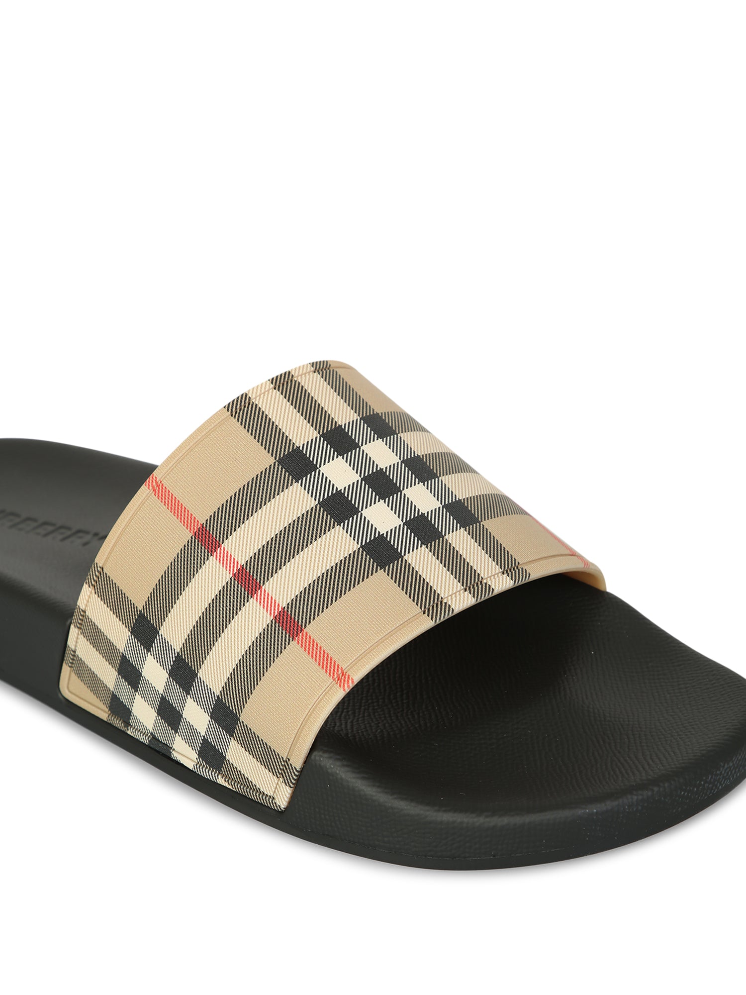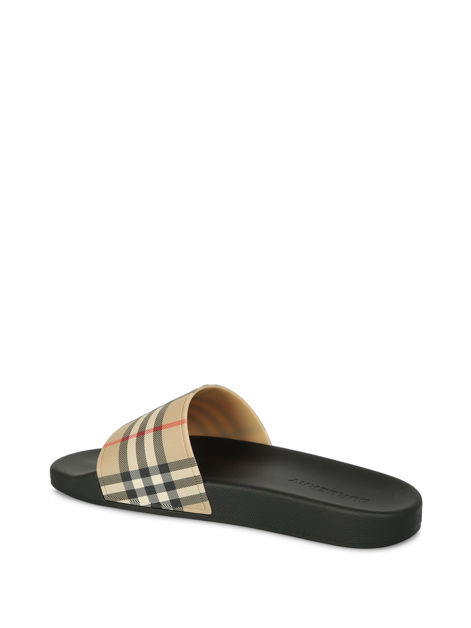 Contemporary, cool and Vintage for the checked logo. Burberry pool slides give a casual touch to the look