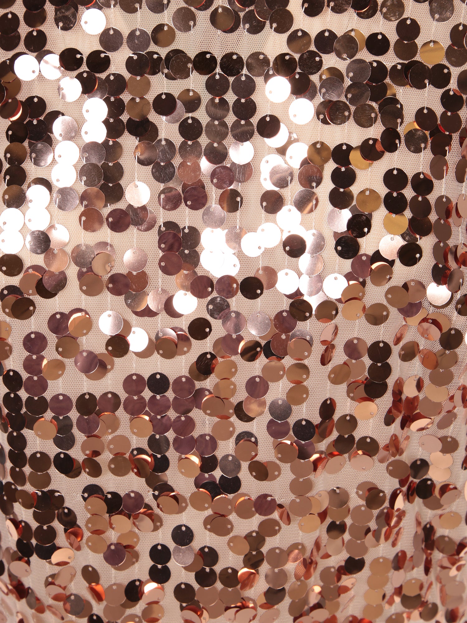 Short-sleeved top, fully covered in copper-colored sequins. Round neckline.