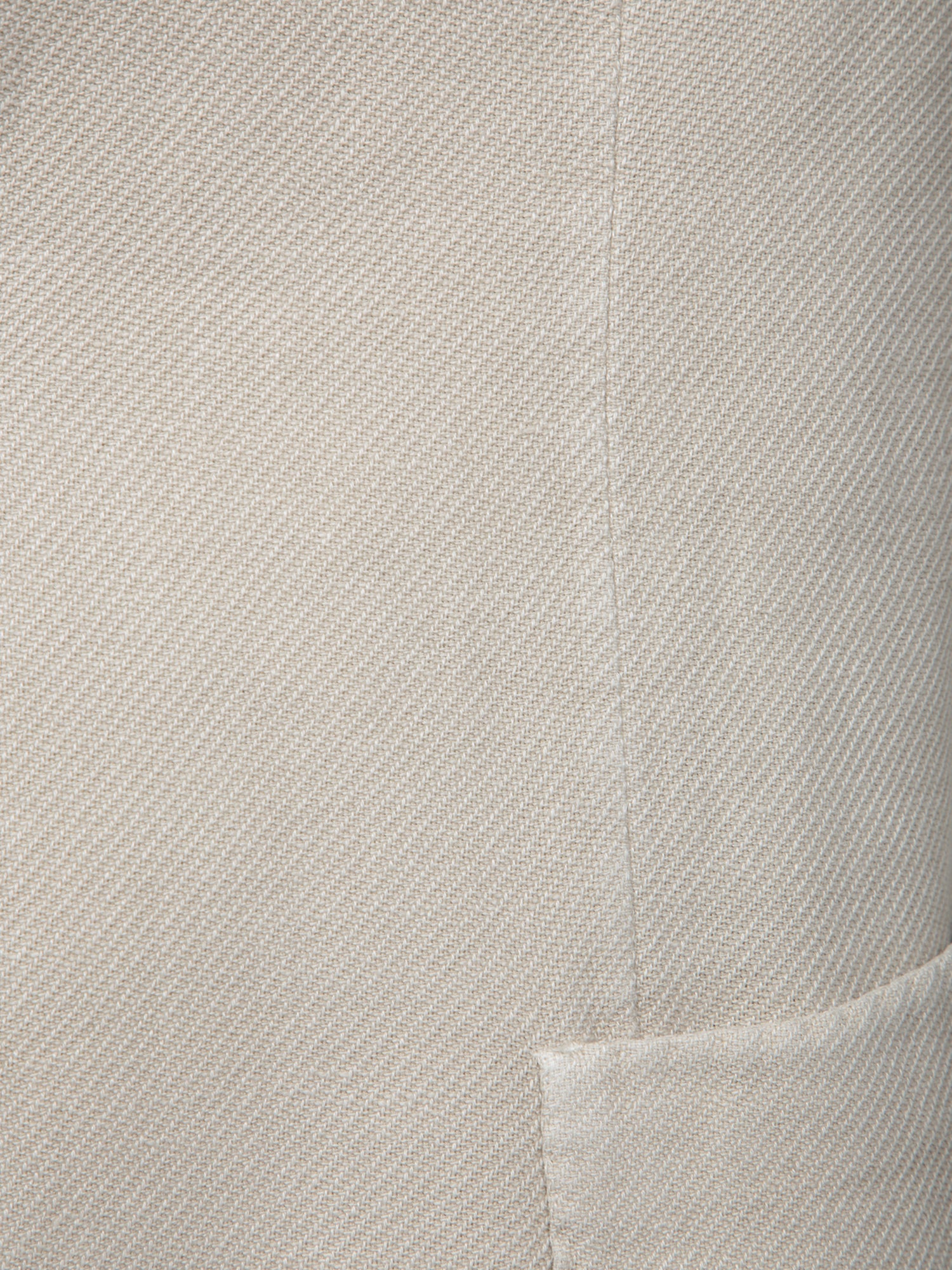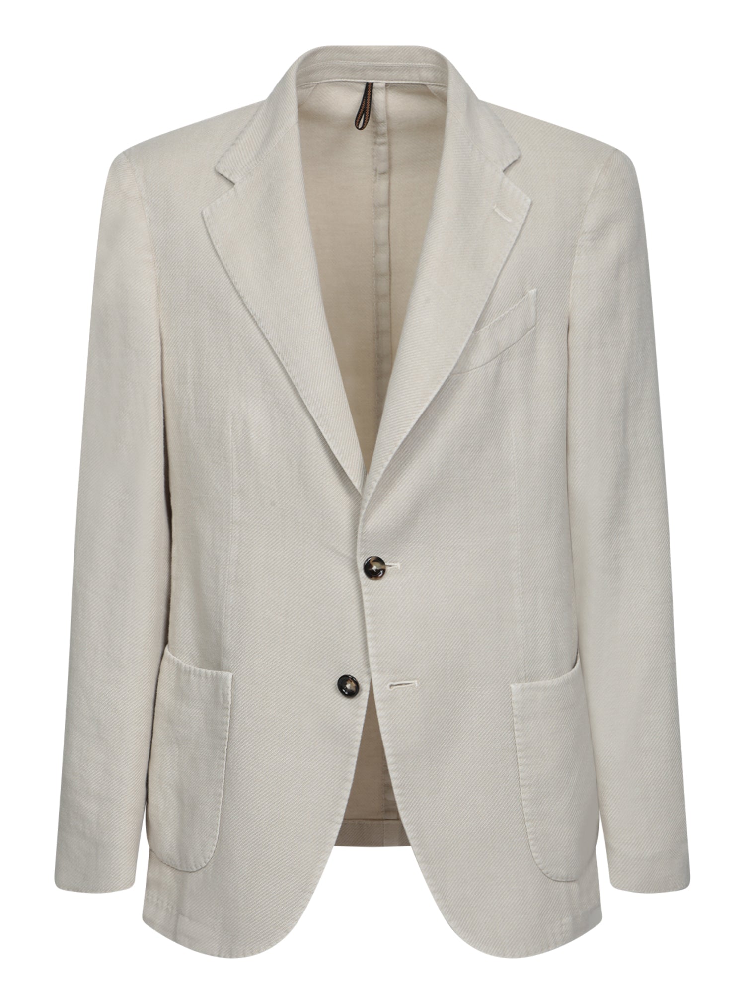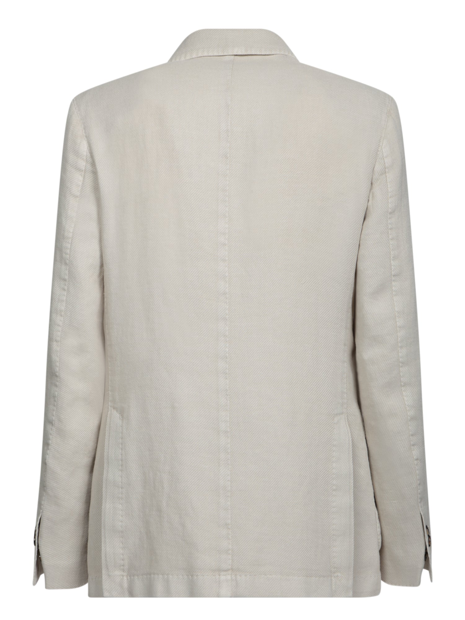 Elegant cream-colored linen and cotton jacket, featuring a subtle texture and refined details such as tailored cut and contrasting buttons.